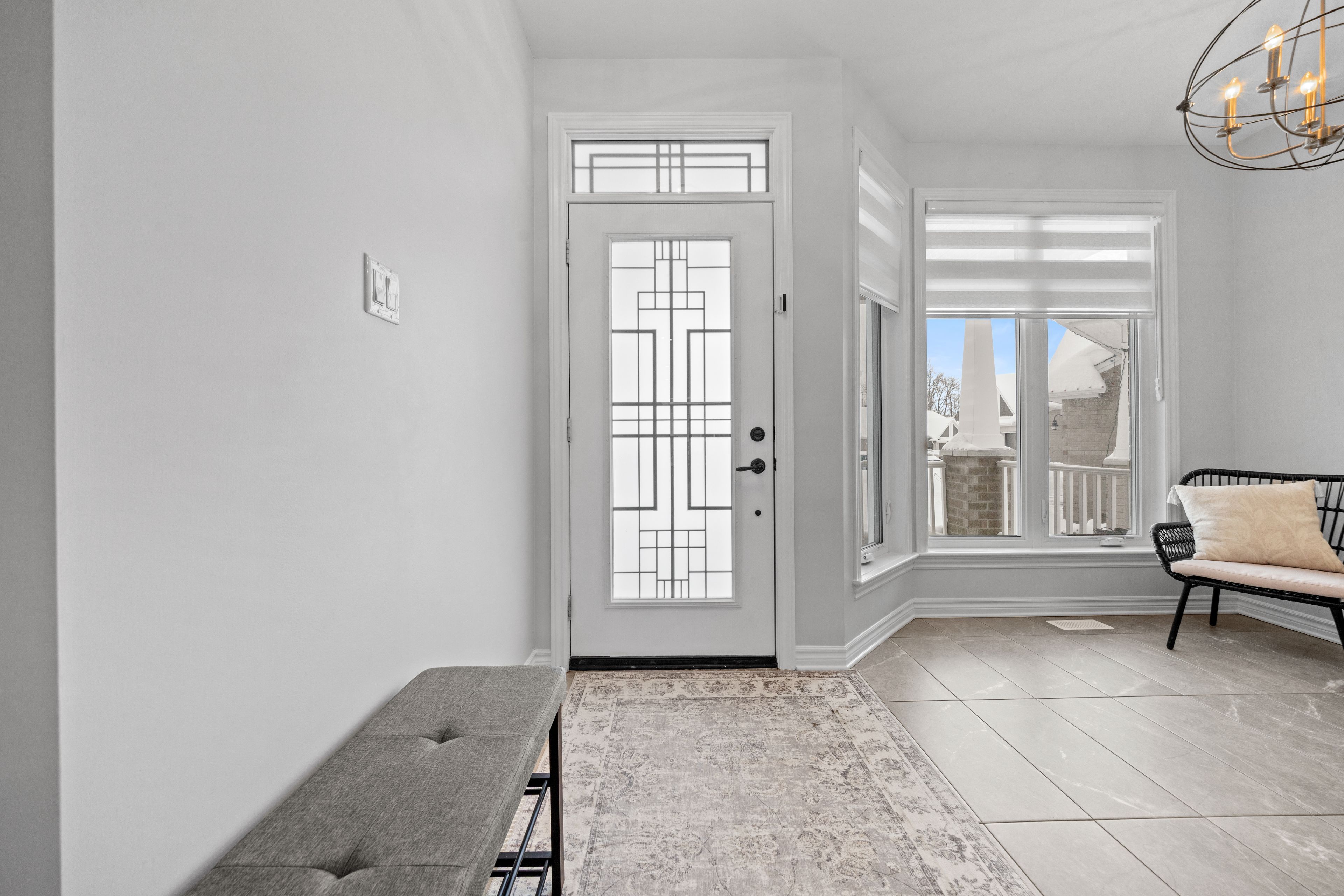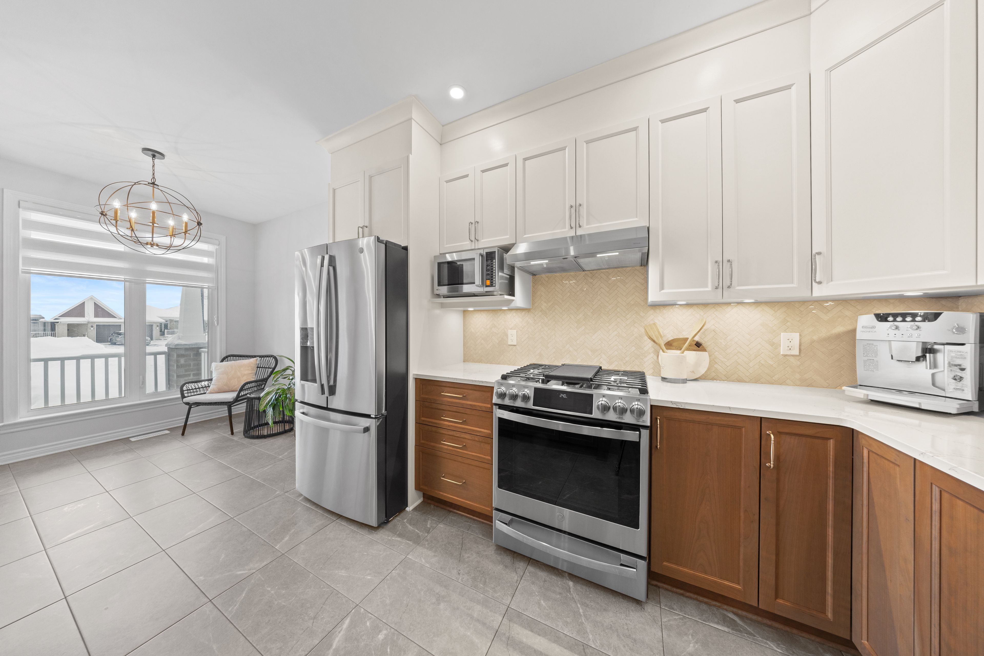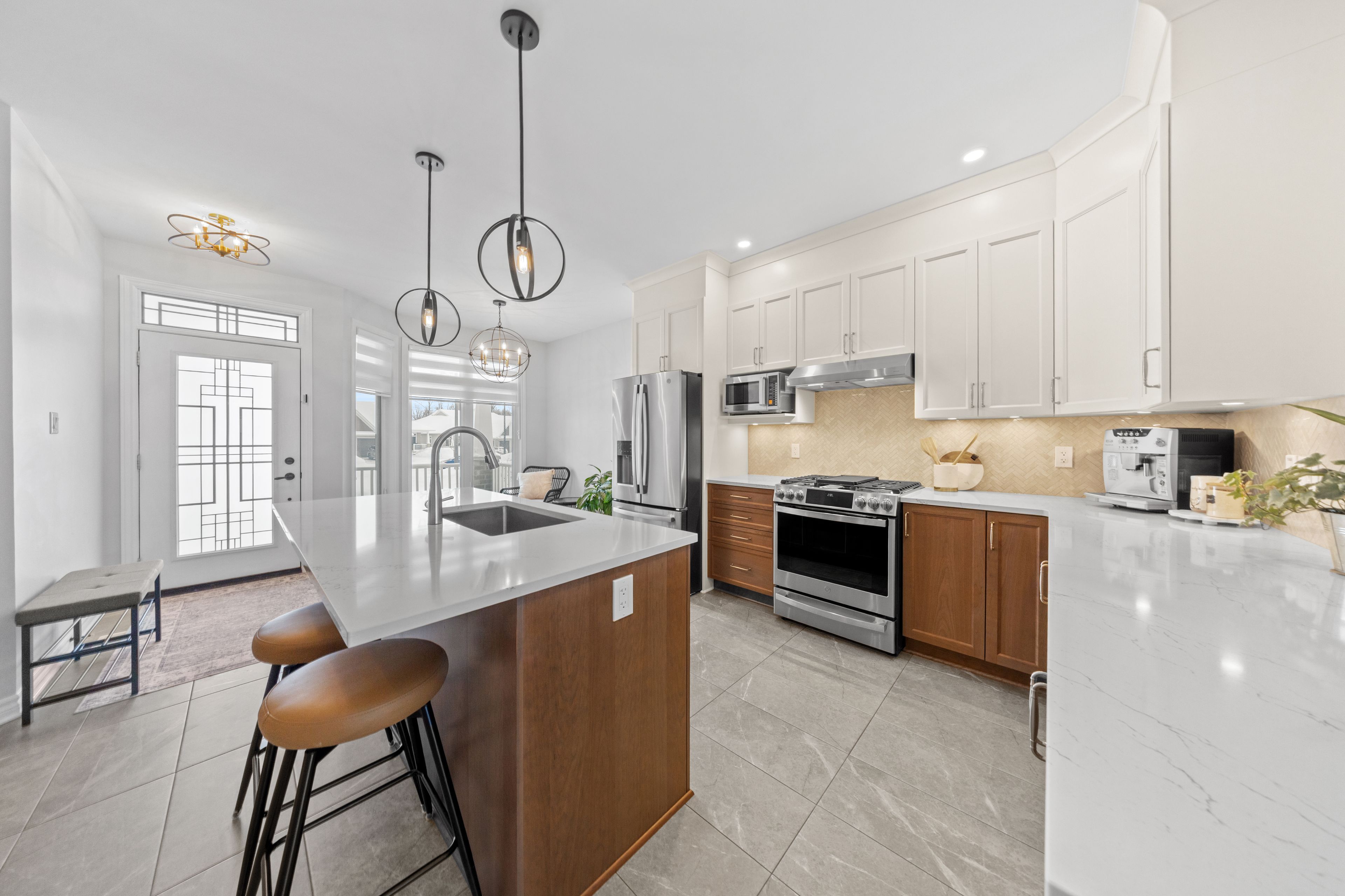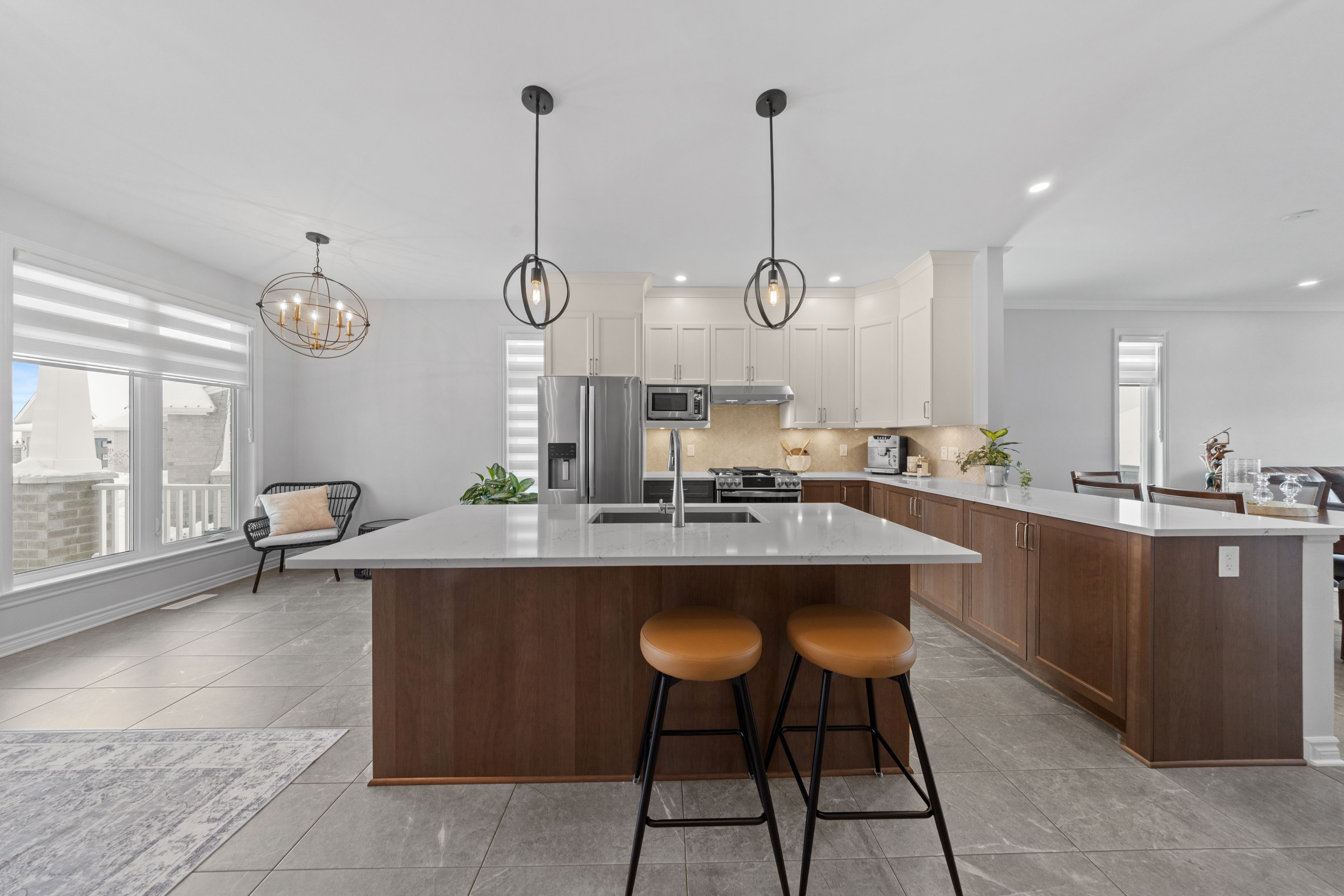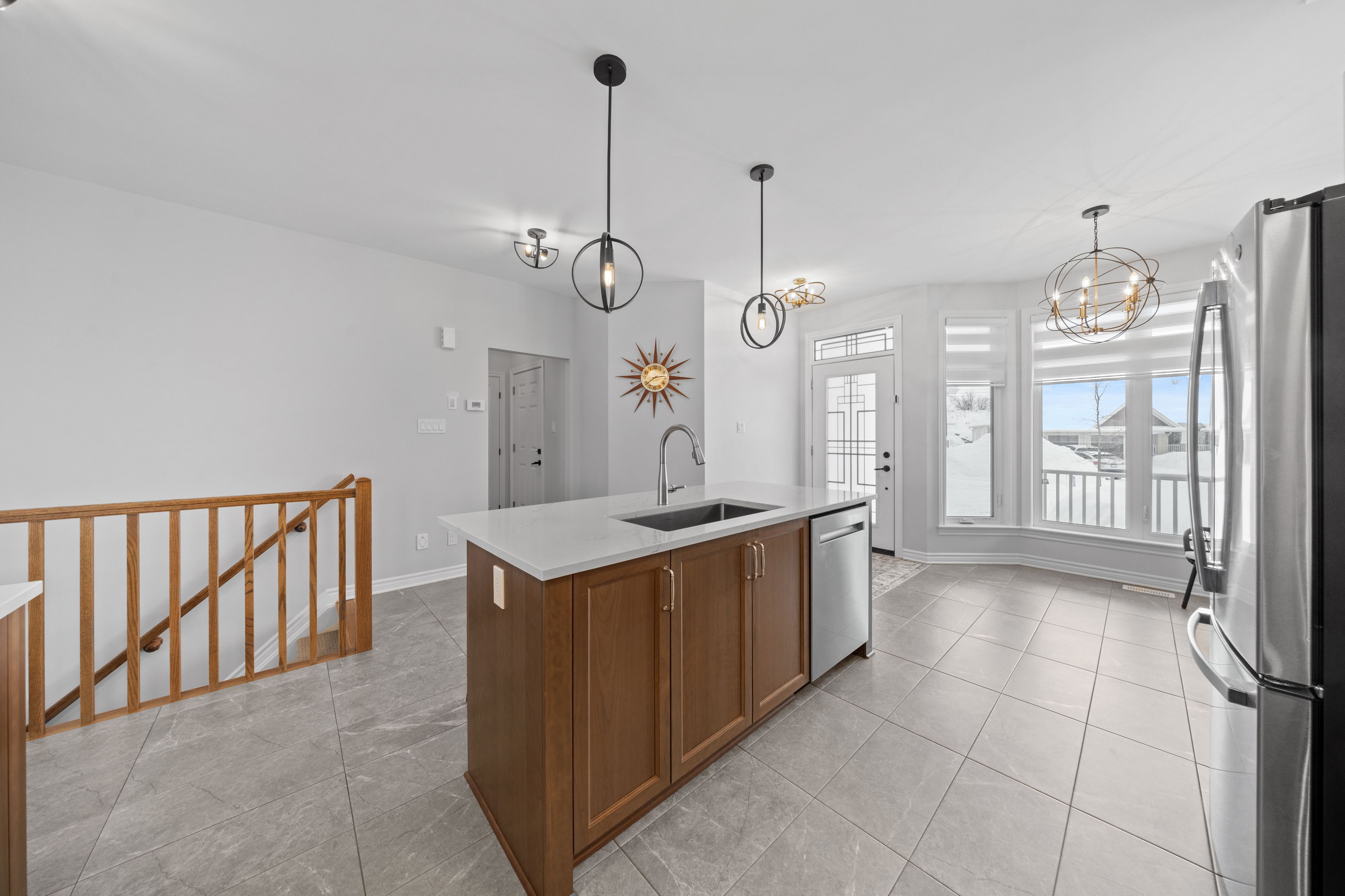 Welcome to cardinal creek village in orléans, a sought-after community by tamarack homes known for its scenic walking trails, rolling landscapes, and nearby water views. Located on a quiet court, this extensively upgraded semi-detached walkout bungalow offers exceptional design, functionality, and true move-in-ready living. Interlock walkway and extended driveway lead to a welcoming front veranda. The main level features full tile flooring throughout, including bedrooms, with flat ceilings, pot lights, crown moulding, and large windows creating a bright open-concept living and dining space. Patio doors from the living room lead to an elevated deck, ideal for enjoying evening sunsets. The upgraded kitchen offers ceiling-height cabinetry with two-tone finishes, custom fridge cabinetry, quartz countertops, extended island with breakfast bar, undermount sink, upgraded faucet, herringbone tile backsplash, gas stove, and detailed lighting. The primary bedroom includes a walk-in closet and upgraded 3-pc ensuite with quartz counters and double shower. Main level also features a 2-pc bath, walk-in pantry or optional laundry, and inside access to an oversized single-car garage. The finished walkout basement with high ceilings includes a second bedroom with walk-in closet, 5-pc bath with double sinks and quartz counters, separate laundry room, and rec room with french doors and wall-mounted fireplace. Patio doors lead to a private interlock patio. Plenty of storage. Enjoy access to community amenities including a clubhouse, tennis courts, parks, and scenic walking trails. Additional features include gas line for bbq, tankless hot water heater, air exchanger, extra kitchen outlets, dimmable pot lights, modern interior doors with matte black hardware, and oak staircase railing. A rare opportunity to own a premium, thoughtfully upgraded walkout bungalow in one of orléans' most desirable communities.