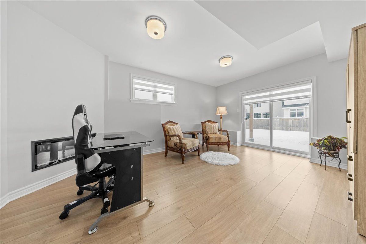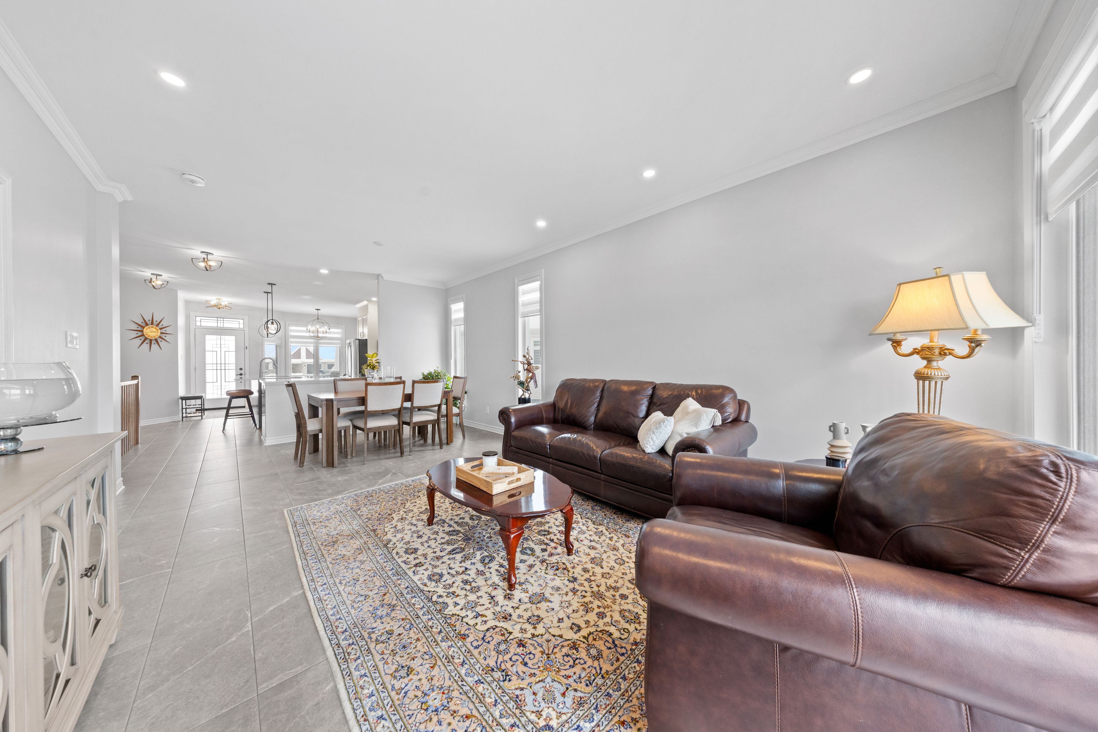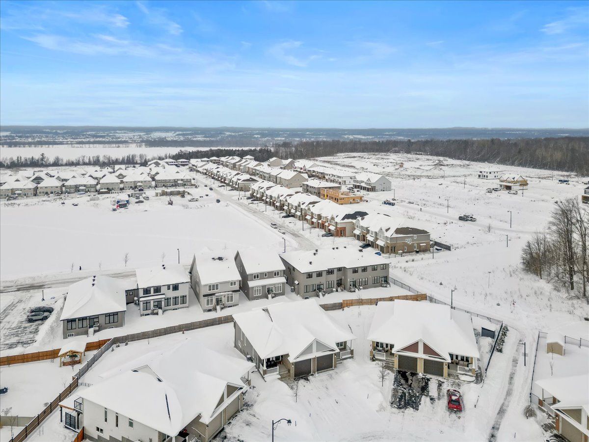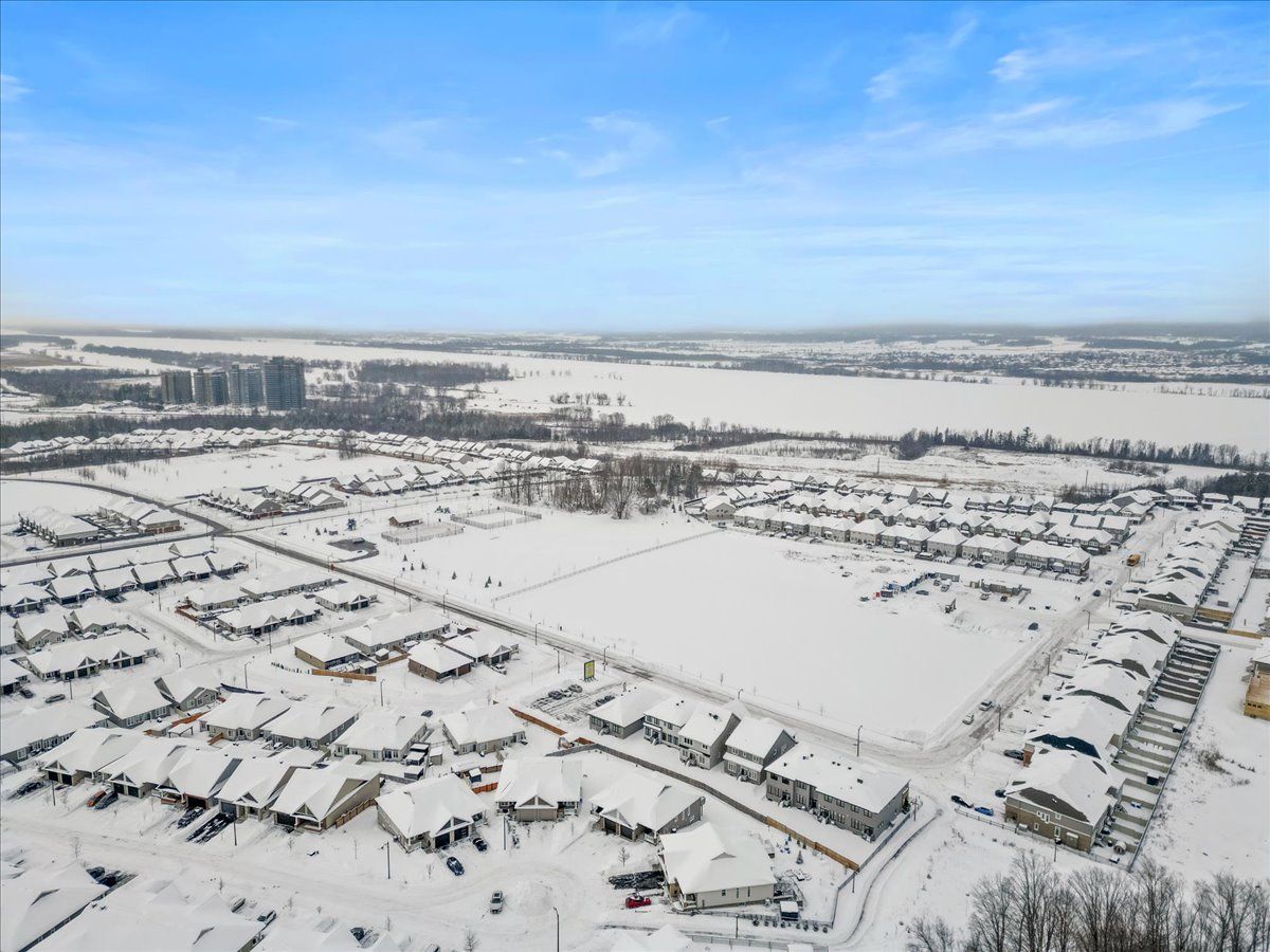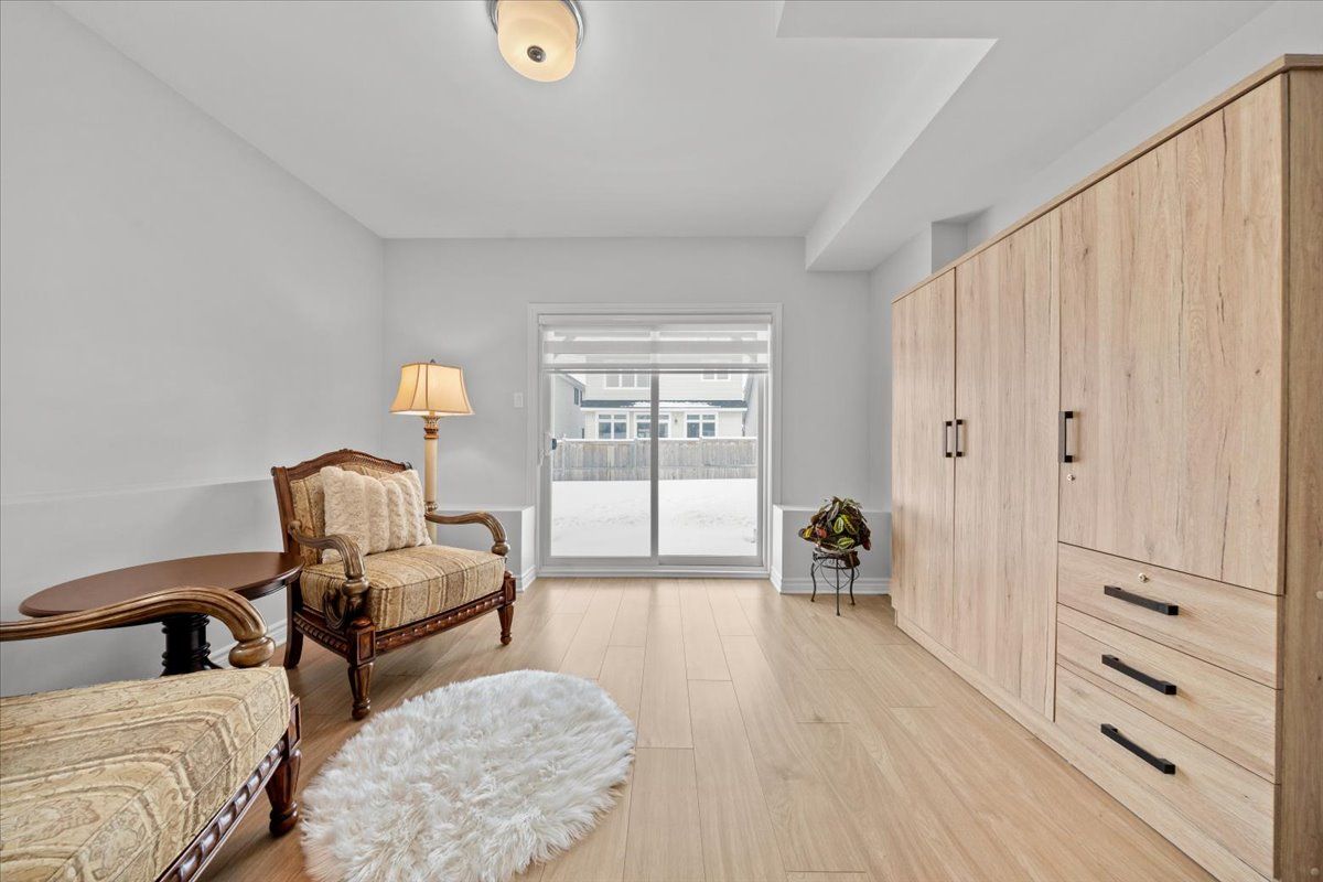 Welcome to cardinal creek village in orléans, a sought-after community by tamarack homes known for its scenic walking trails, rolling landscapes, and nearby water views. Located on a quiet court, this extensively upgraded semi-detached walkout bungalow offers exceptional design, functionality, and true move-in-ready living. Interlock walkway and extended driveway lead to a welcoming front veranda. The main level features full tile flooring throughout, including bedrooms, with flat ceilings, pot lights, crown moulding, and large windows creating a bright open-concept living and dining space. Patio doors from the living room lead to an elevated deck, ideal for enjoying evening sunsets. The upgraded kitchen offers ceiling-height cabinetry with two-tone finishes, custom fridge cabinetry, quartz countertops, extended island with breakfast bar, undermount sink, upgraded faucet, herringbone tile backsplash, gas stove, and detailed lighting. The primary bedroom includes a walk-in closet and upgraded 3-pc ensuite with quartz counters and double shower. Main level also features a 2-pc bath, walk-in pantry or optional laundry, and inside access to an oversized single-car garage. The finished walkout basement with high ceilings includes a second bedroom with walk-in closet, 5-pc bath with double sinks and quartz counters, separate laundry room, and rec room with french doors and wall-mounted fireplace. Patio doors lead to a private interlock patio. Plenty of storage. Enjoy access to community amenities including a clubhouse, tennis courts, parks, and scenic walking trails. Additional features include gas line for bbq, tankless hot water heater, air exchanger, extra kitchen outlets, dimmable pot lights, modern interior doors with matte black hardware, and oak staircase railing. A rare opportunity to own a premium, thoughtfully upgraded walkout bungalow in one of orléans' most desirable communities.