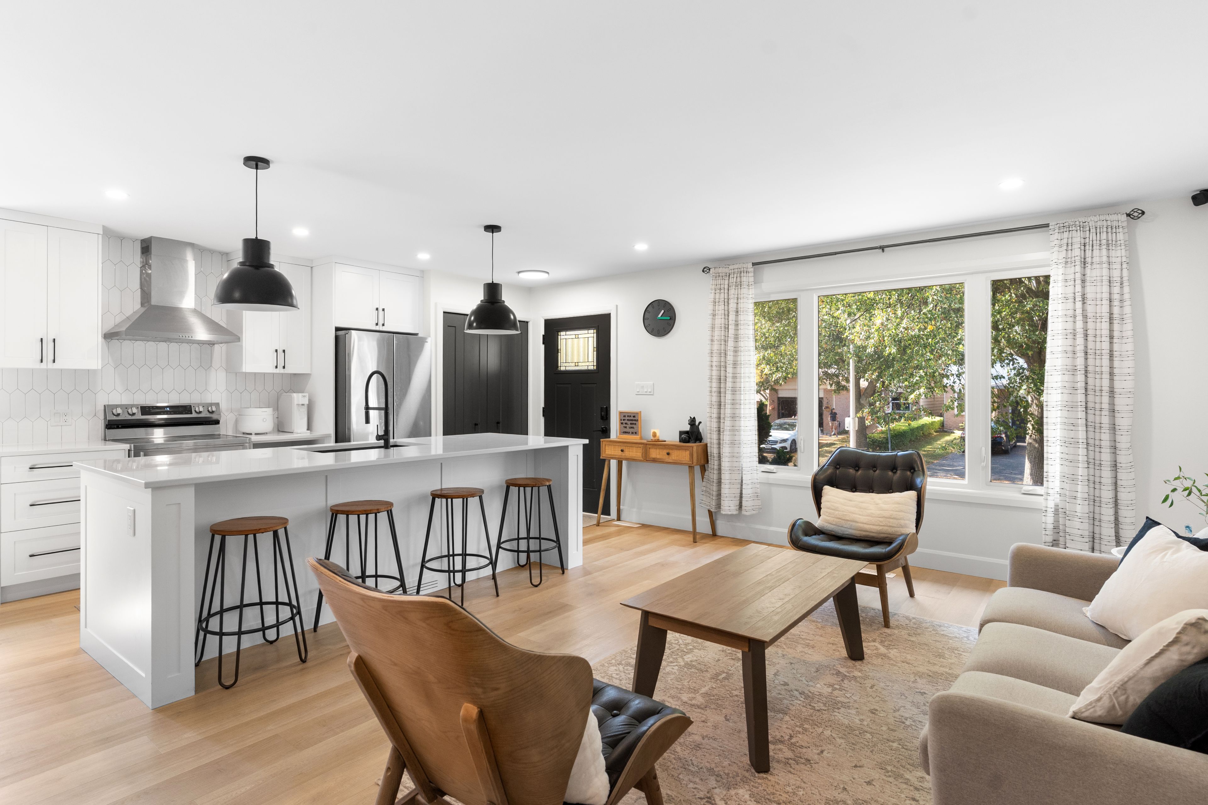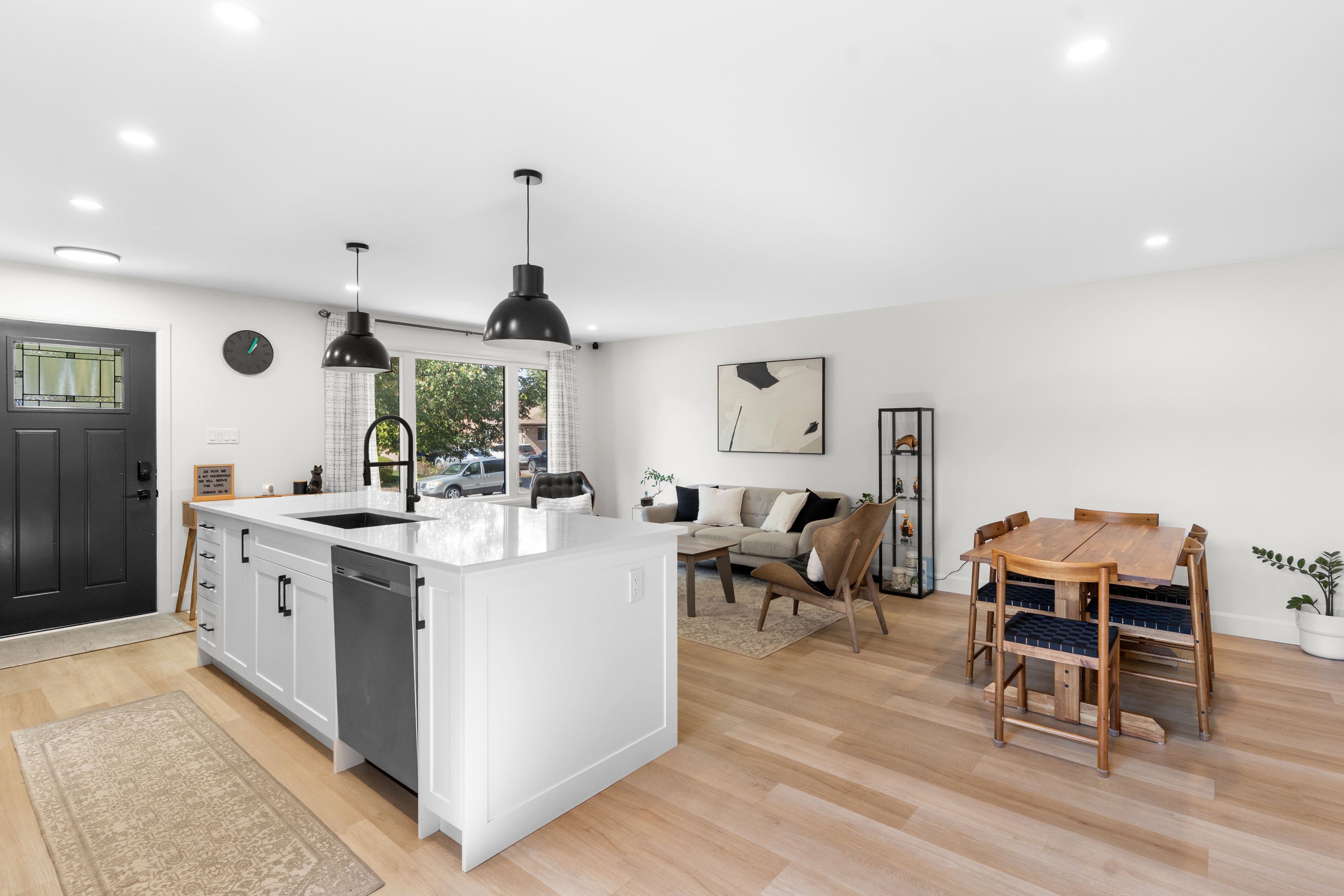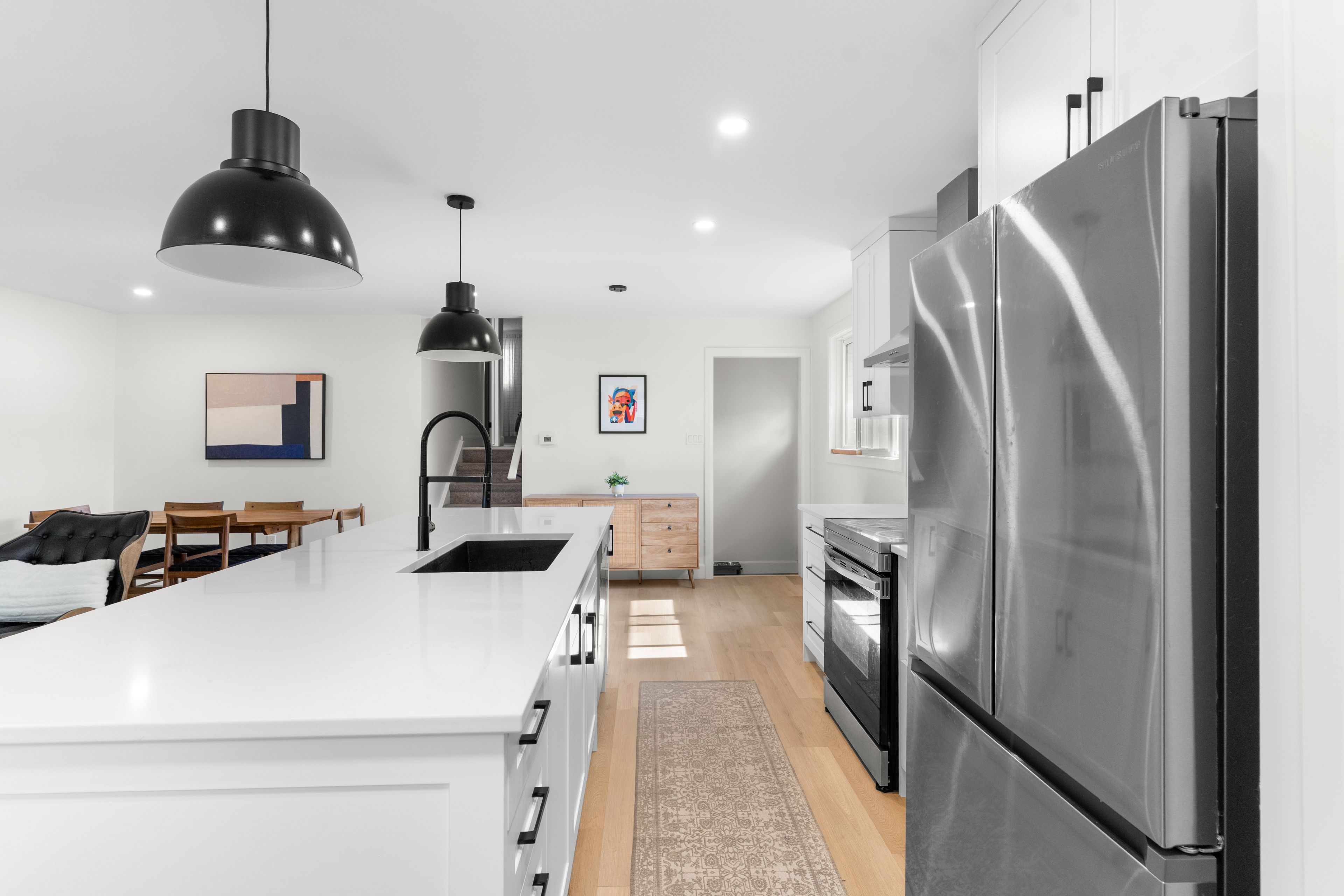 • Open concept kitchen with a large quartz island and stainless steel appliances.