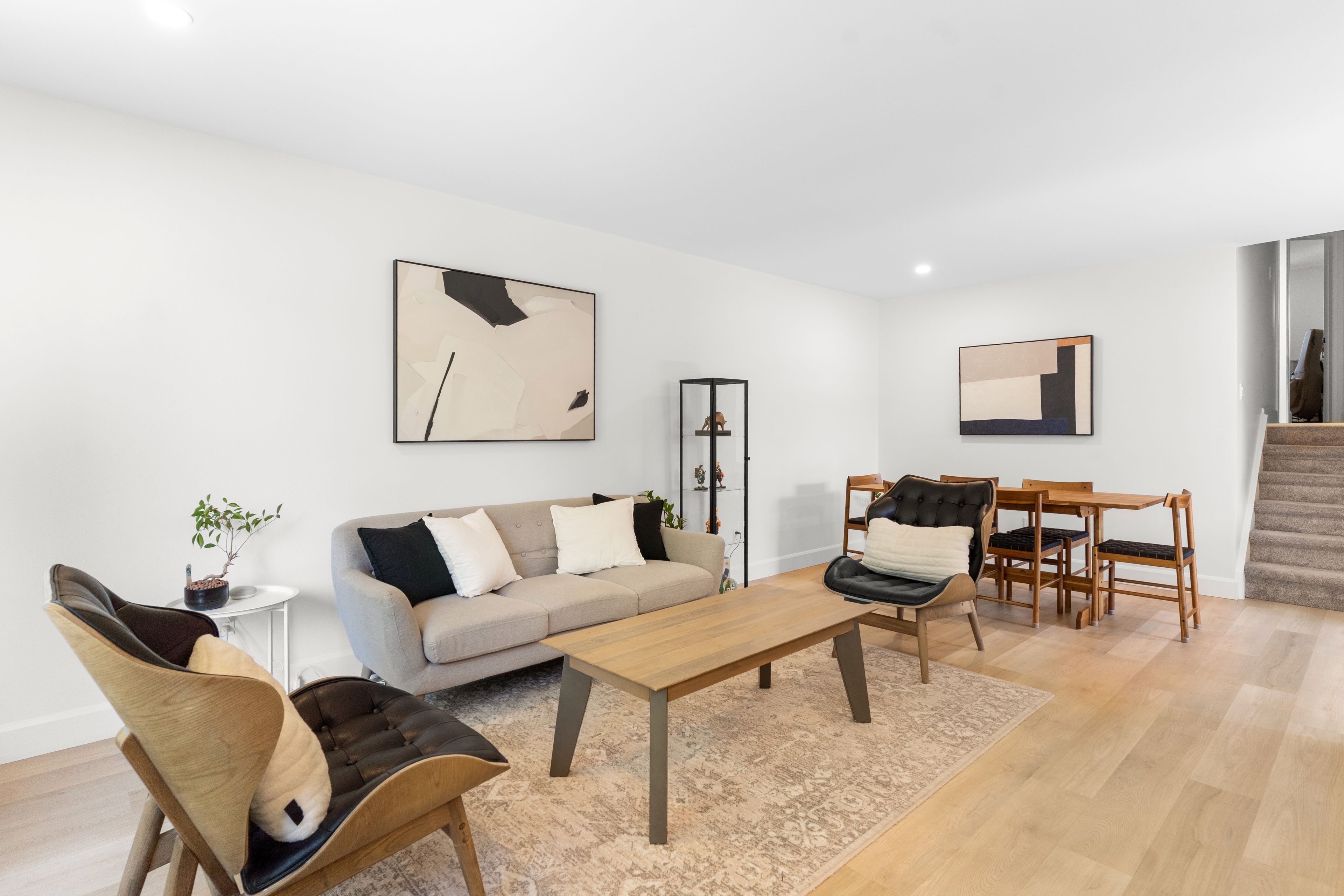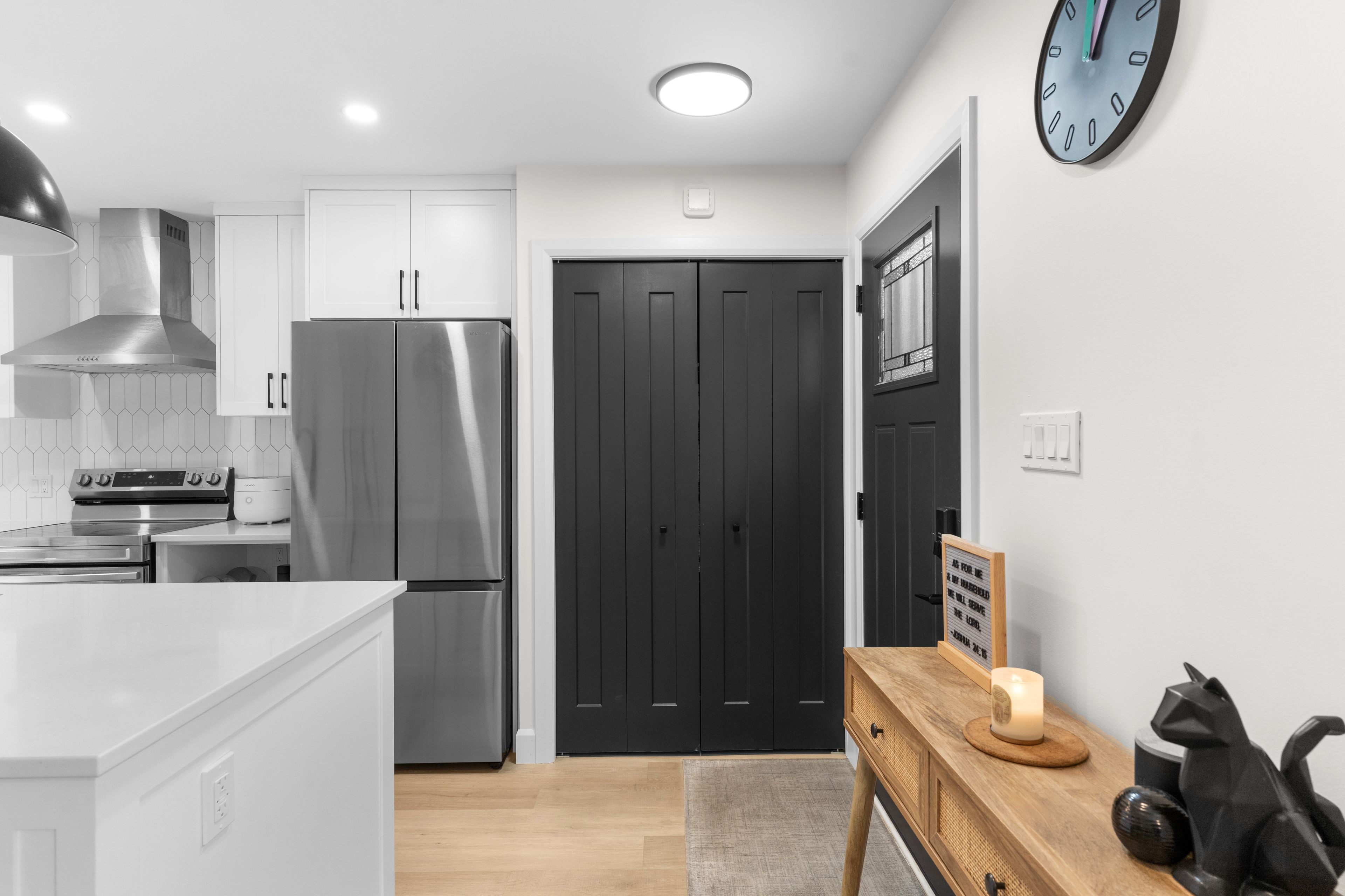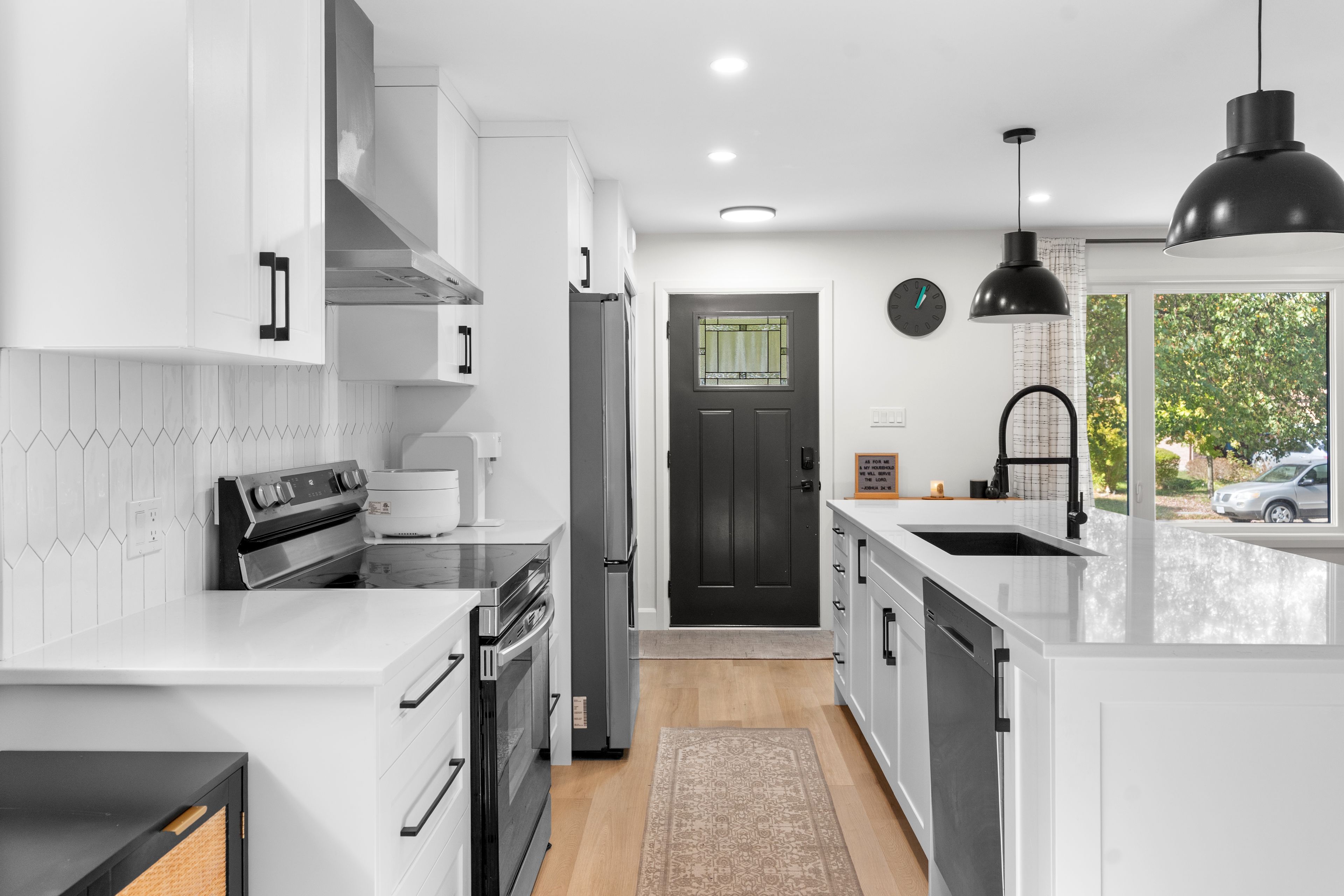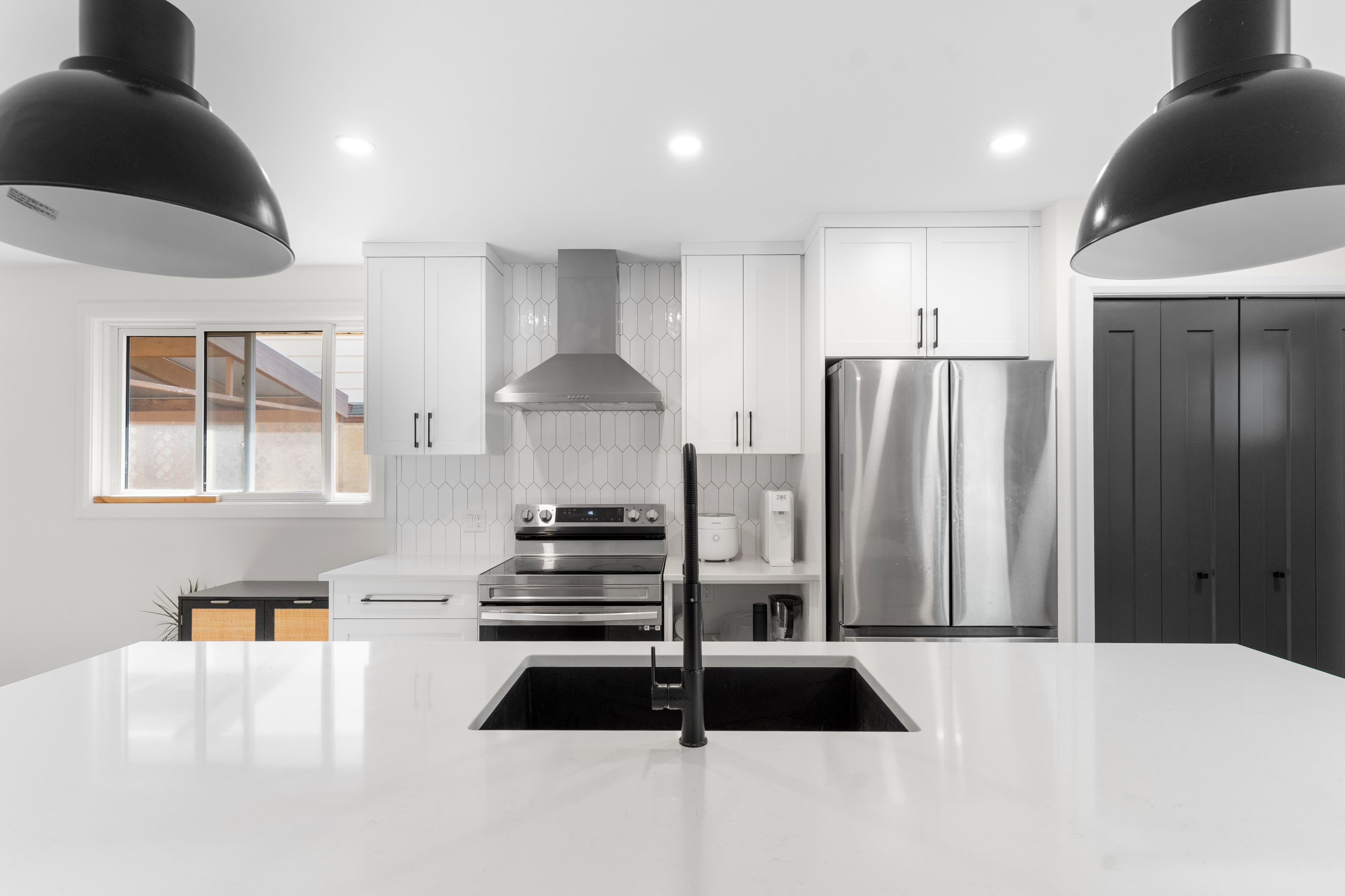 • Open concept kitchen with a large quartz island and stainless steel appliances.