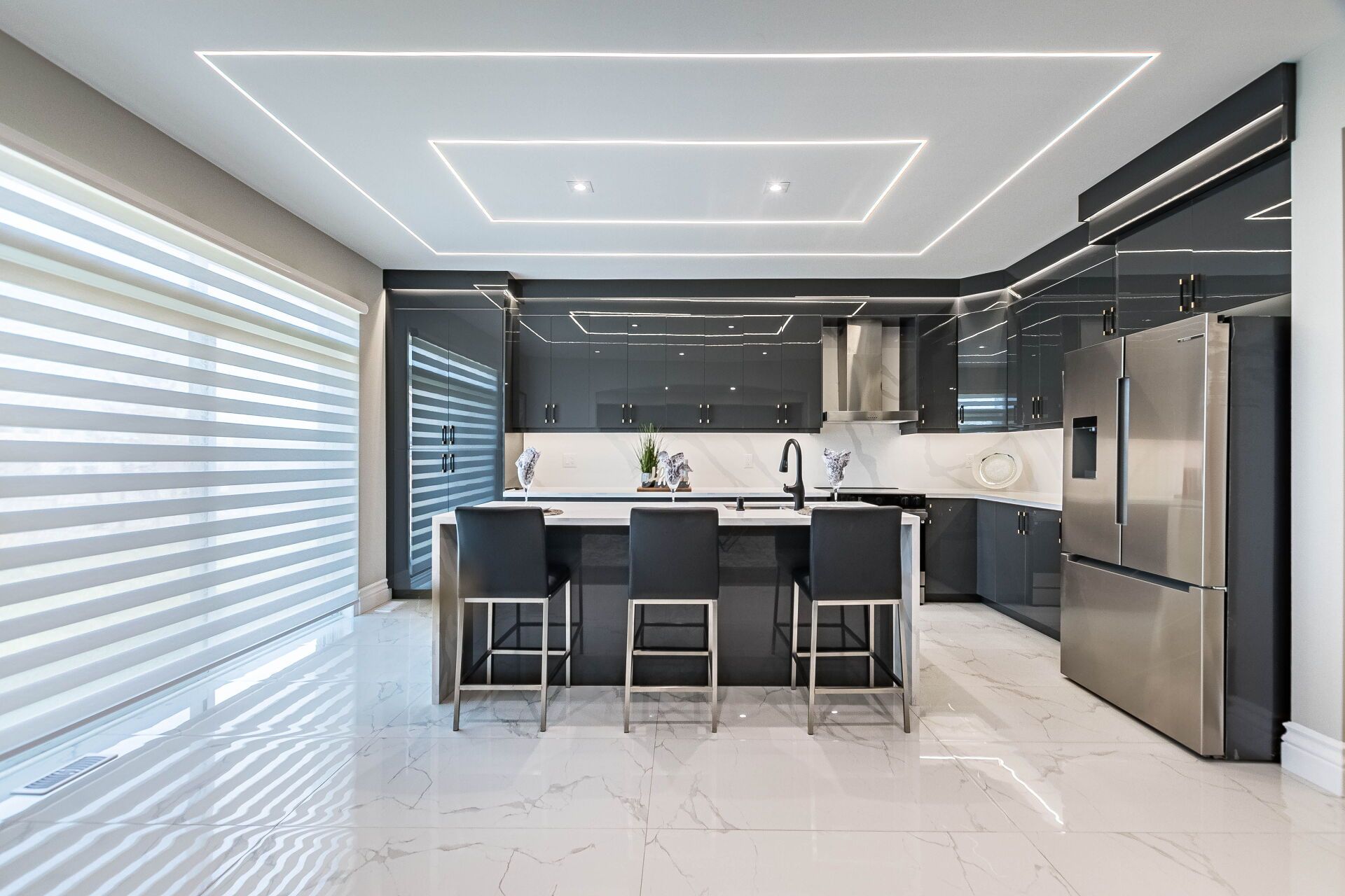 • Spacious chef's kitchen with a huge center island and elegant lighting.