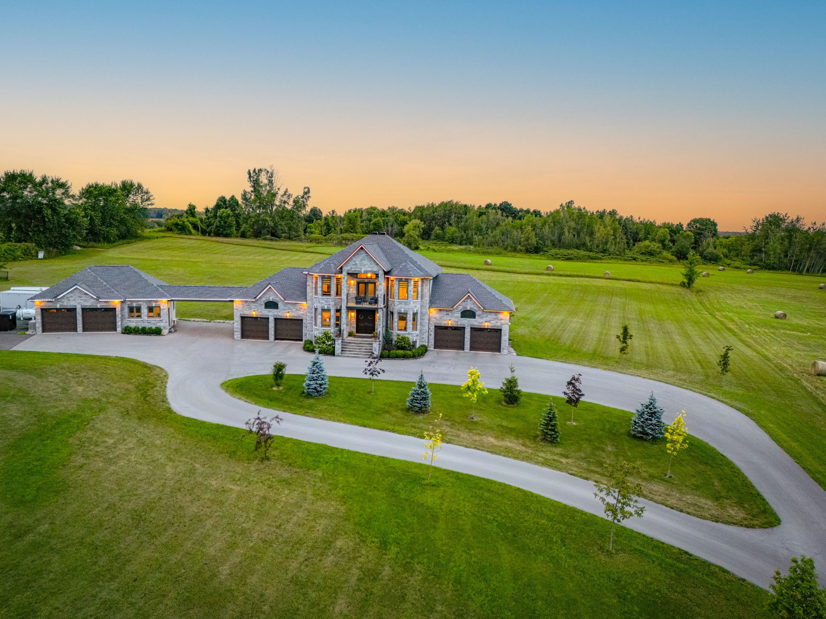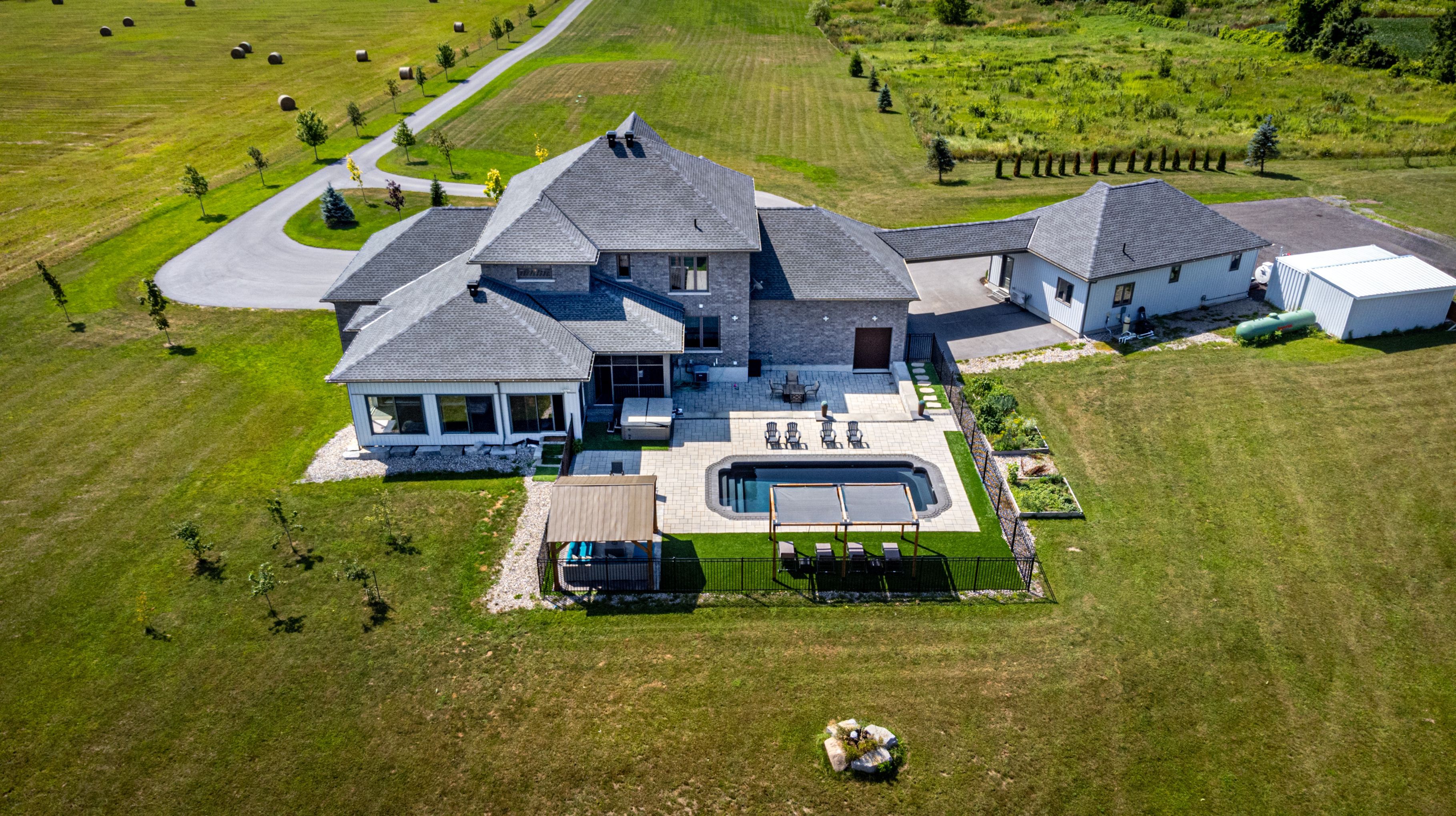 Welcome to your dream retreat in glenburnie-an exquisite custom home by legacy fine homes, nestled on 7 rolling acres of lush countryside. Through electronic gates and up the private asphalt drive, this majestic property reveals itself with two attached 2-car garages and a detached 2-car garage featuring a built-in office. Inside, luxury meets thoughtful design. The main floor offers a sun-filled living room with fireplace and walk-out to the sunroom, an elegant dining room, and a gourmet kitchen with quartz countertops, waterfall breakfast bar (seats 6), high-end appliances, and walk-out to an enclosed bbq area. A main floor bedroom, stylish 3-piece bath, office, and mudroom complete the level. Upstairs, the primary suite impresses with two walk-in closets and a spa-inspired 5-piece ensuite. Two additional bedrooms share a semi-ensuite 3-piece bath with dual vanities, and the laundry room adds convenience and charm. The lower level features a spacious family room, gym with walk-out to the garage, a 4-piece bath, and a fifth bedroom-ideal for guests or extended family. Step outside to an entertainer's paradise: inground pool, hot tub, fire pit, stone patio, and pergolas-all surrounded by serene fields and quiet country air. Just 6 minutes to hwy 401 and 15 minutes to downtown kingston's shops, dining, and entertainment.