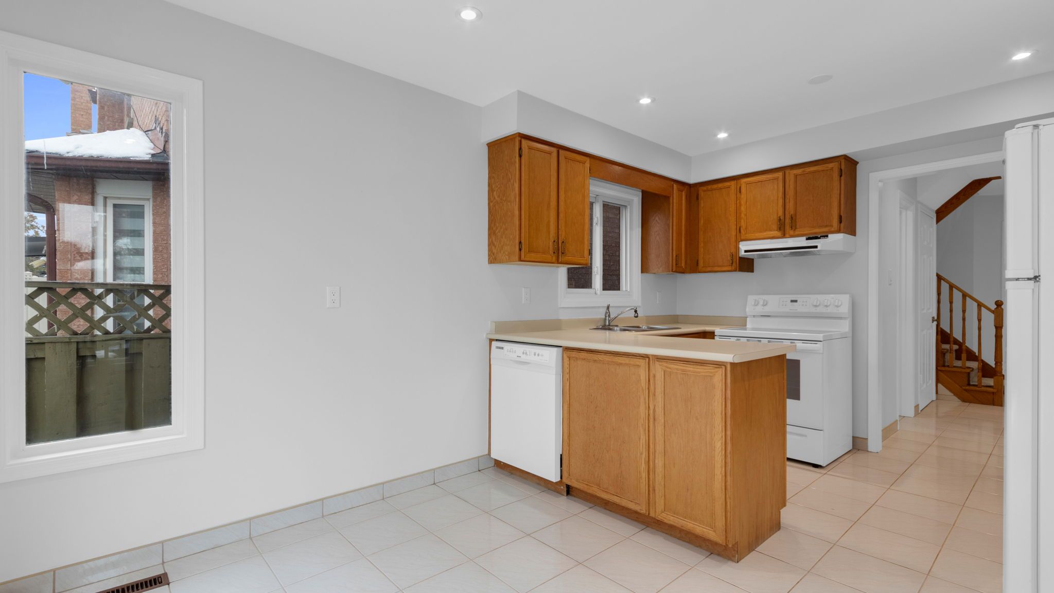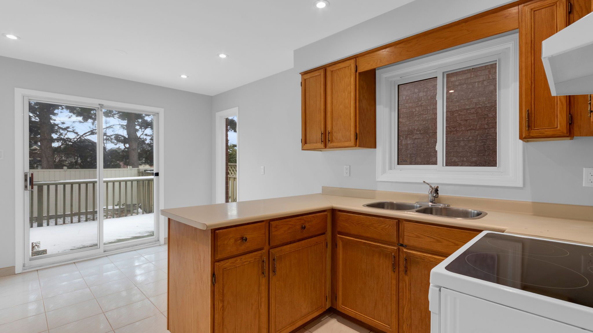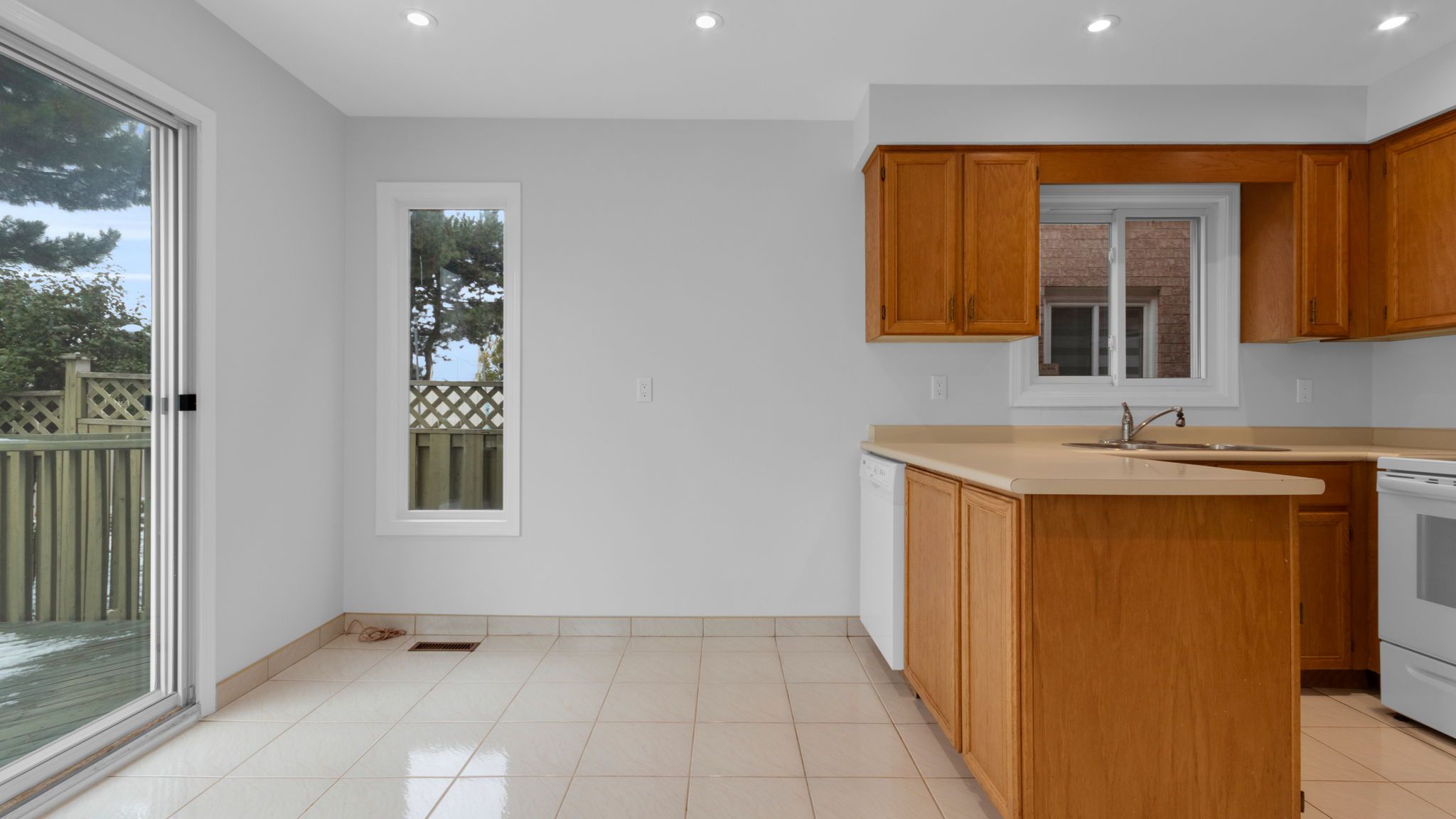 • Modern kitchen connects to a private treed backyard with a spacious deck.