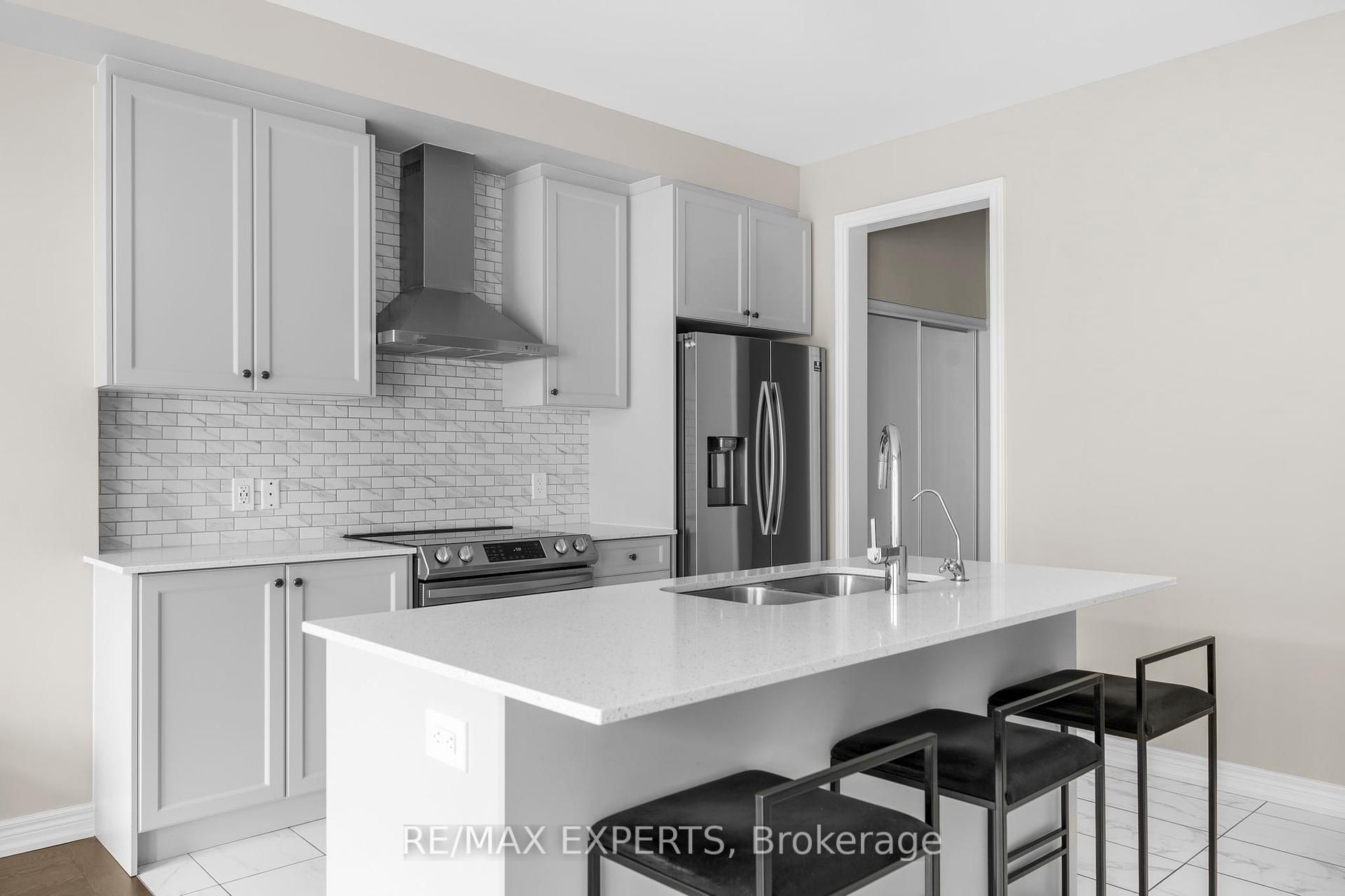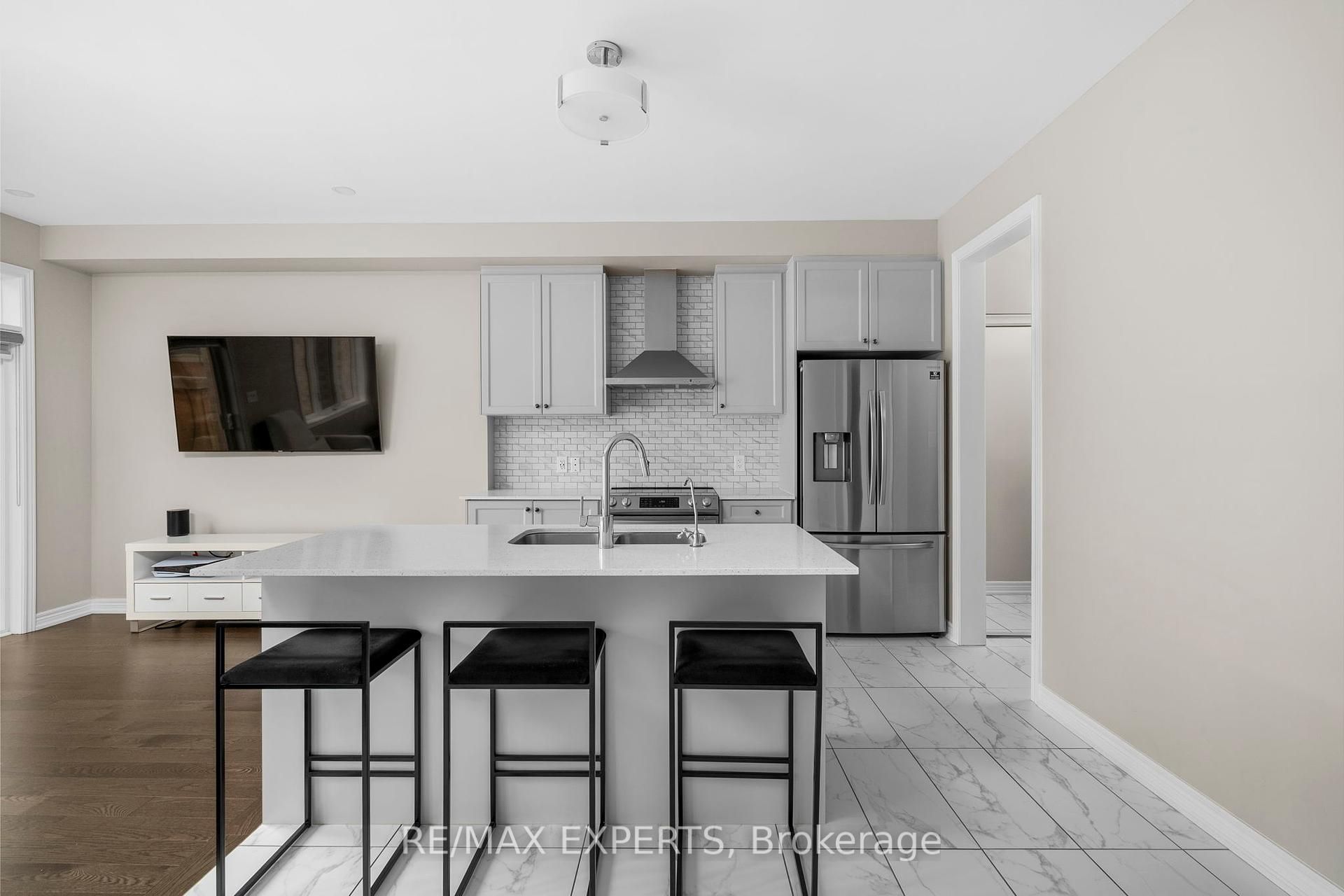 • Main floor features modern kitchen with oversized island and stainless steel appliances.