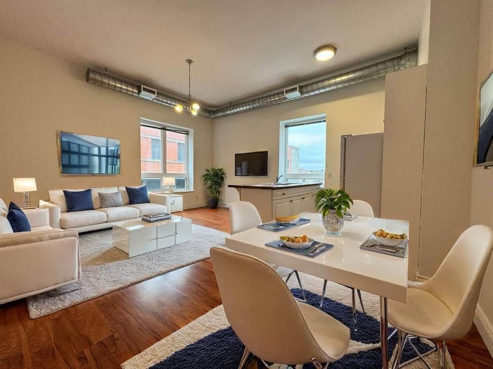 • Stylish industrial-style condo with soaring ceilings and large downtown views.