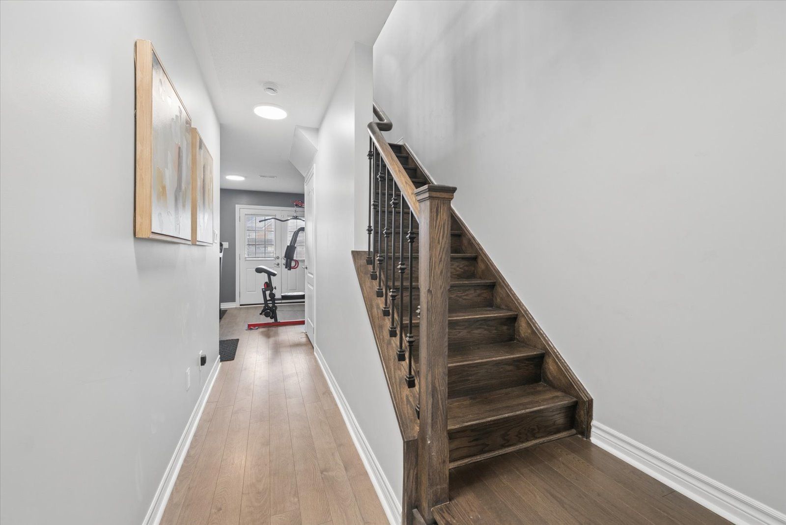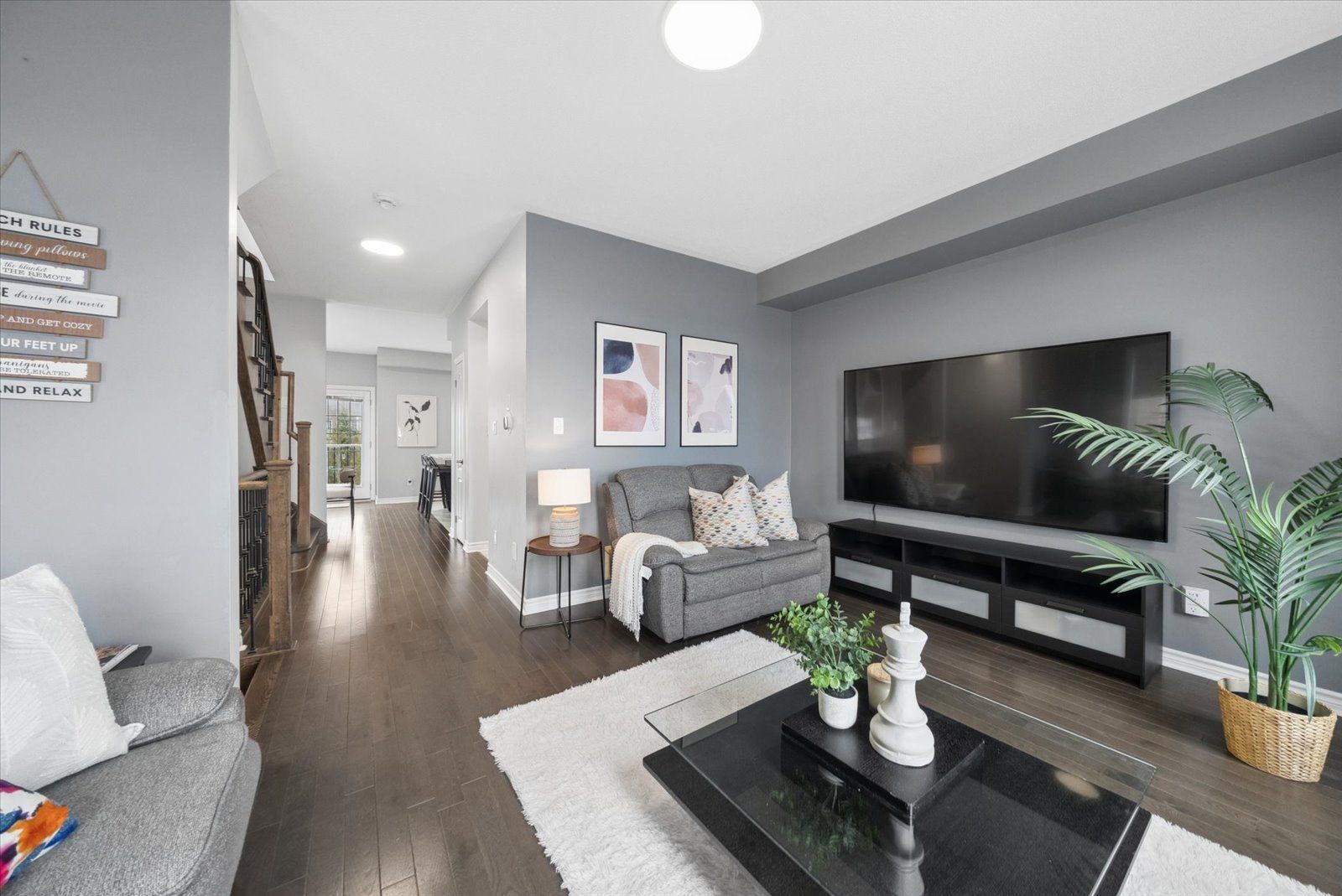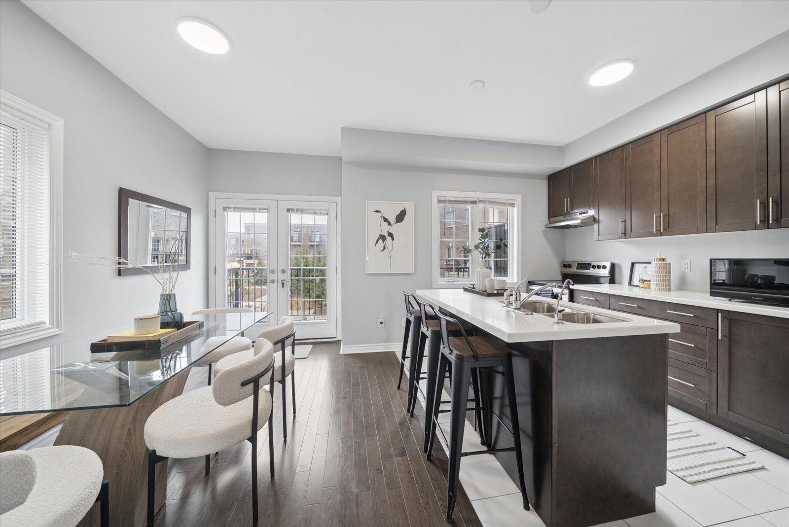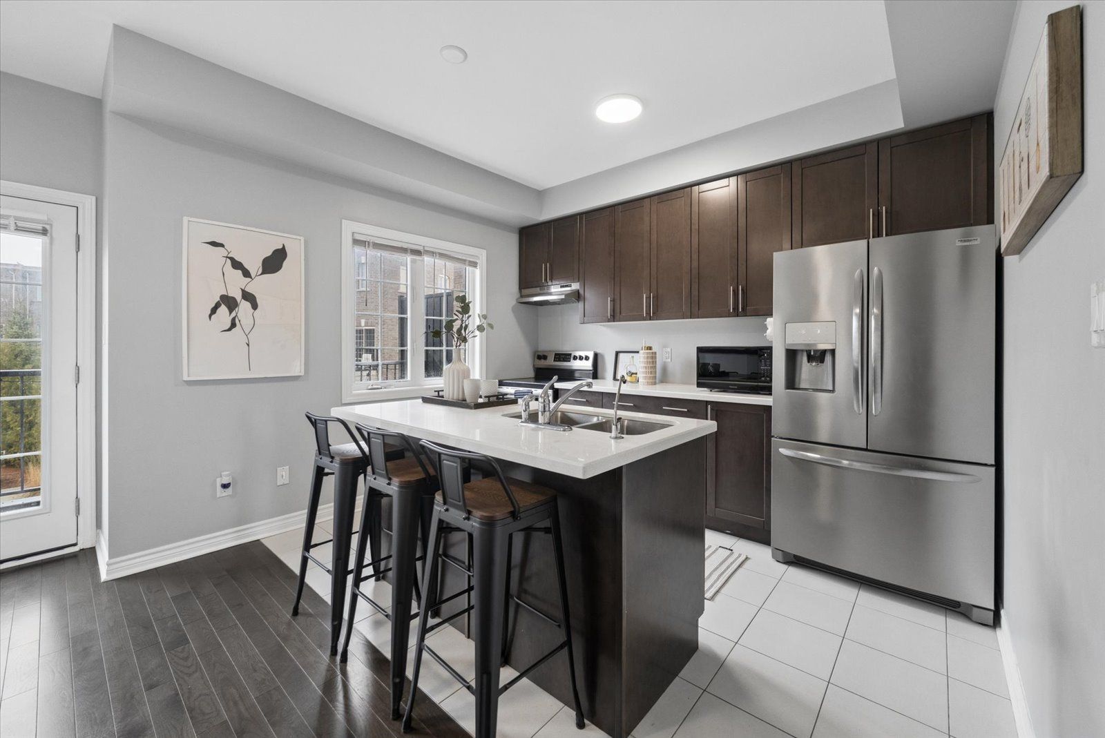 Step into your next home, a desirable end unit where the ground level features a versatile den-perfect as a home office, gym, or rec room-complete with a 2-piece bath and a walkout to green backyard oasis. A hardwood staircase leads you to the bright and spacious main living area, filled with natural light, a convenient laundry area, and a 2-piece powder room. The well-designed kitchen offers quartz countertops, a centre island with breakfast bar, and stainless steel appliances, seamlessly flowing into the dining area with a walkout to the balcony through patio doors. The top floor features three generously sized bedrooms with cozy broadloom, including a primary suite with a private 3-piece ensuite and a spacious closet. An additional 4-piece bathroom completes this level-perfect for a growing family or first-time buyers. Don't miss this opportunity!