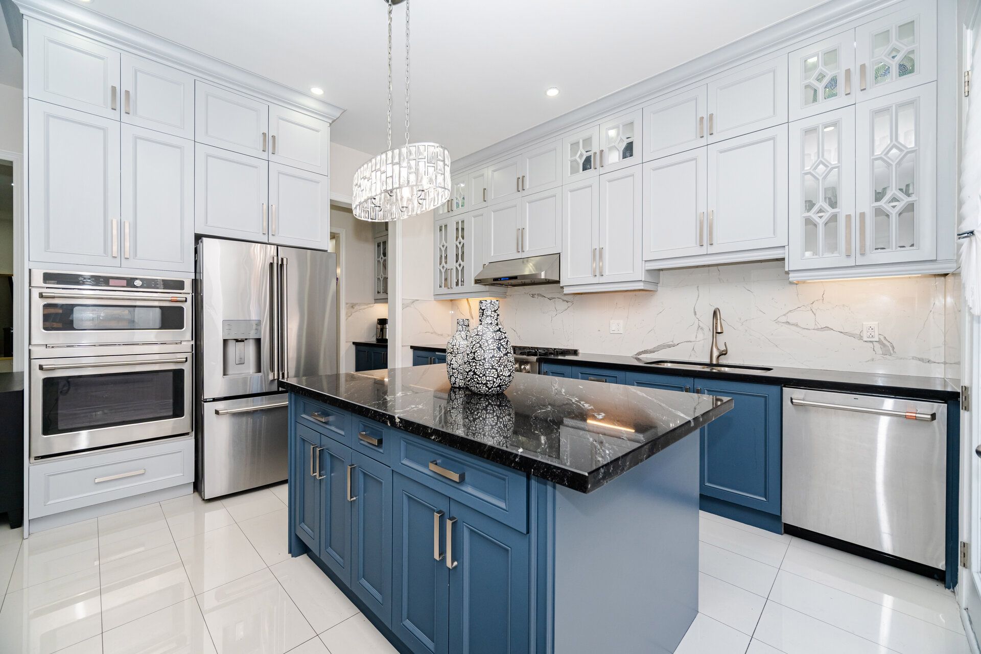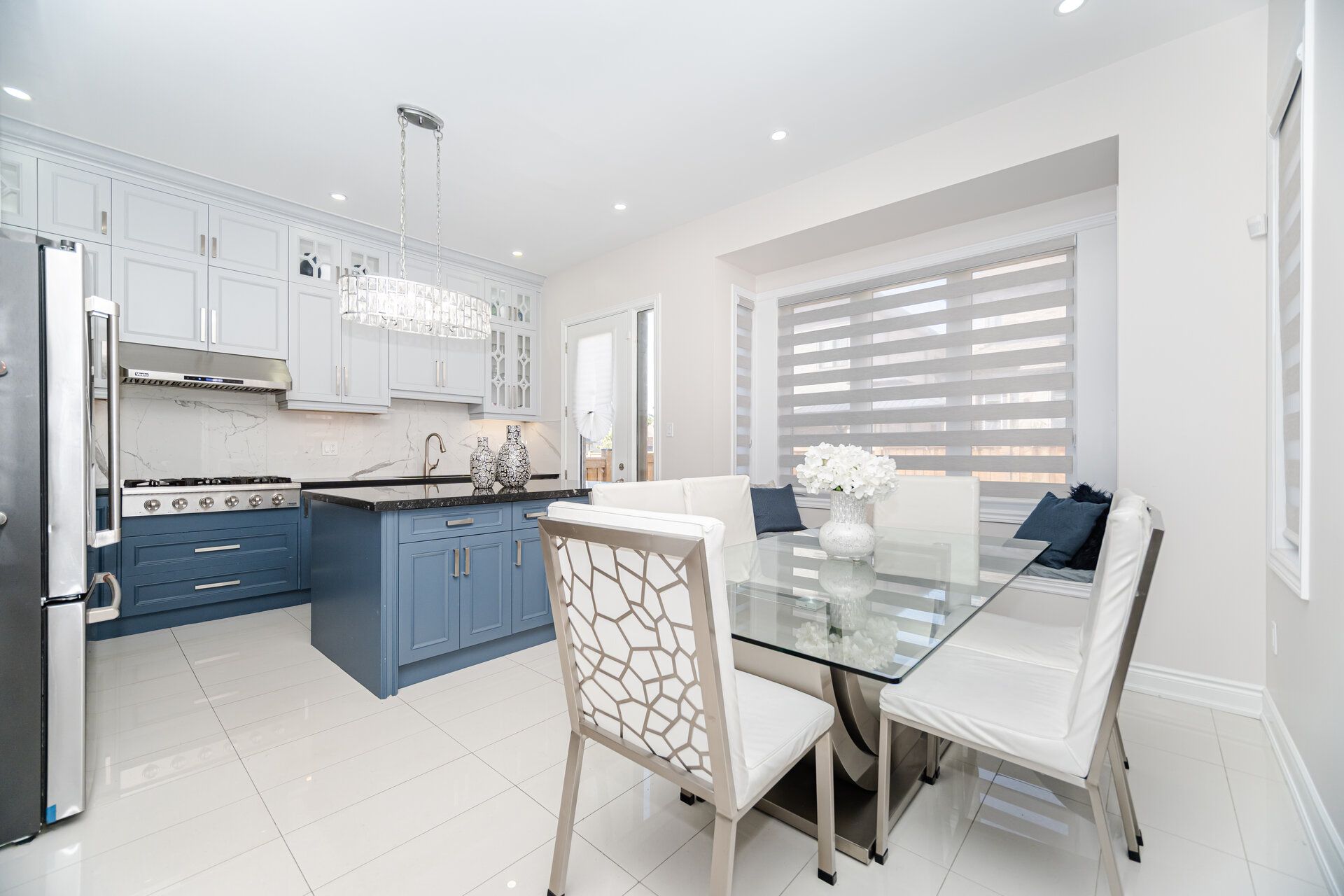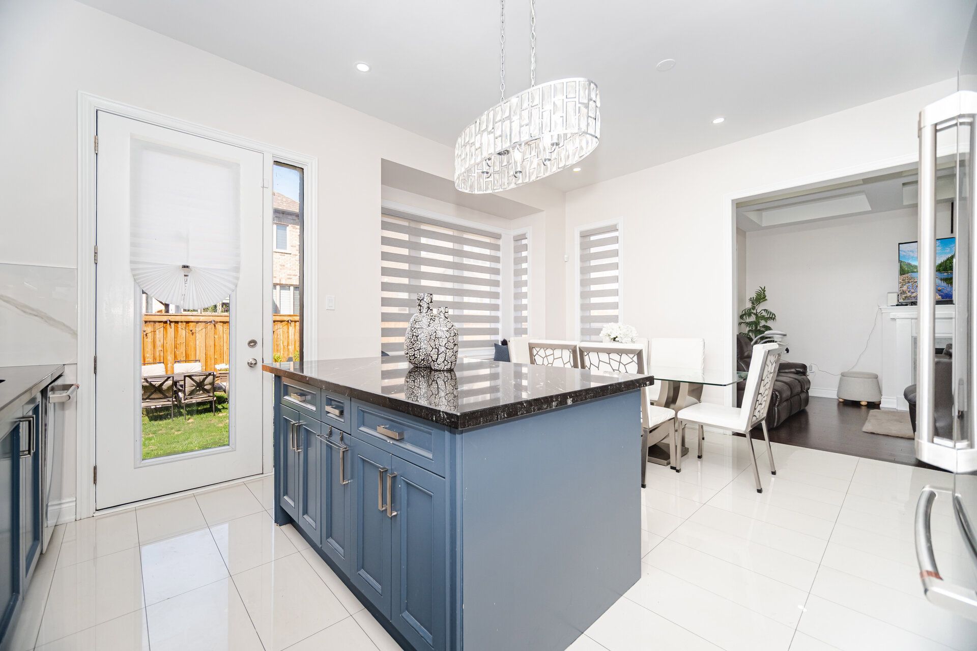 • Custom kitchen with stainless steel appliances and breakfast area.