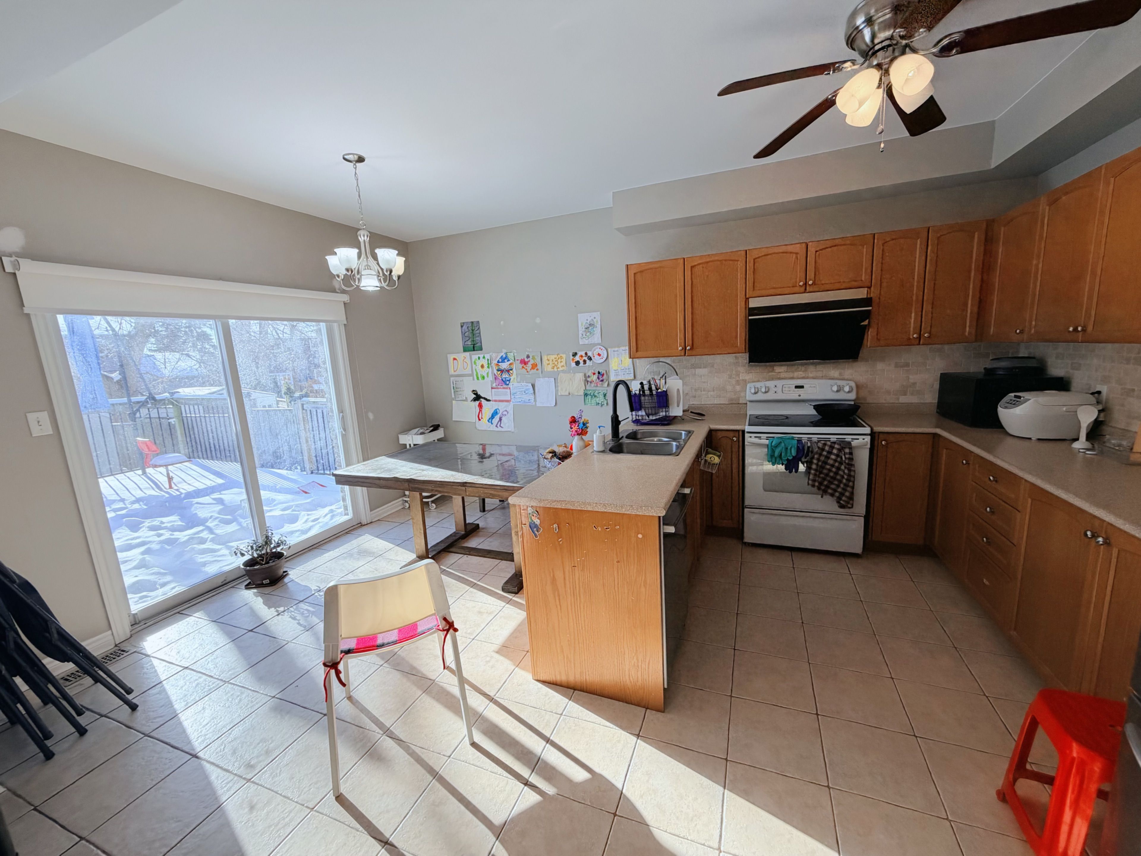 • Large backyard surrounded by mature trees, offering privacy and nature.