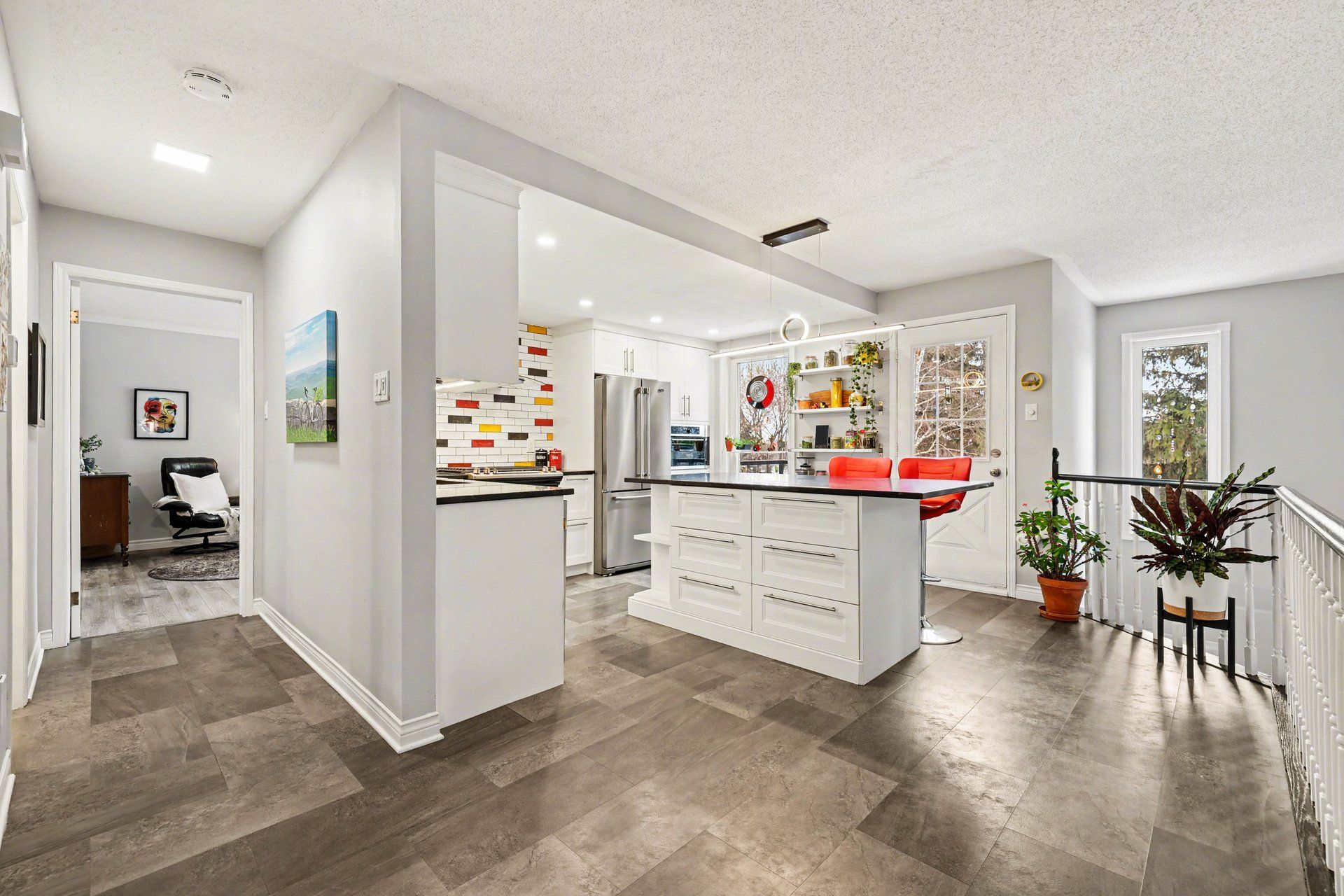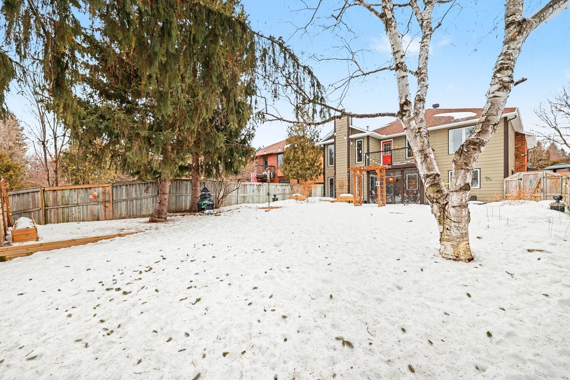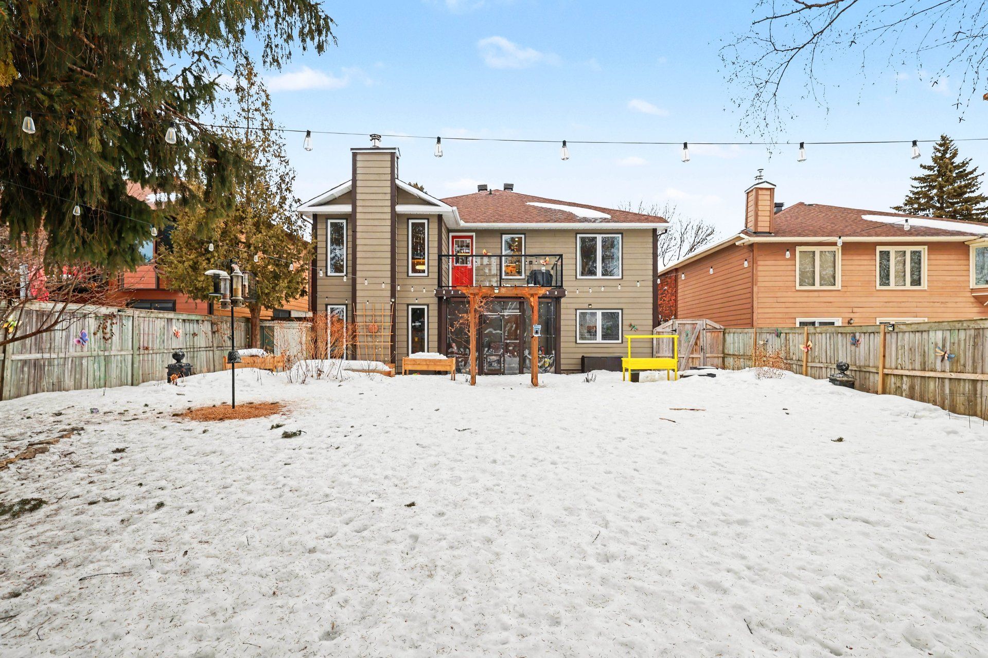 Fully renovated bungalow with walkout basement located in a mature neighbourhood with no rear neighbours. The backyard is a private oasis with mature trees and established gardens, creating a peaceful setting. The main floor is bright and welcoming with a spacious living and dining area finished with high-end vinyl flooring throughout - no carpeting. The fully renovated kitchen (2020) features quartz countertops, spanish tile backsplash, stainless steel appliances, a large island and breakfast bar, and direct access to a raised deck overlooking the backyard-perfect for entertaining or relaxing outdoors. The primary bedroom is generously sized and includes a walk-in closet and a unique semi-ensuite bath layout featuring a soaker tub and vanity (no toilet), with a separate adjoining area that includes an additional vanity, toilet, and shower for added functionality. The fully walkout lower level is bright and sunny offering excellent additional living space with a dramatic two-storey family room and fireplace, plus access to an enclosed porch that opens in the summer to enjoy fresh air and breezes. This level also includes 2 bedrooms, a full bathroom, laundry area, and ample storage, with potential for a 4th bedroom or an in-law suite thanks to the bright walkout design. Meticulously maintained and thoughtfully updated throughout. Major updates include: fully renovated kitchen and new appliances (2020), vinyl flooring throughout (2020), downstairs bathroom remodel (2021), new patio door (2021), 9 new windows (2024), driveway repaved (2023), exterior repainted (2025), furnace and water heater (2016), and a/c (2017).