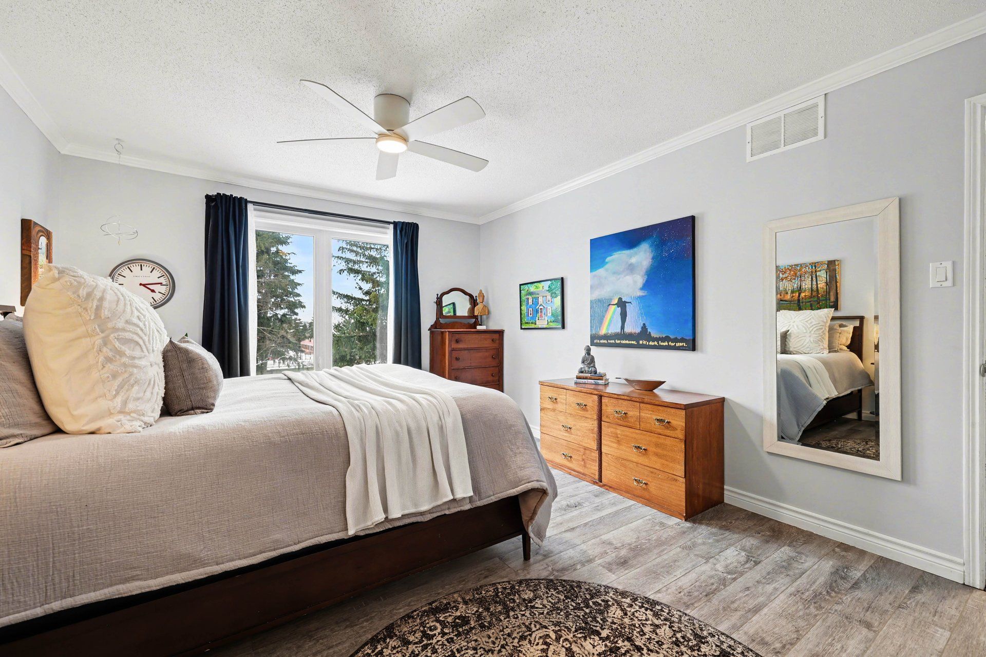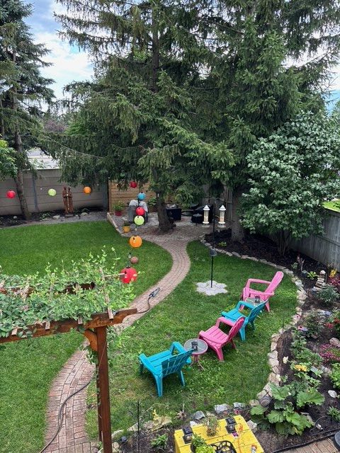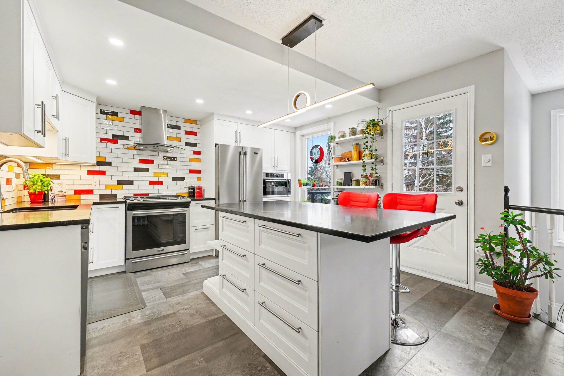 Fully renovated bungalow with walkout basement located in a mature neighbourhood with no rear neighbours. The backyard is a private oasis with mature trees and established gardens, creating a peaceful setting. The main floor is bright and welcoming with a spacious living and dining area finished with high-end vinyl flooring throughout - no carpeting. The fully renovated kitchen (2020) features quartz countertops, spanish tile backsplash, stainless steel appliances, a large island and breakfast bar, and direct access to a raised deck overlooking the backyard-perfect for entertaining or relaxing outdoors. The primary bedroom is generously sized and includes a walk-in closet and a unique semi-ensuite bath layout featuring a soaker tub and vanity (no toilet), with a separate adjoining area that includes an additional vanity, toilet, and shower for added functionality. The fully walkout lower level is bright and sunny offering excellent additional living space with a dramatic two-storey family room and fireplace, plus access to an enclosed porch that opens in the summer to enjoy fresh air and breezes. This level also includes 2 bedrooms, a full bathroom, laundry area, and ample storage, with potential for a 4th bedroom or an in-law suite thanks to the bright walkout design. Meticulously maintained and thoughtfully updated throughout. Major updates include: fully renovated kitchen and new appliances (2020), vinyl flooring throughout (2020), downstairs bathroom remodel (2021), new patio door (2021), 9 new windows (2024), driveway repaved (2023), exterior repainted (2025), furnace and water heater (2016), and a/c (2017).