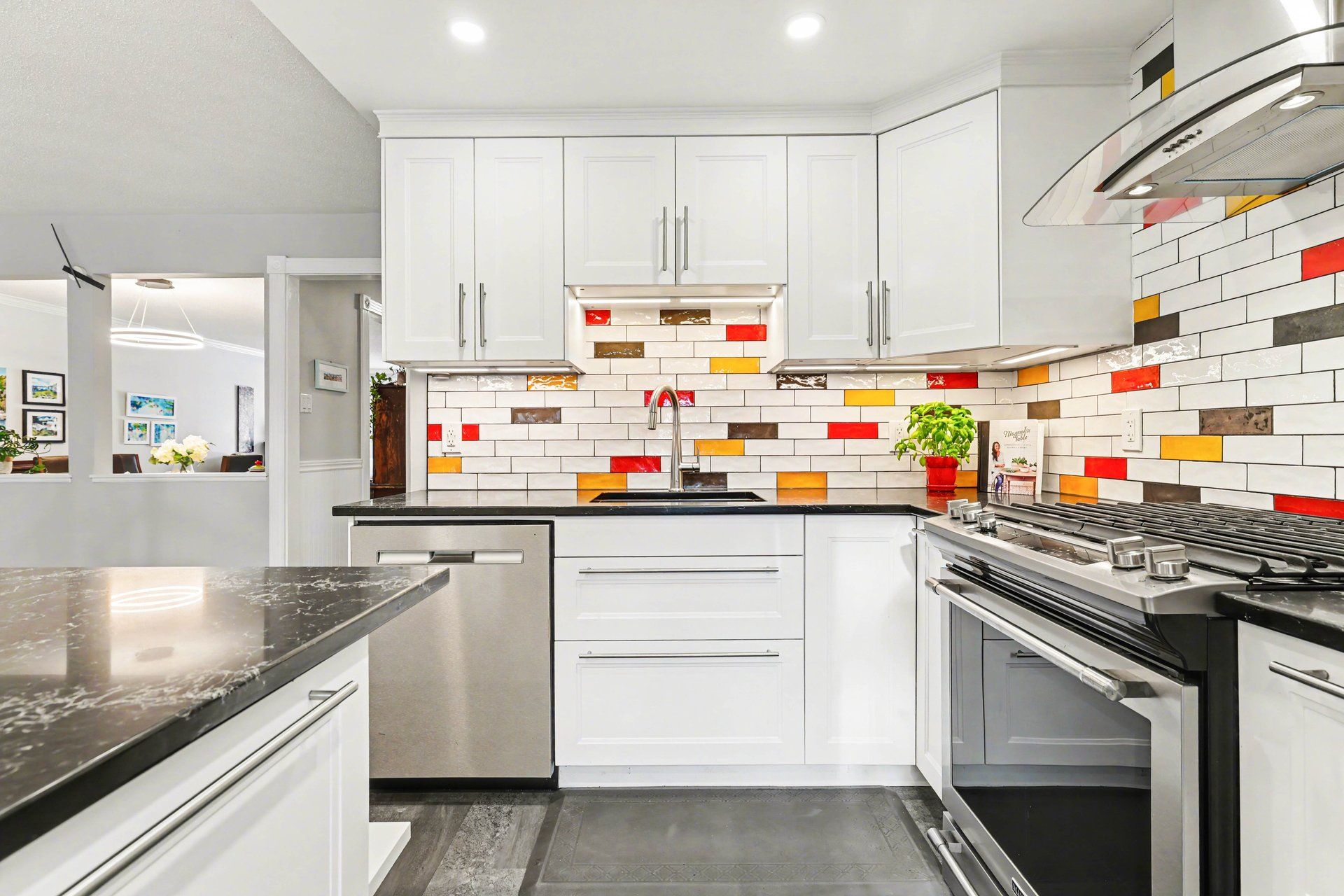 • Modern kitchen featuring quartz countertops and direct access to raised deck.