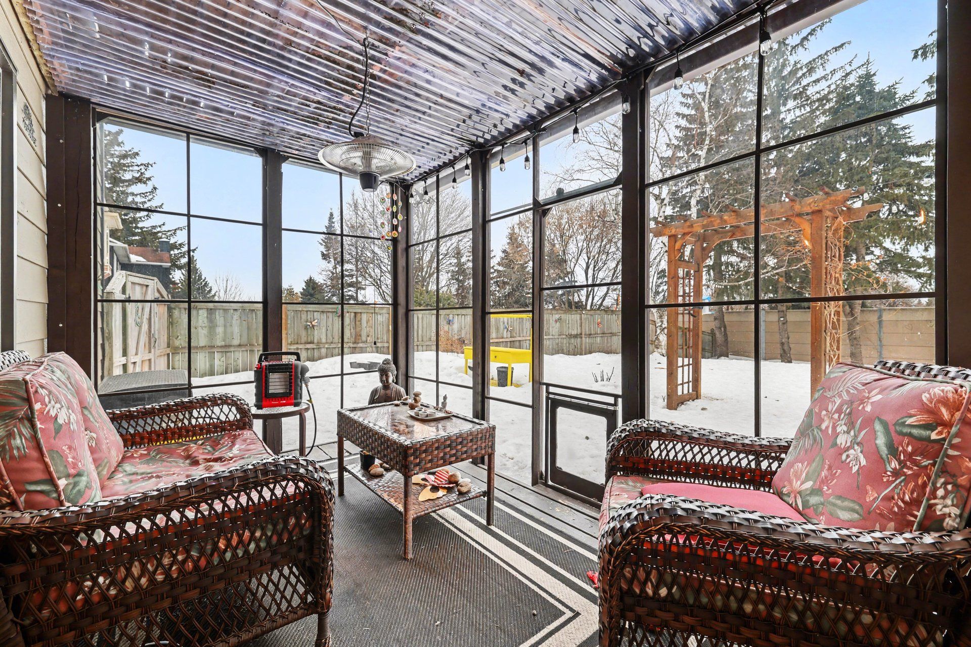 Fully renovated bungalow with walkout basement located in a mature neighbourhood with no rear neighbours. The backyard is a private oasis with mature trees and established gardens, creating a peaceful setting. The main floor is bright and welcoming with a spacious living and dining area finished with high-end vinyl flooring throughout - no carpeting. The fully renovated kitchen (2020) features quartz countertops, spanish tile backsplash, stainless steel appliances, a large island and breakfast bar, and direct access to a raised deck overlooking the backyard-perfect for entertaining or relaxing outdoors. The primary bedroom is generously sized and includes a walk-in closet and a unique semi-ensuite bath layout featuring a soaker tub and vanity (no toilet), with a separate adjoining area that includes an additional vanity, toilet, and shower for added functionality. The fully walkout lower level is bright and sunny offering excellent additional living space with a dramatic two-storey family room and fireplace, plus access to an enclosed porch that opens in the summer to enjoy fresh air and breezes. This level also includes 2 bedrooms, a full bathroom, laundry area, and ample storage, with potential for a 4th bedroom or an in-law suite thanks to the bright walkout design. Meticulously maintained and thoughtfully updated throughout. Major updates include: fully renovated kitchen and new appliances (2020), vinyl flooring throughout (2020), downstairs bathroom remodel (2021), new patio door (2021), 9 new windows (2024), driveway repaved (2023), exterior repainted (2025), furnace and water heater (2016), and a/c (2017).