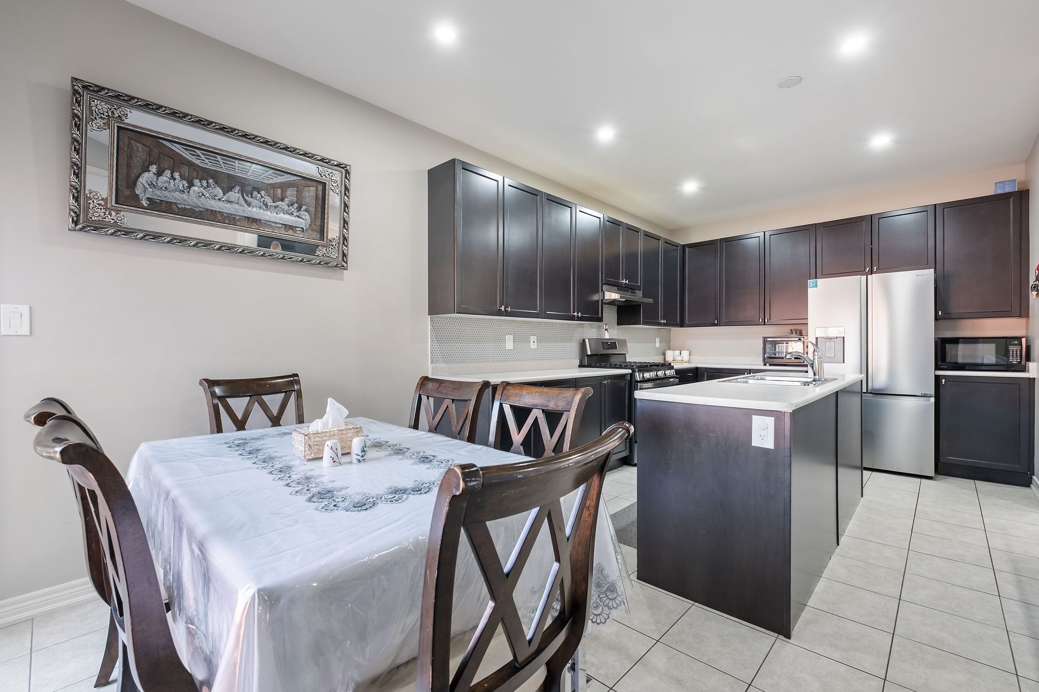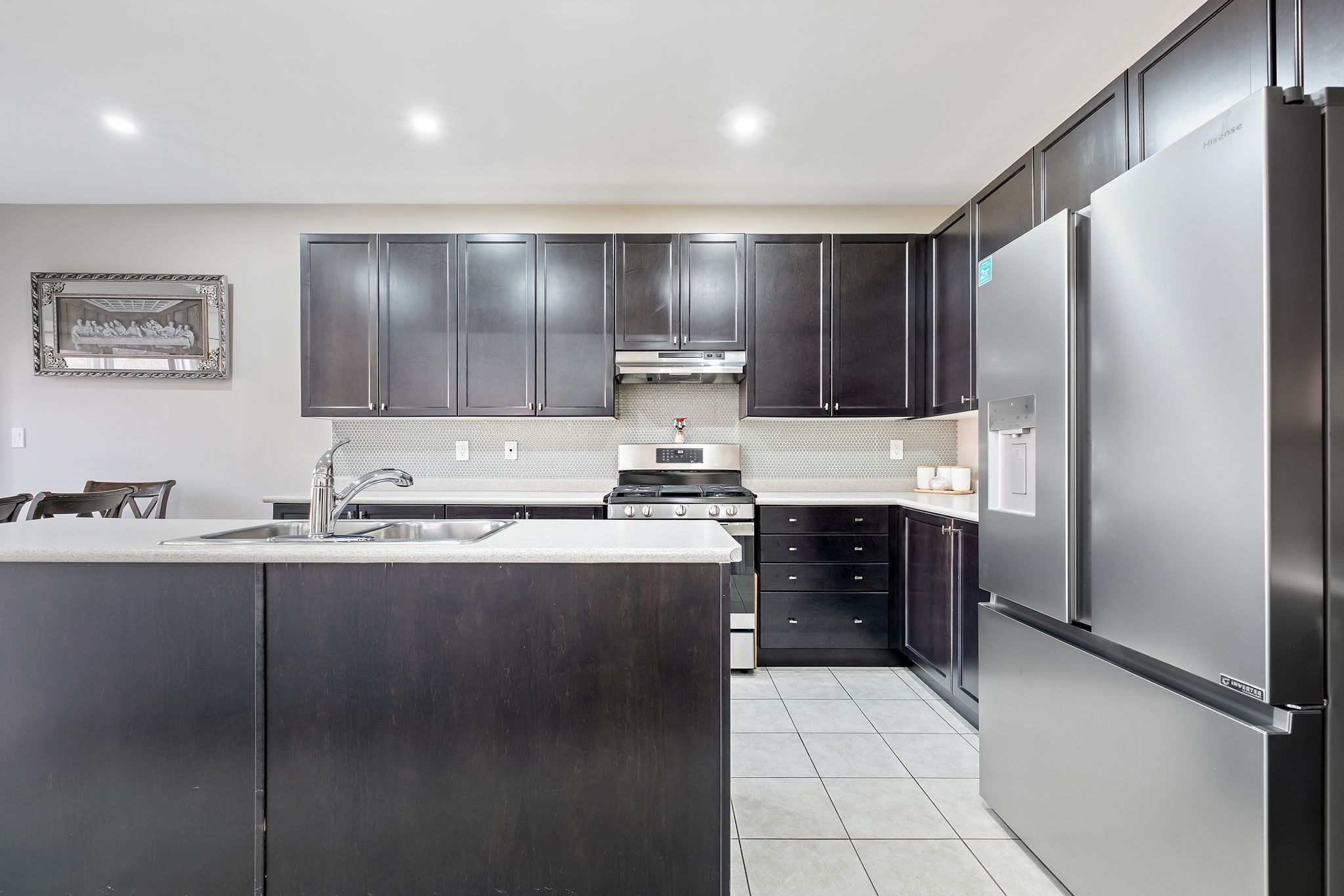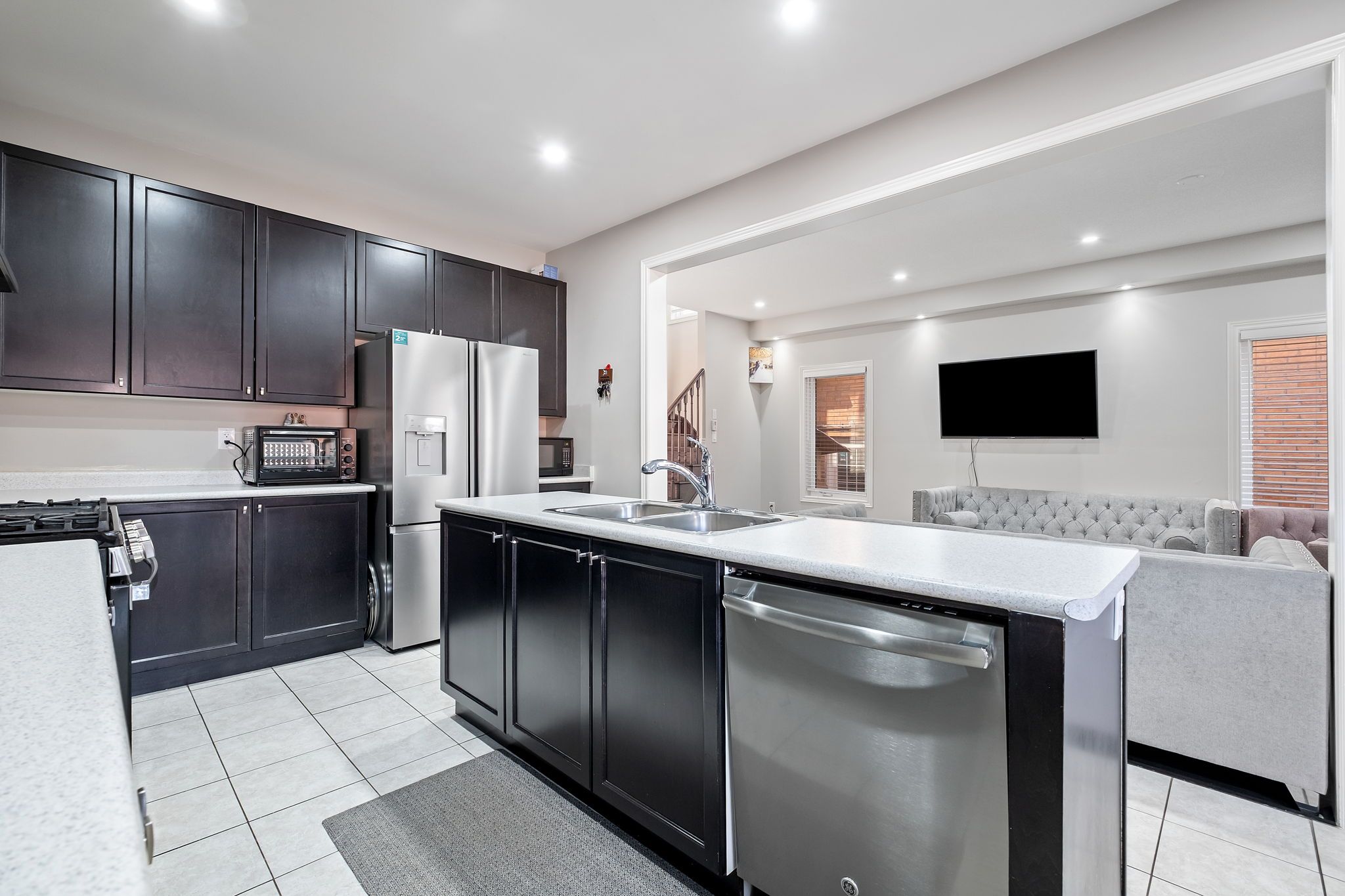 • Updated kitchen with a large island and modern appliances.
