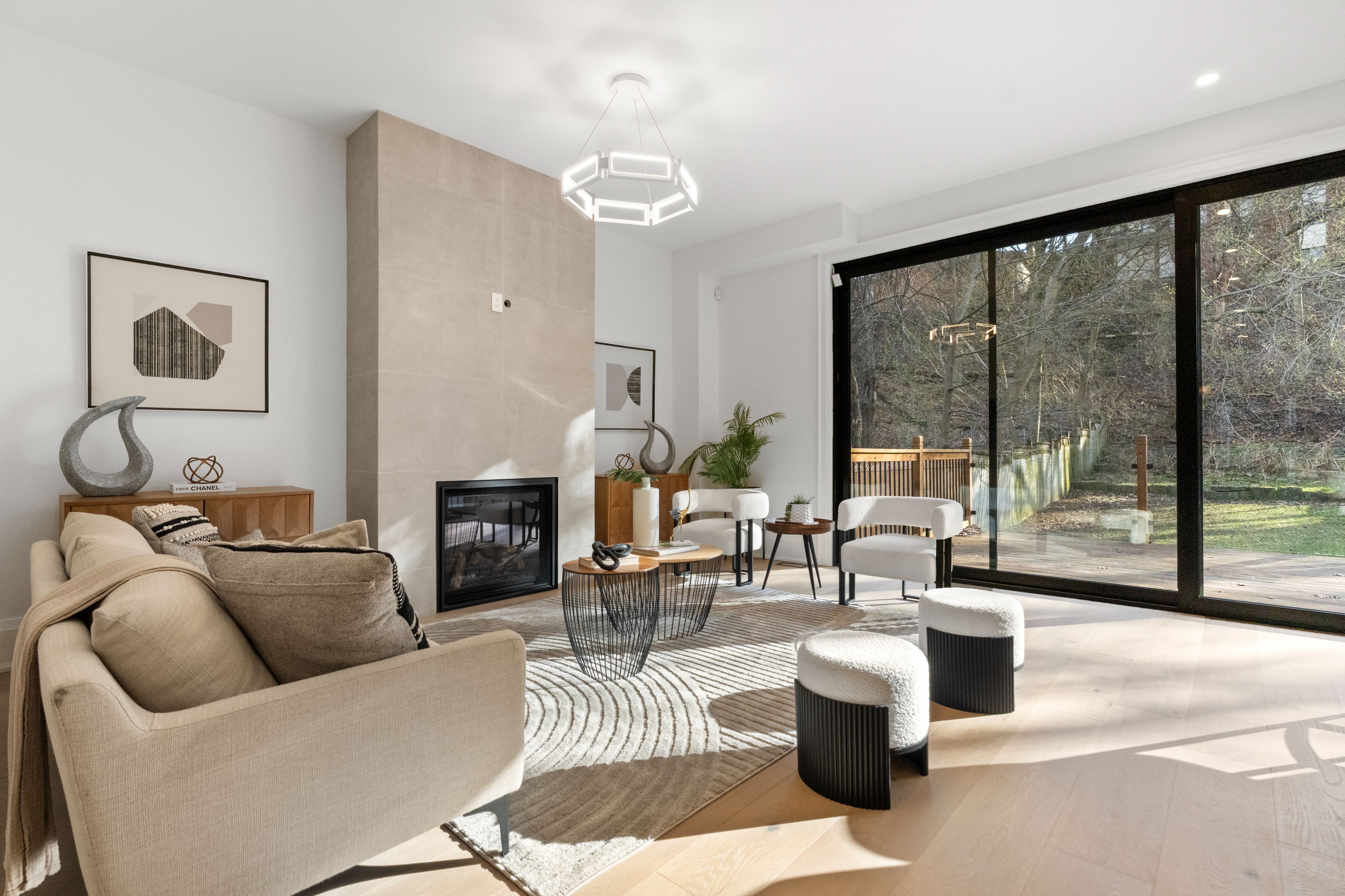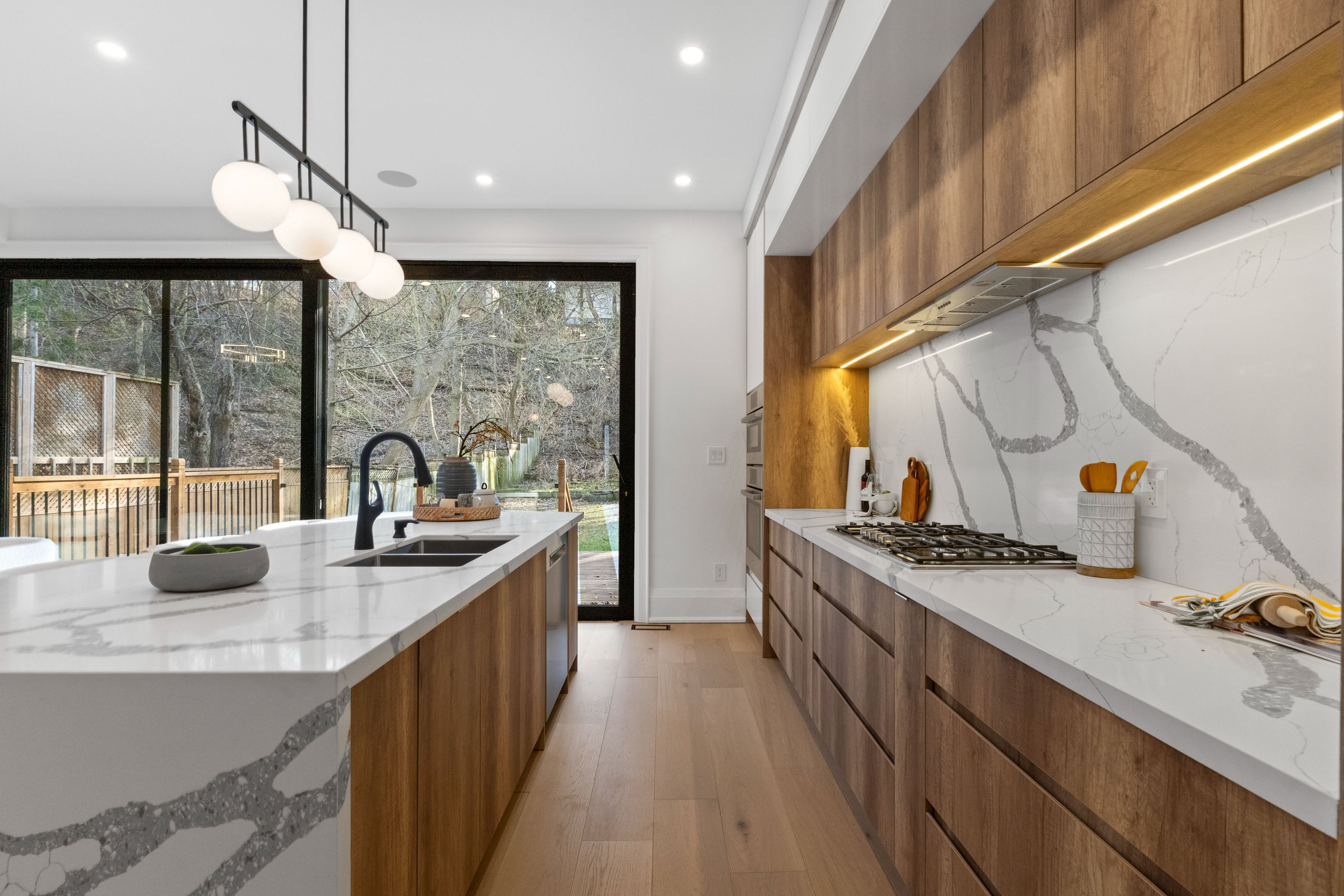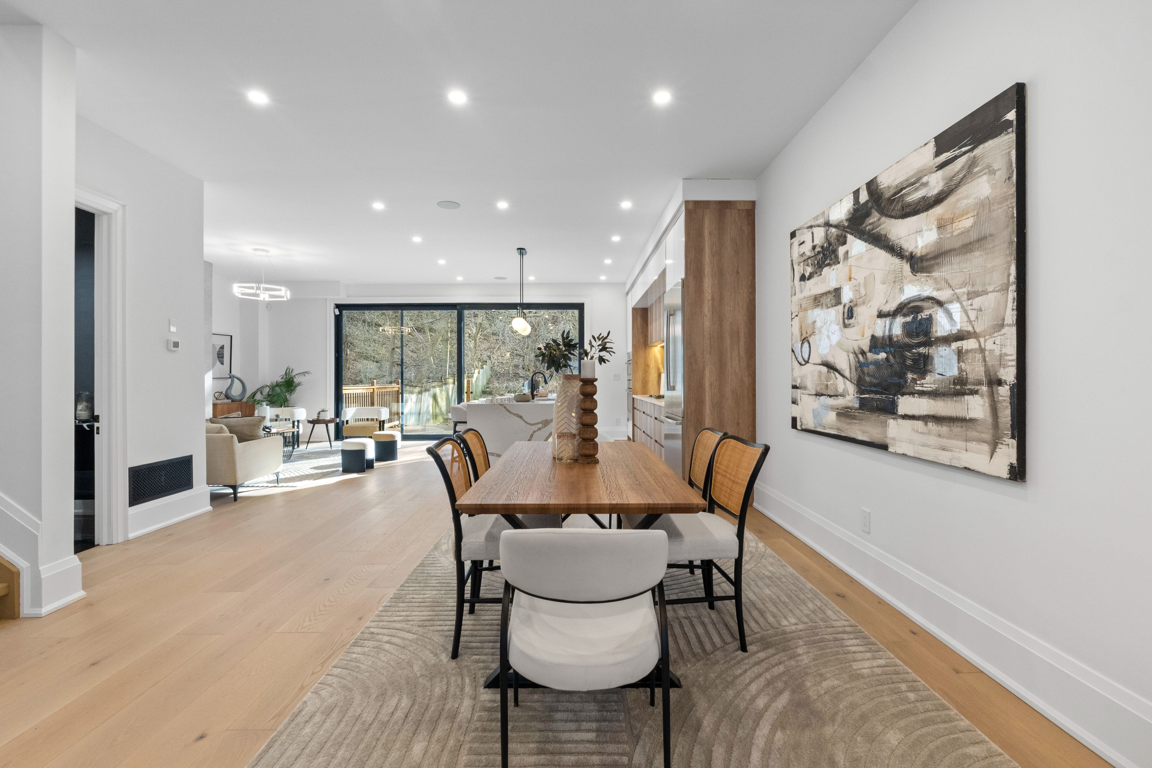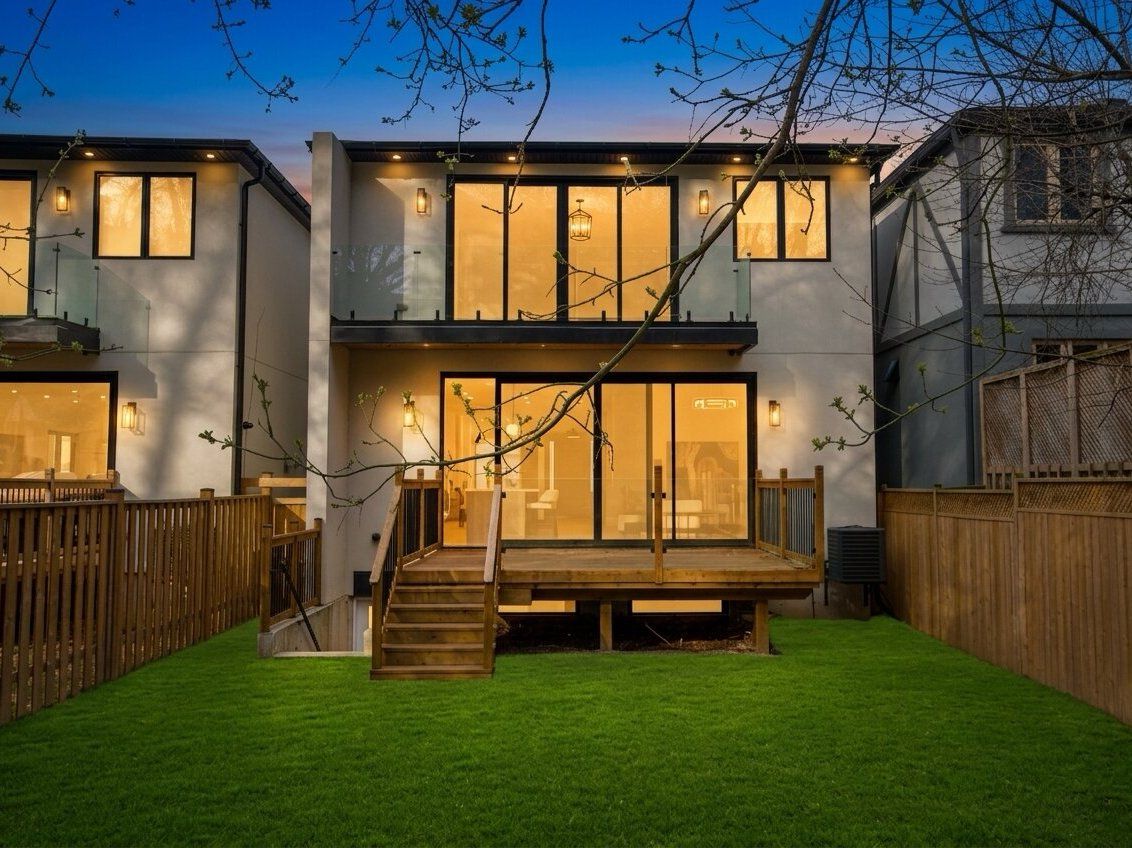 Set within one of toronto's most prestigious west-end enclaves, 78 south kingsway presents a striking custom residence backing onto the lush surroundings of the humber river. This 4+1 bedroom, 5-bathroom home spans approximately 3,700 sf and embodies modern sophistication with timeless appeal. The interior reveals itself with intention. Sunlight filters through a dramatic overhead skylight, illuminating wide-plank engineered oak floors and a sculptural oak staircase framed by glass. Every element has been carefully considered, from tailored millwork to integrated technology, including built-in speakers powered by a sonos system, smart lighting, and automated blinds. Prodigious principal rooms are designed for both comfort and entertaining, featuring expansive windows and a statement chef's kitchen that anchors the main level. The kitchen features a quartz waterfall island at centre stage, complemented by a suite of thermador appliances, and opens effortlessly onto a raised deck, creating a seamless transition for indoor and outdoor entertaining. The upper level is thoughtfully composed with four generously scaled bedrooms, each with access to ensuite baths with electric heated floors. The primary suite offers a quiet retreat, complete with a private balcony, dual walk-in closets, and a spa-inspired ensuite with a freestanding tub, glass shower, and double vanity. A dedicated laundry room adds practical convenience. Below, the walk-up lower level introduces a flexible extension of the home, featuring a spacious recreation area, wet bar, fifth bedroom, and a well-appointed bath, suited for guests, extended family, or income-generating potential. Outdoors, the landscaped grounds unfold into a private backdrop with no rear neighbours. A custom deck with integrated lighting and audio enhances the setting, offering a peaceful escape framed by nature. Positioned moments from top-rated schools, bloor west village, high park, and the humber river recreational trail.
