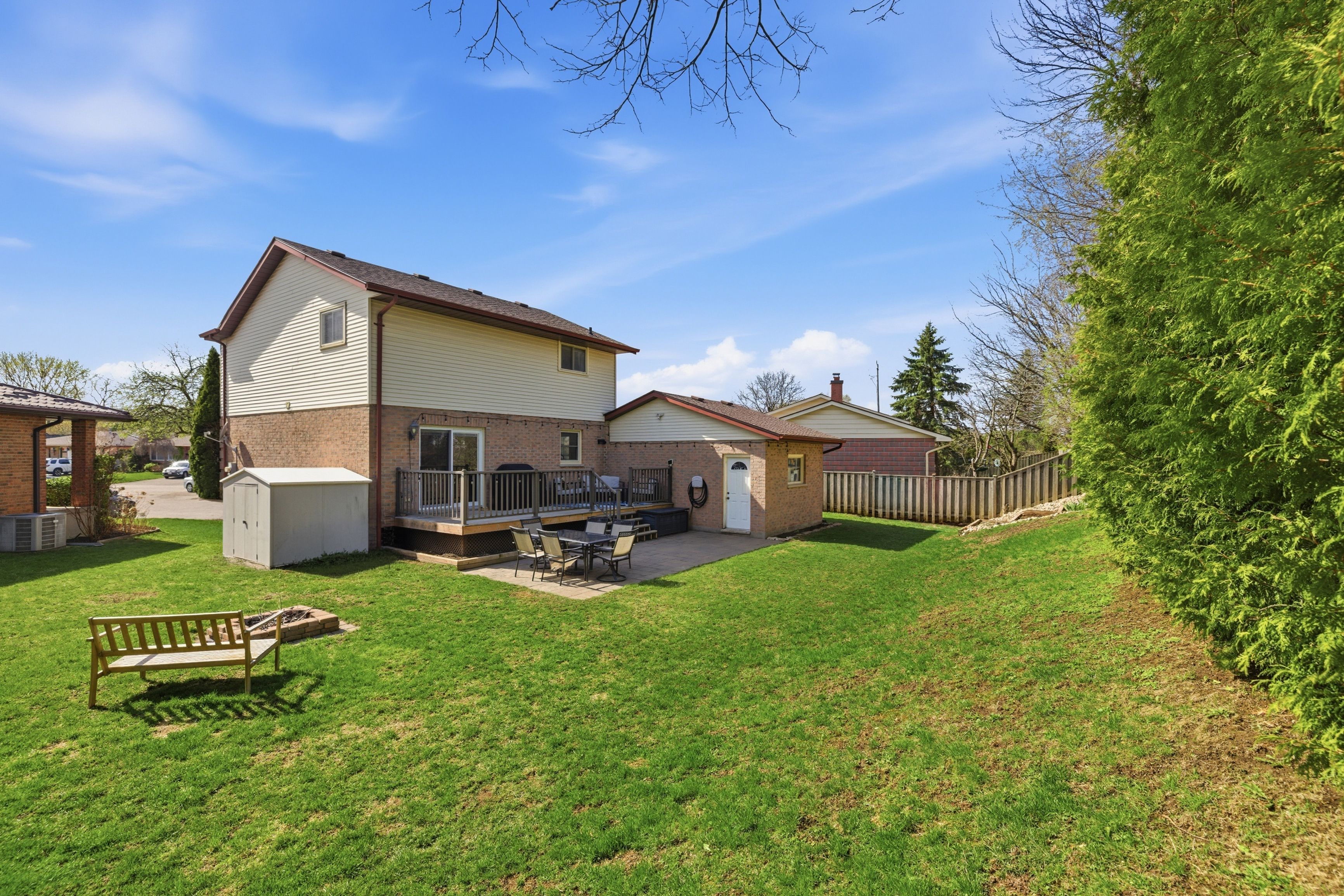 • Spacious backyard with deck, patio, and storage shed for convenience.