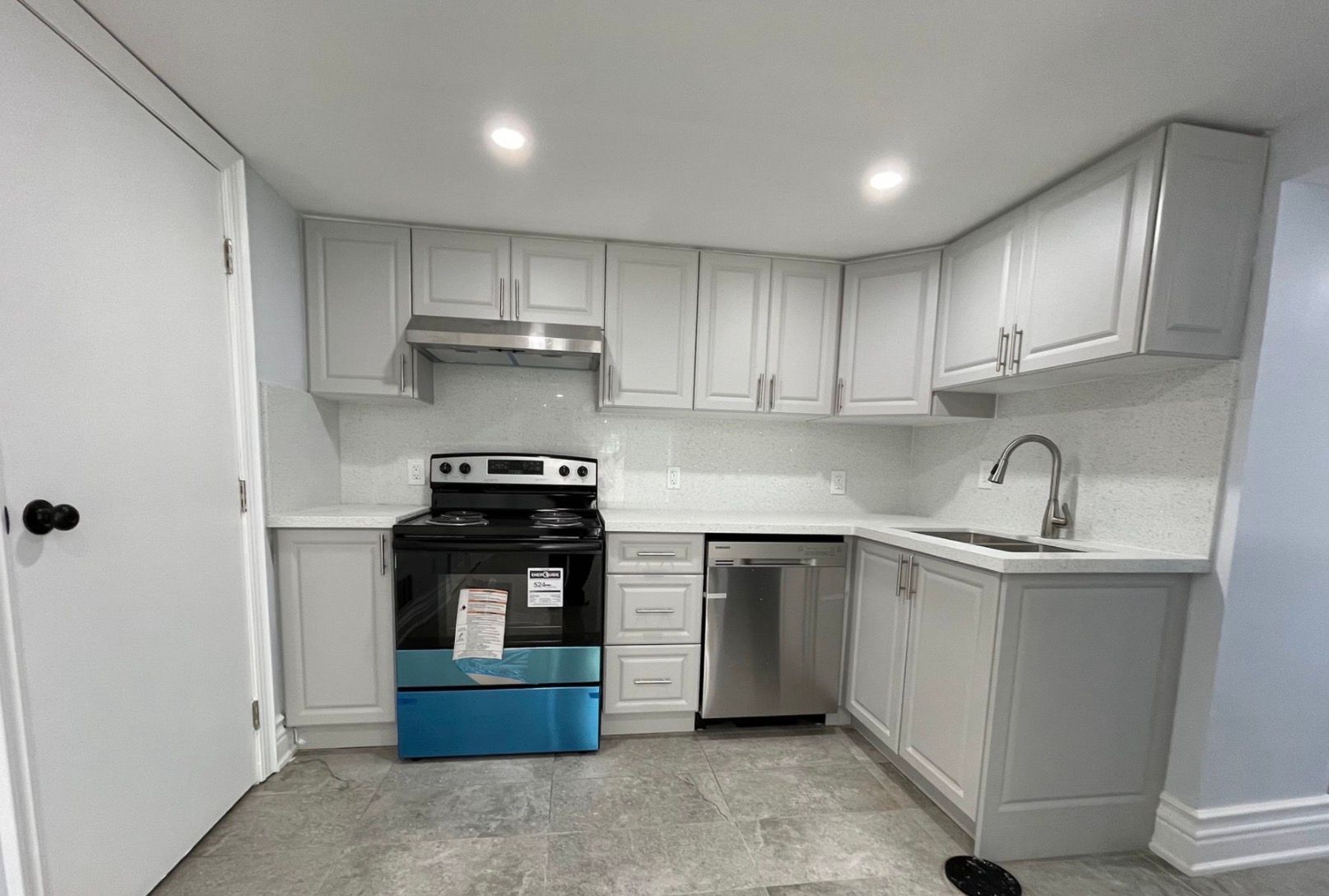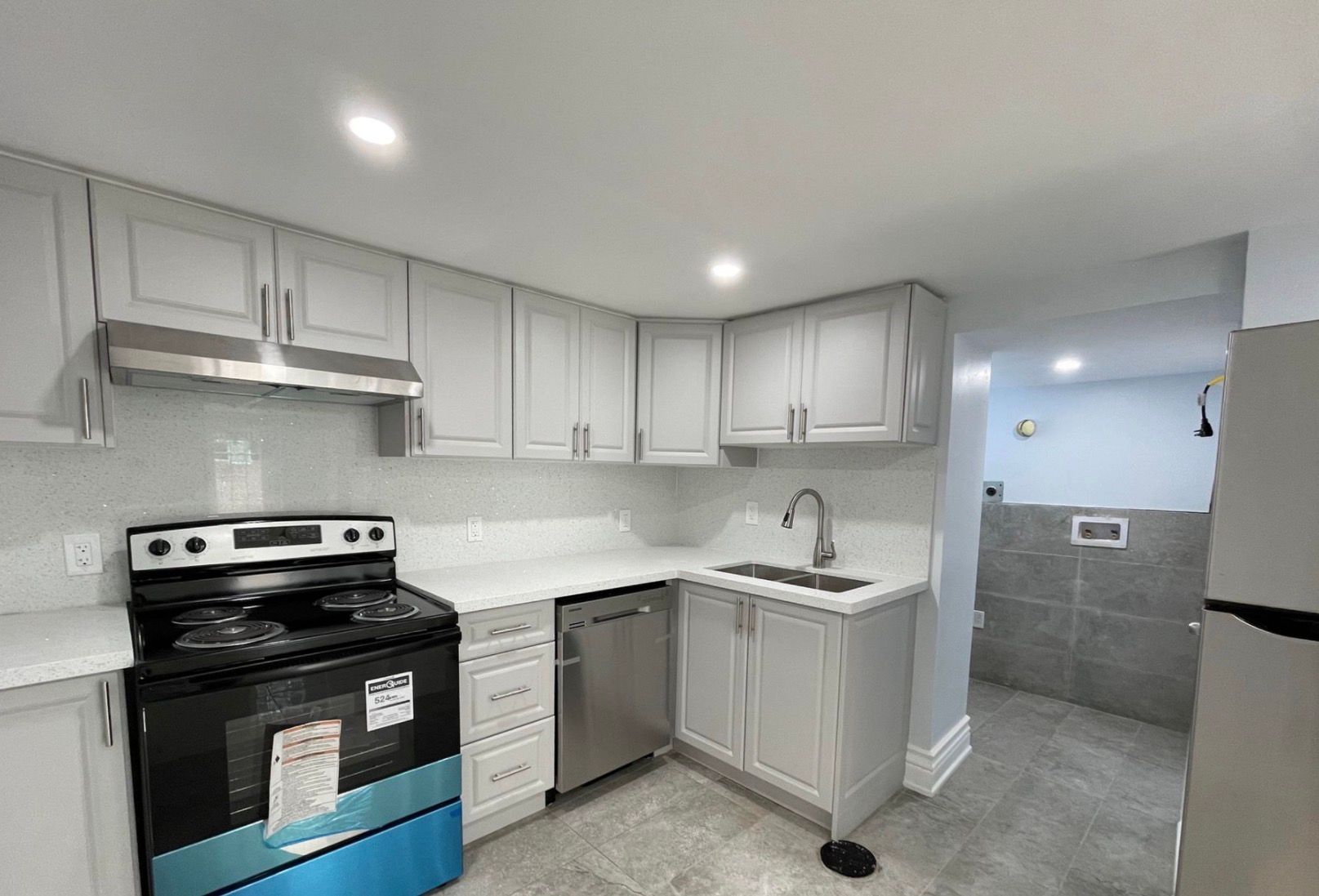 • Modern kitchen equipped with new stainless steel appliances.