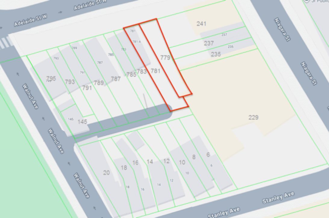 A truly rare offering in the heart of toronto's highly sought-after niagara neighbourhood. Offered as a package, 779 & 781 adelaide street west present two premium residential lots, perfectly positioned and primed for redevelopment. An exceptional opportunity for builders, investors, or end-users to create something truly special. The properties are ideally suited for a semi-detached development, with plans and prior building permit work already prepared by the seller. Buyers have the opportunity to take over and proceed with their own building permit application, allowing flexibility to customize and execute their vision. Situated on adelaide street with valuable rear laneway access, the potential here is significant-whether you're looking to build custom homes, income-generating properties, or a signature residence in the city core. Located within an official plan designated residential area and major transit station area, this property benefits from strong long-term growth fundamentals and continued intensification. Surrounded by some of toronto's most vibrant amenities-just steps to king west, stanley park, transit, restaurants, cafes, and boutique shops. This is a location that continues to see strong demand and appreciation. Opportunities like this are increasingly rare in the toronto core.