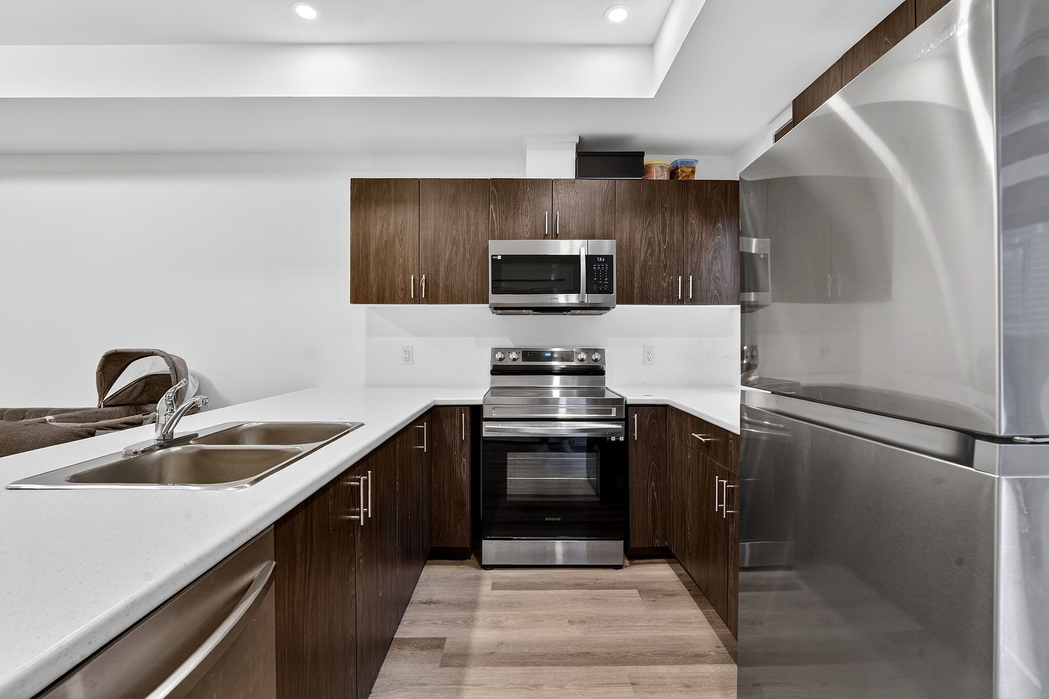 • Contemporary kitchen with stainless steel appliances and private deck.