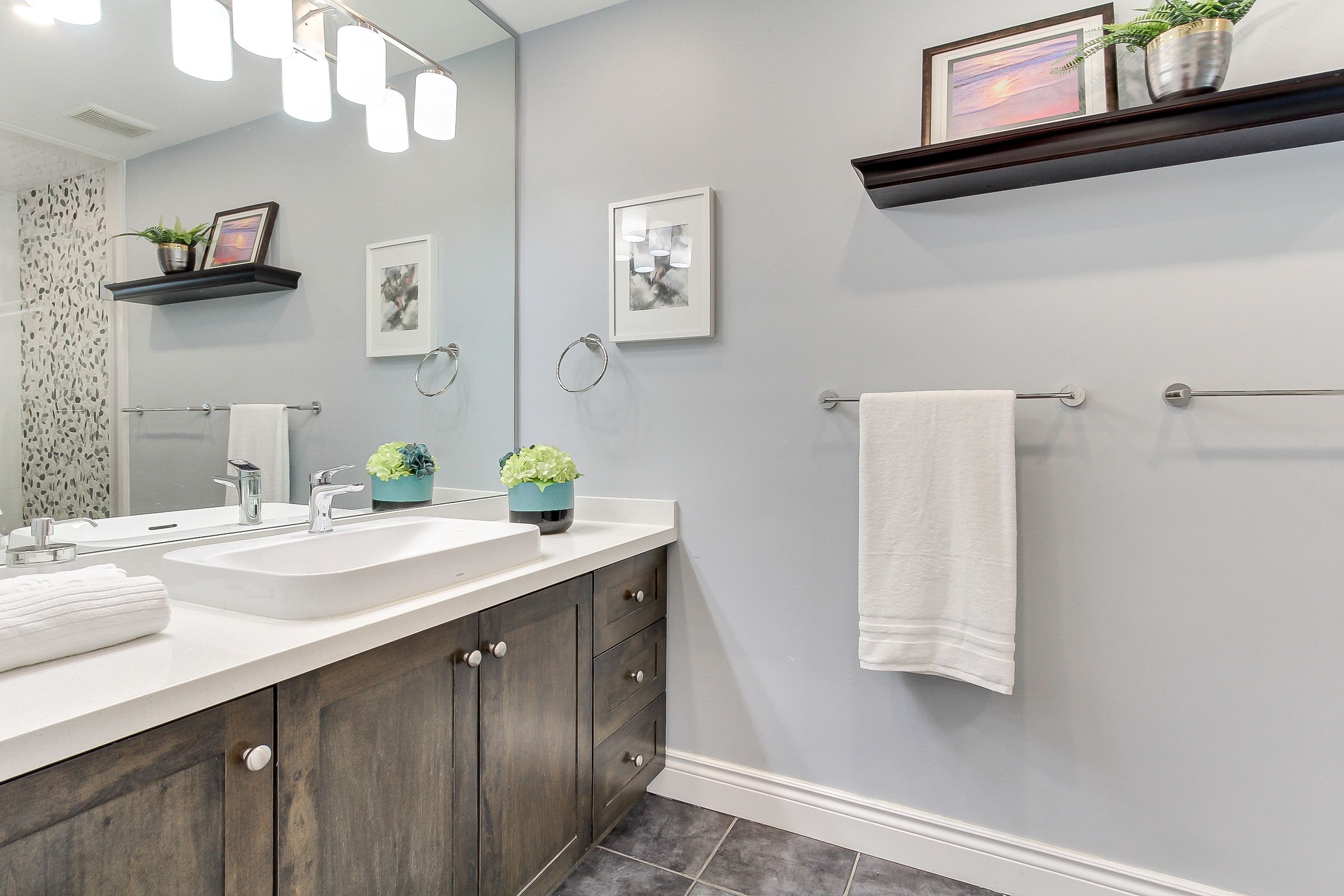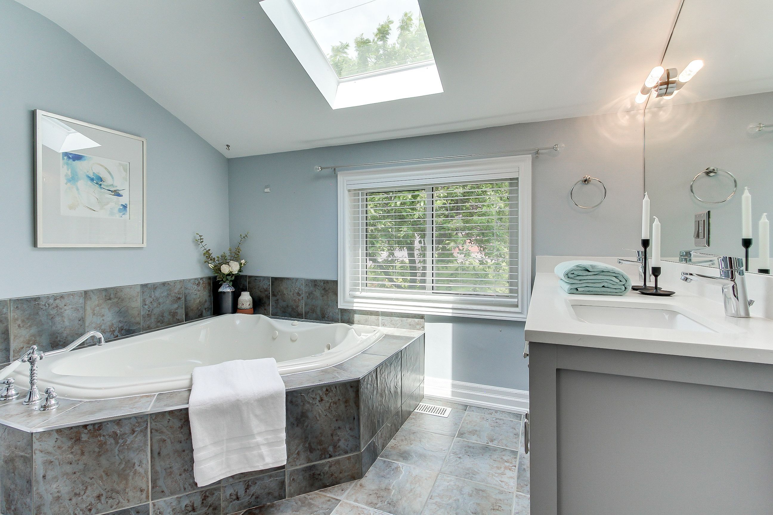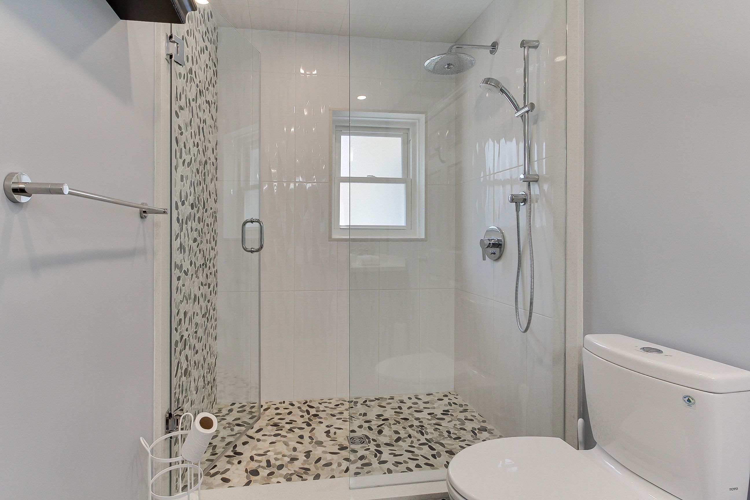 • Updated kitchens and bathrooms featuring modern glass shower enclosures.