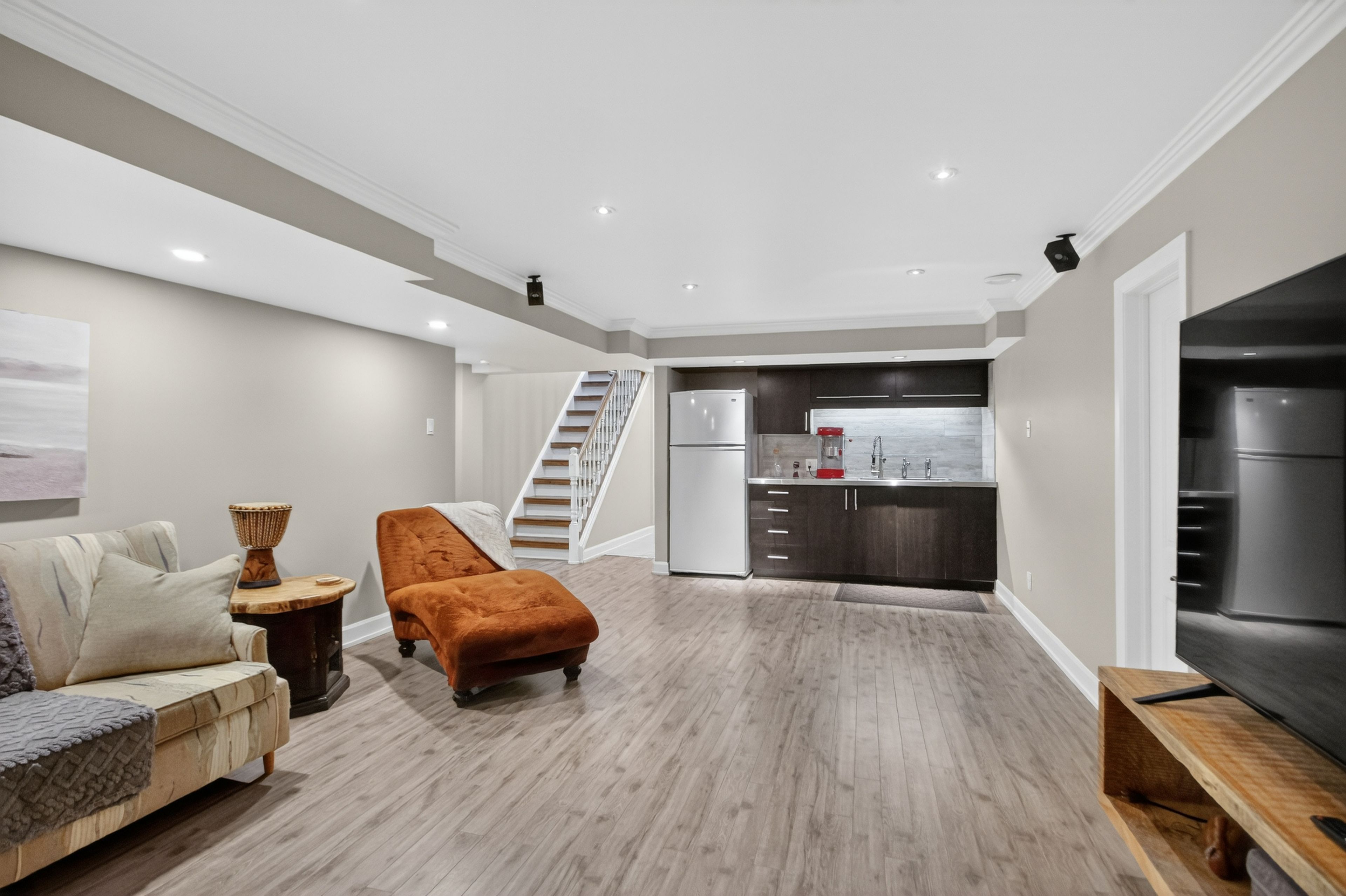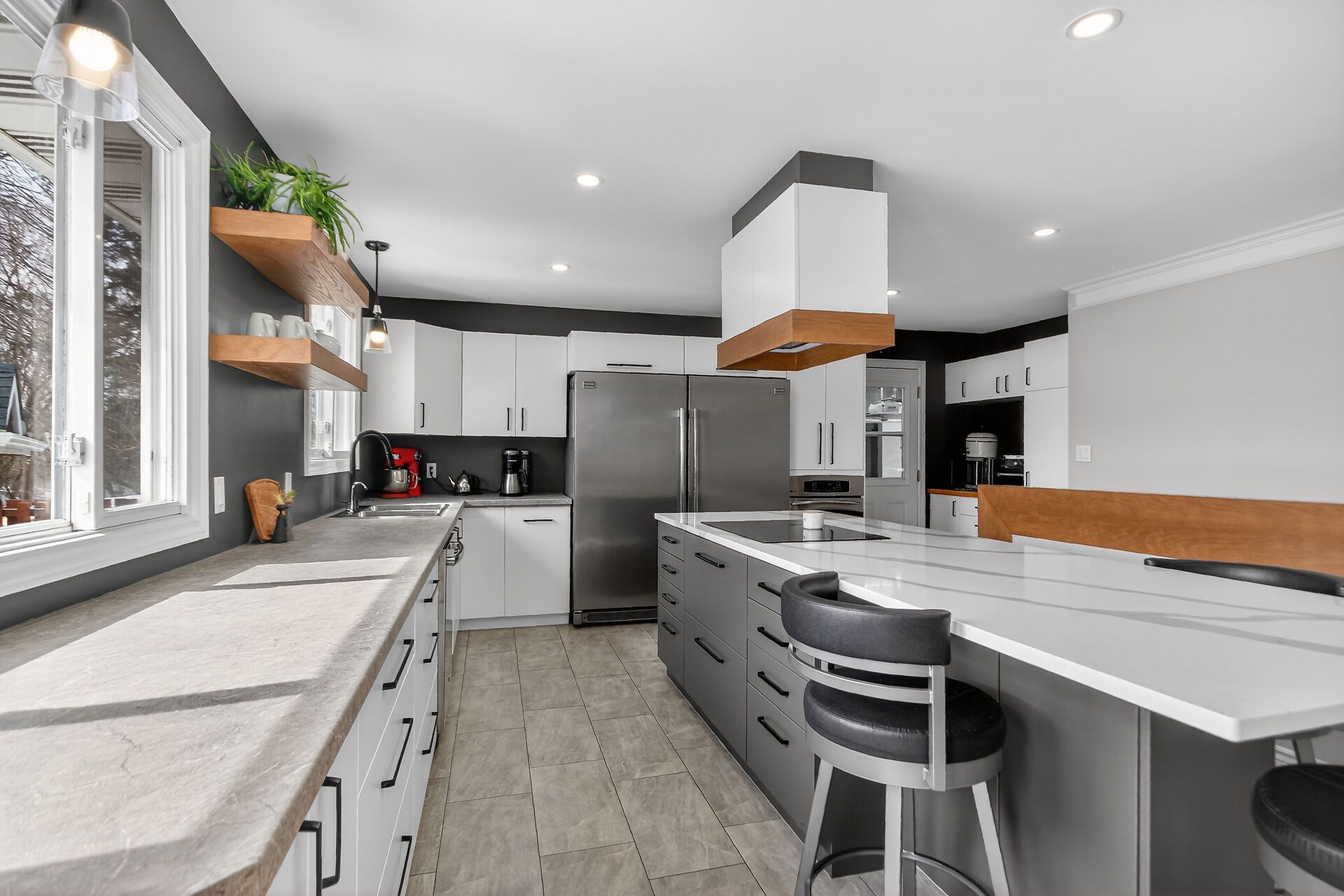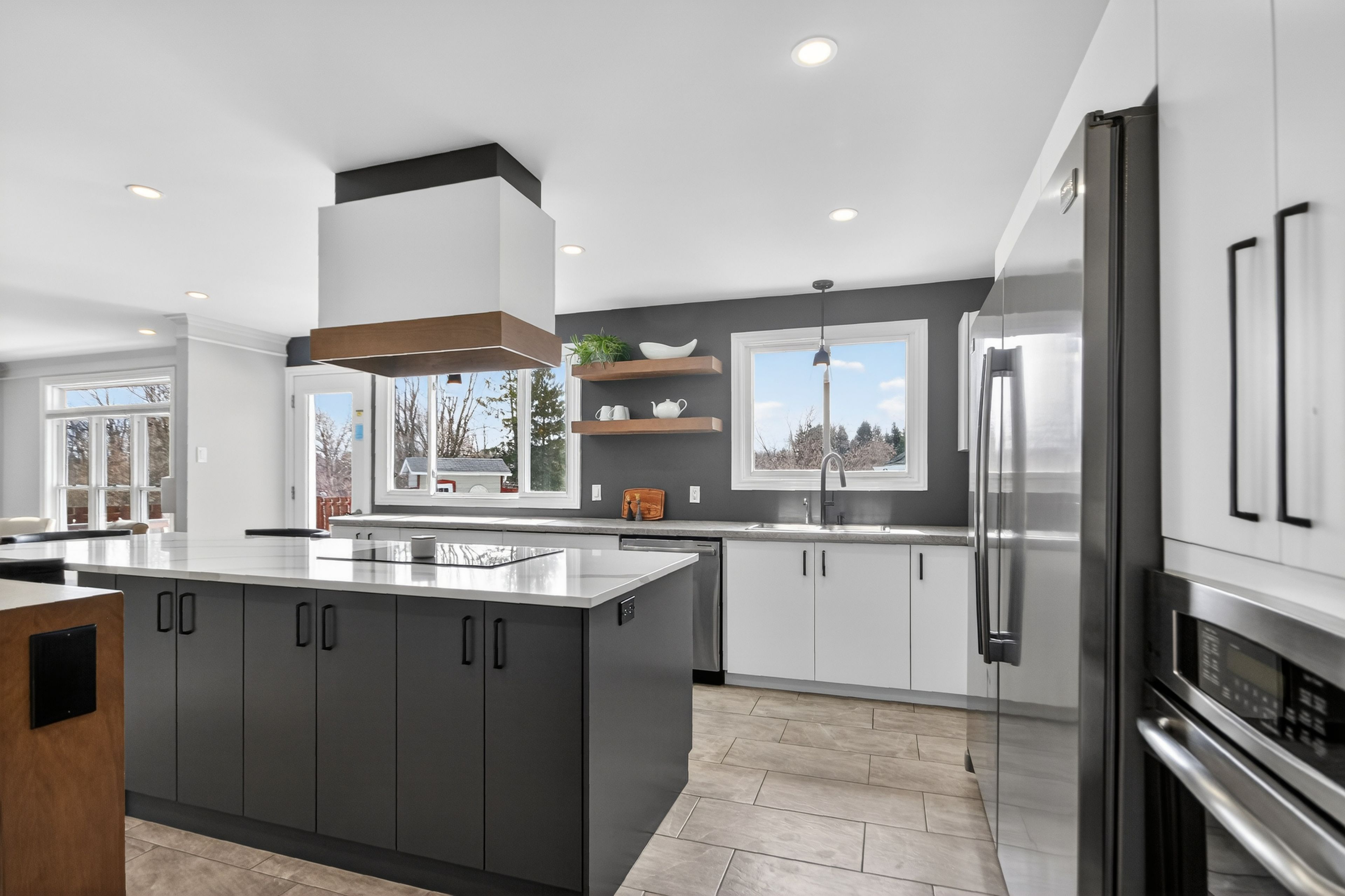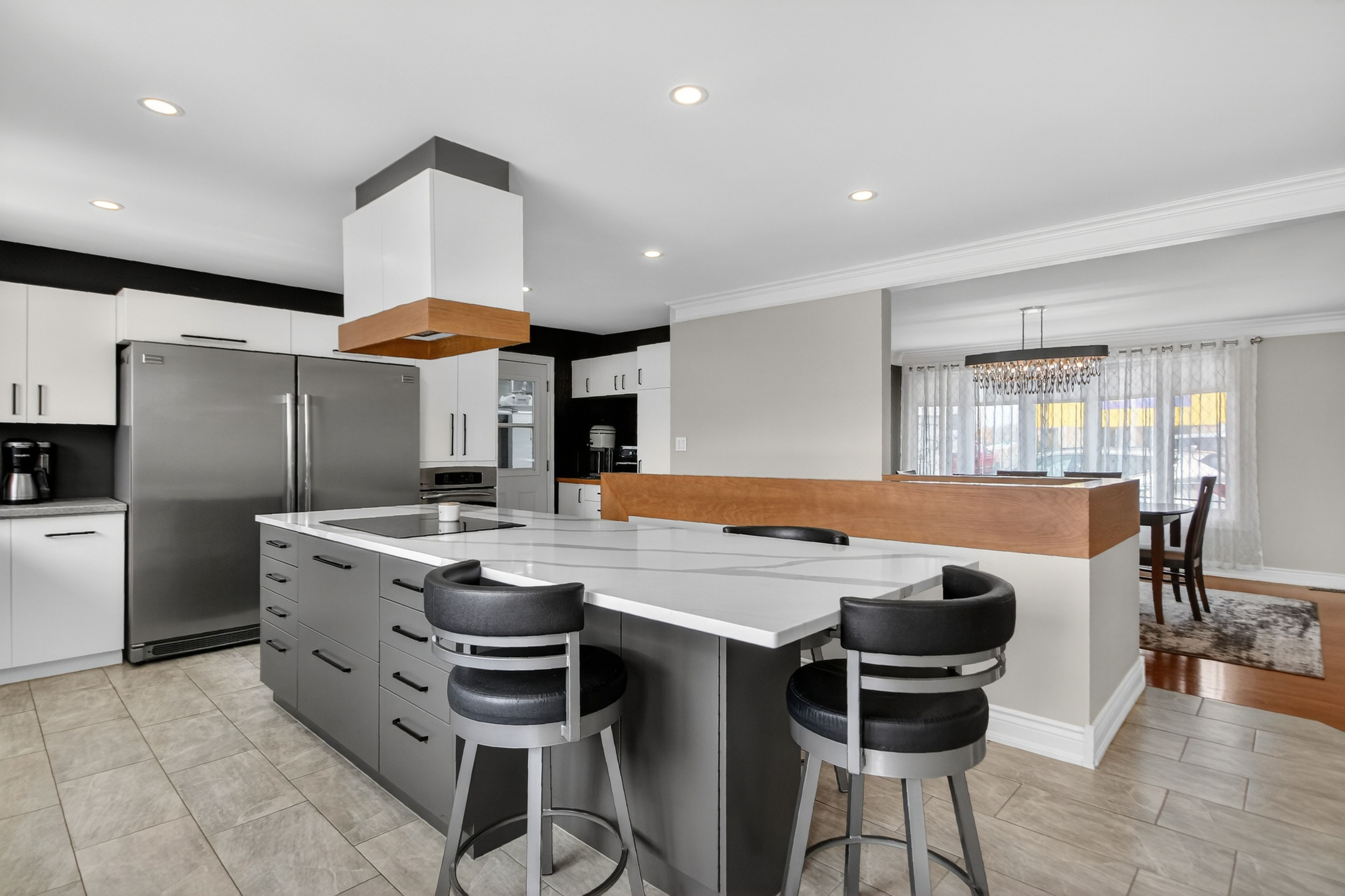 • Spacious main level with bright rooms and modern kitchen featuring a large quartz island.