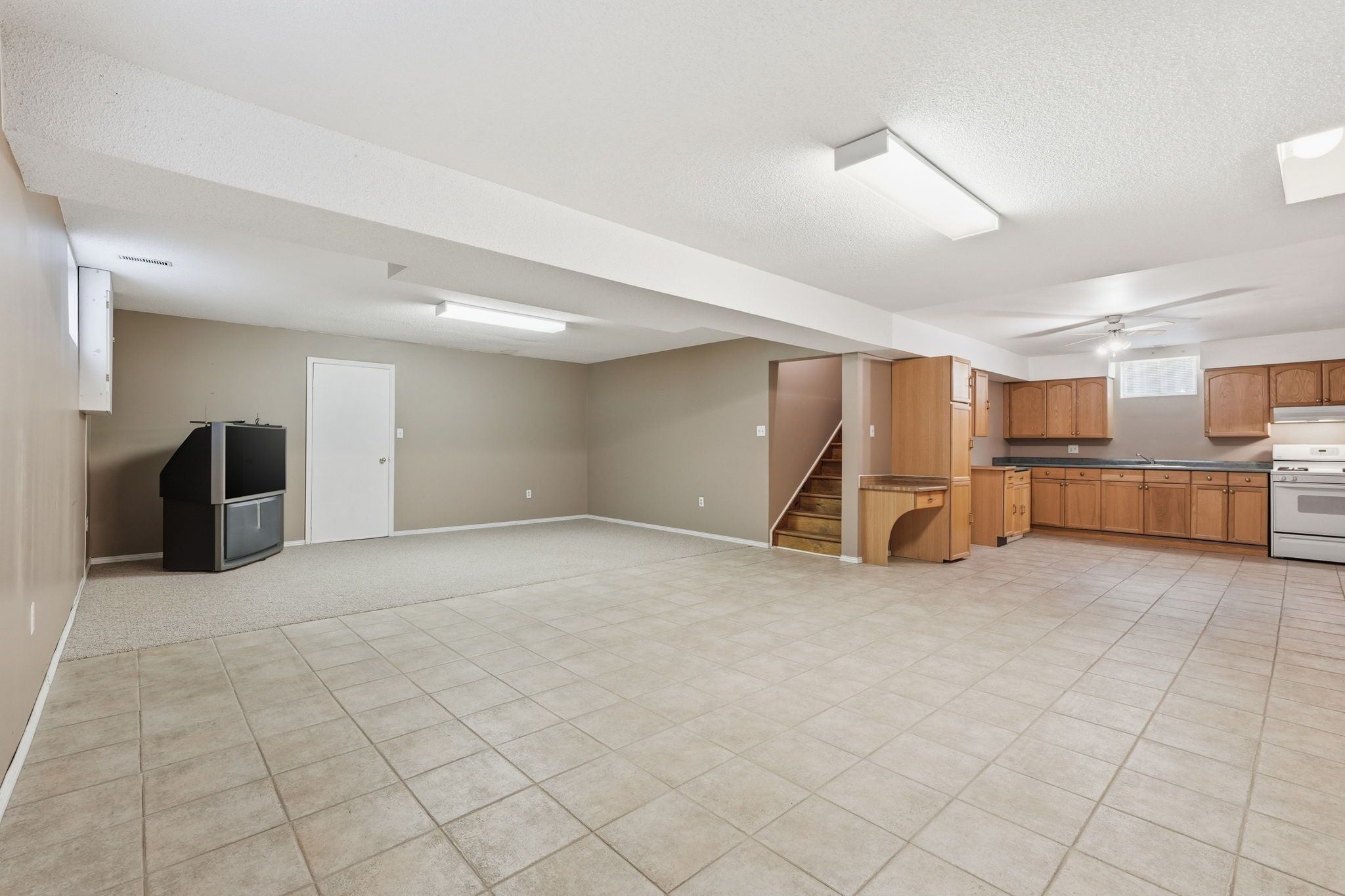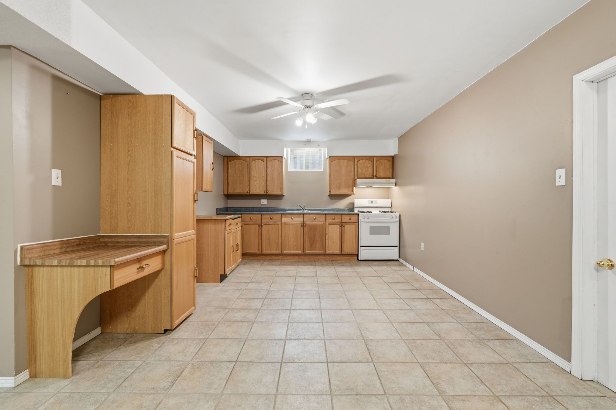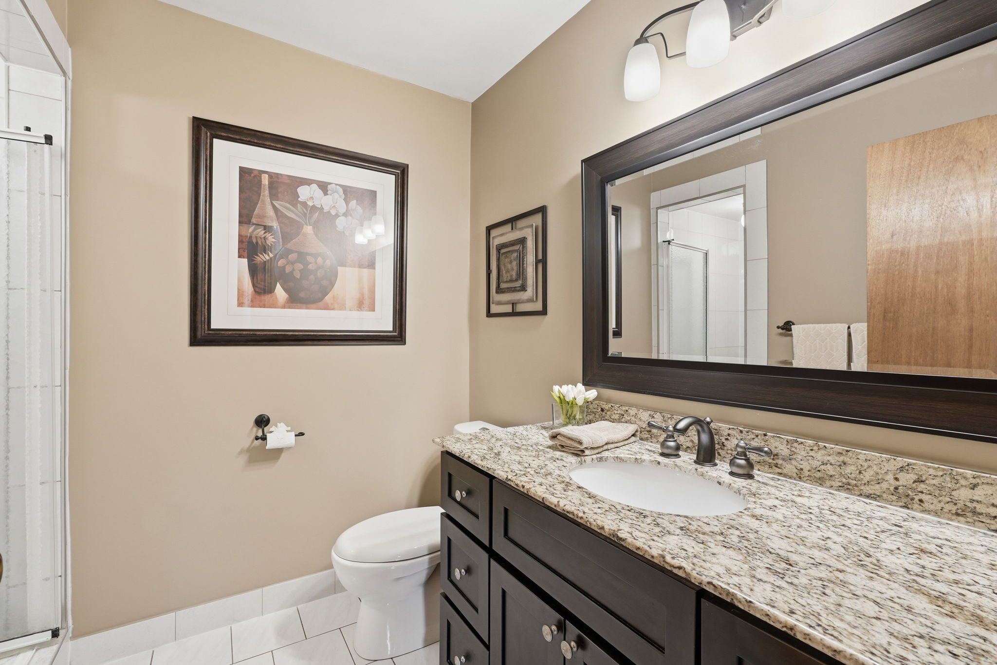 • Renovated kitchen features granite countertops and ample cabinetry.