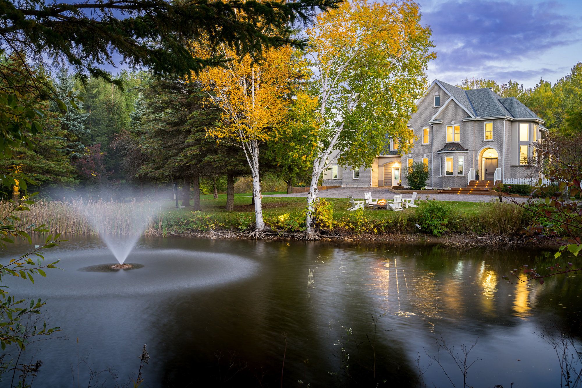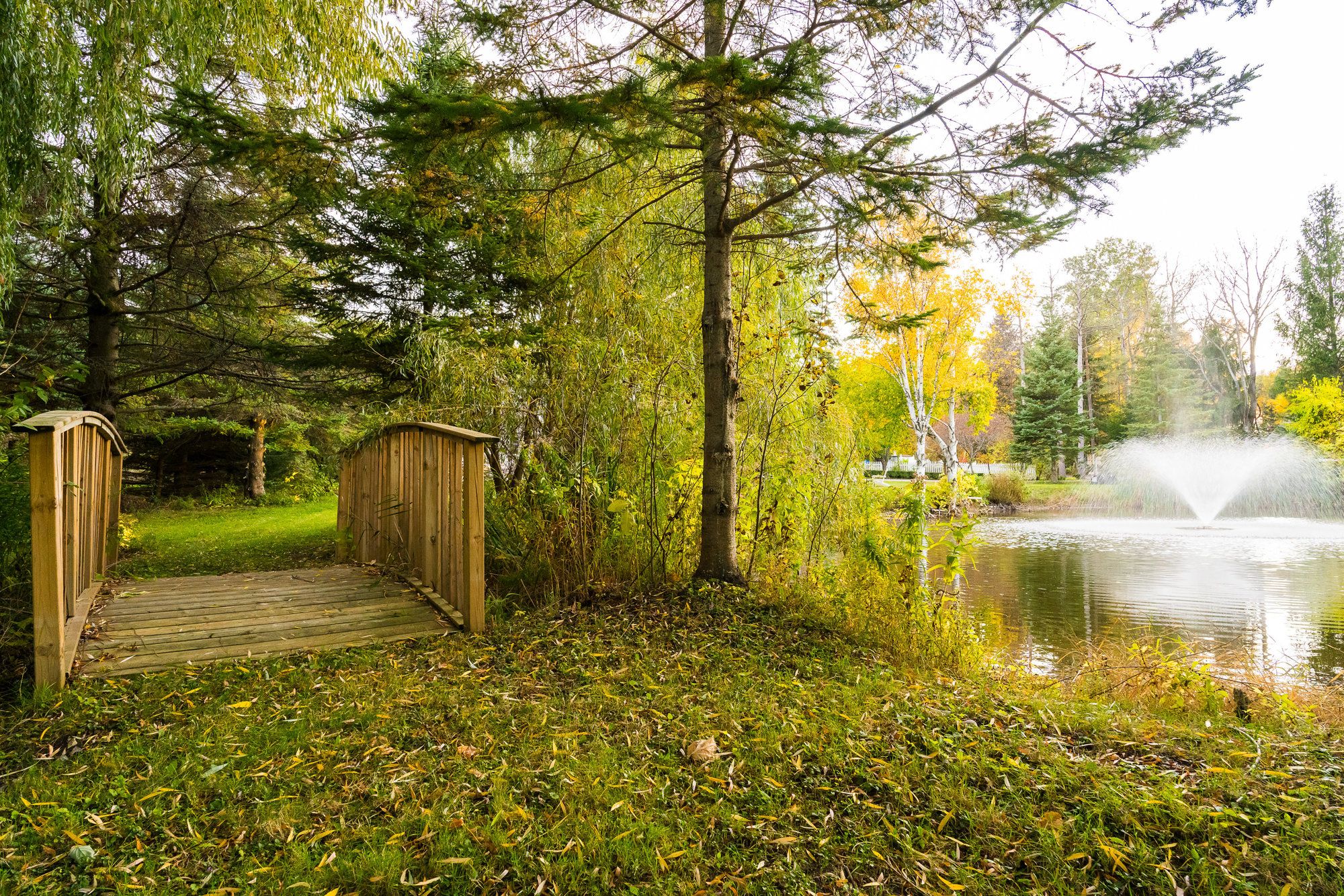 • Picturesque surroundings with a tranquil pond, fountain, and maple trees.