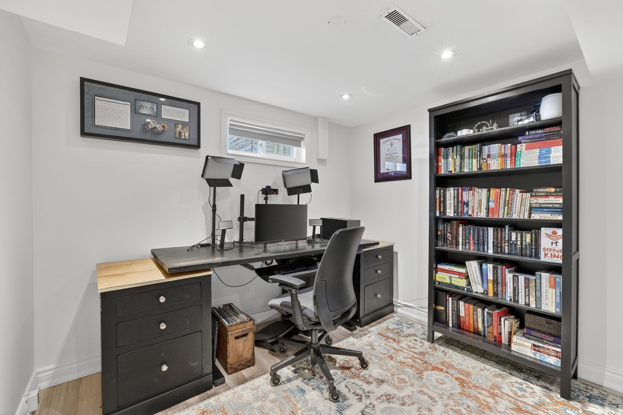 • Finished basement with recreation room, office, and additional bathroom space.