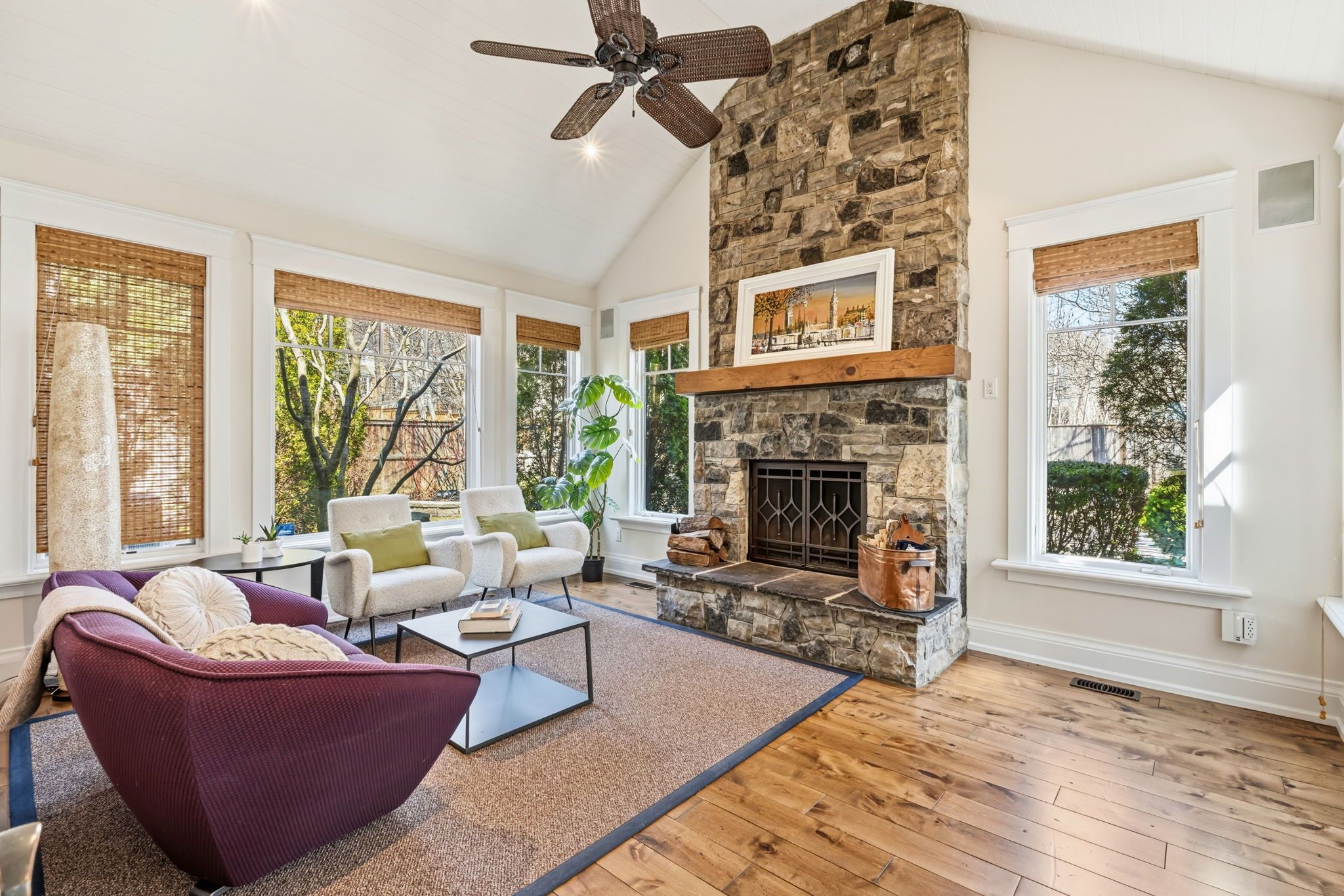 • Serene Muskoka Room offers views of a beautiful backyard oasis.