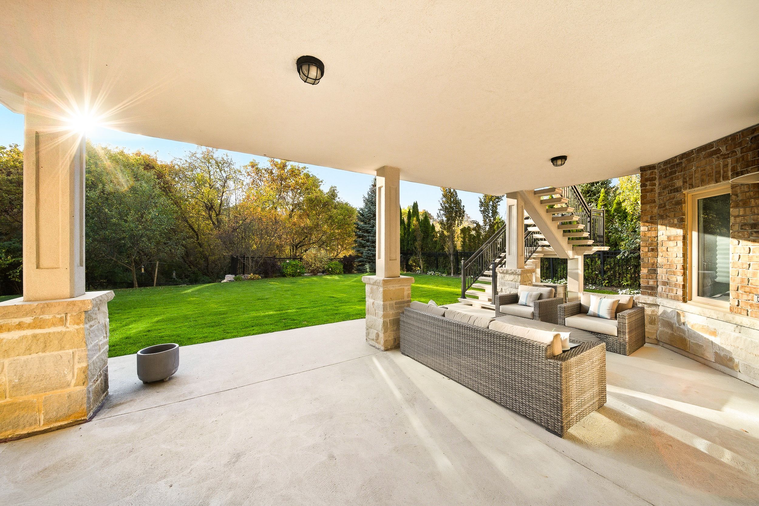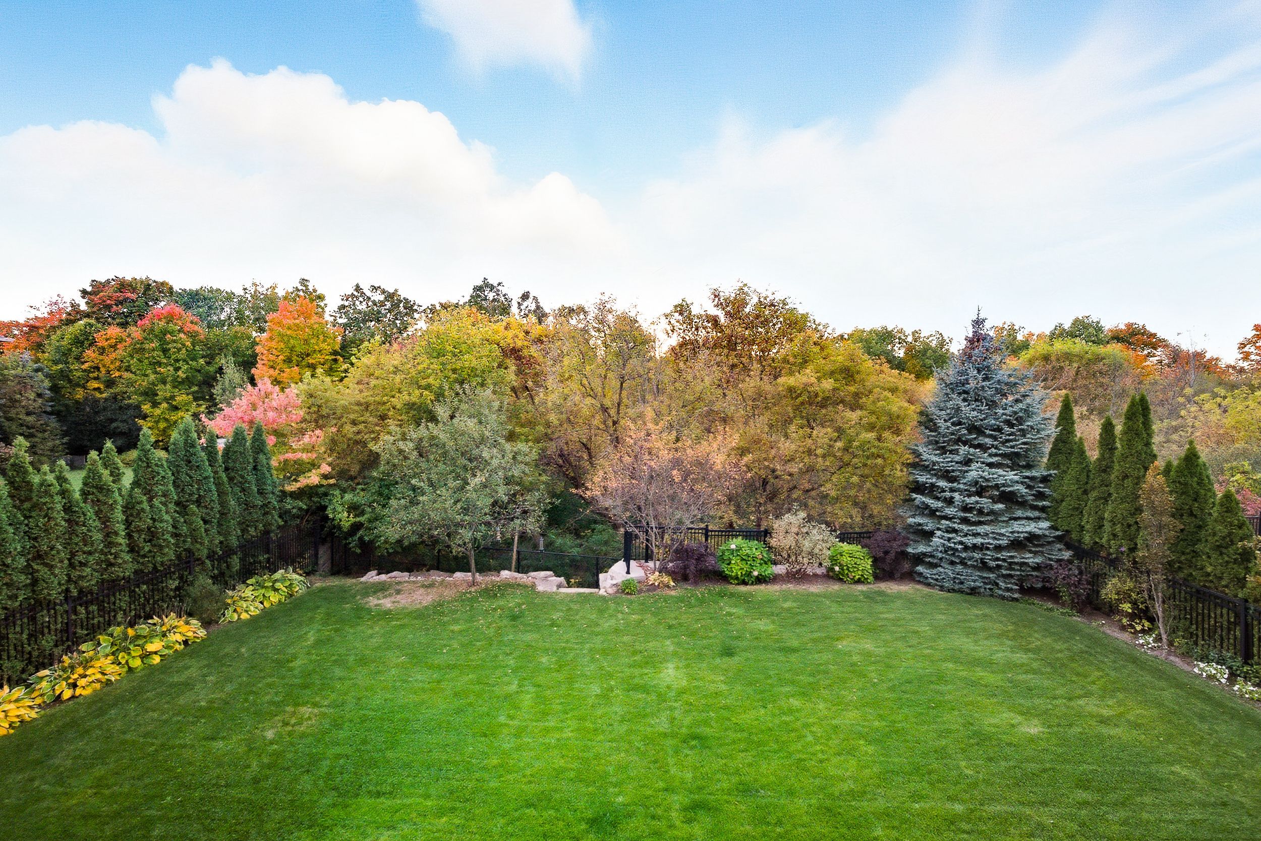 • Private backyard with professional landscaping backing onto conservation.