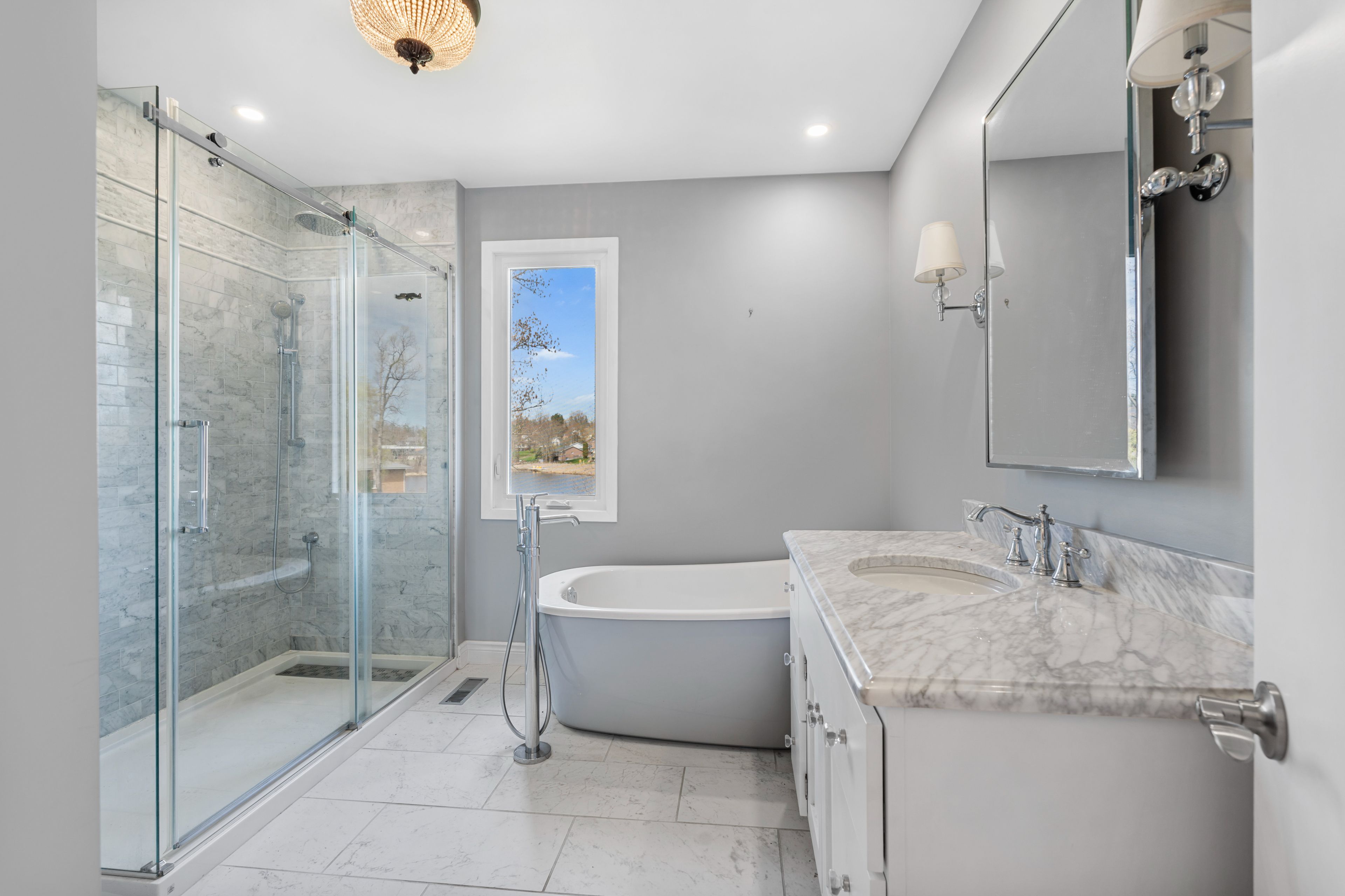 Welcome to your riverside sanctuary along the lovely napanee river! Experience the best of waterfront living in this enchanting two-storey home, where modern comfort meets classic architectural charm. Rarely does a property blend such peaceful natural beauty with a prime riverfront location and full town services. Admire timeless custom architecture enhanced by striking natural stone frontage that blends into landscaped gardens, creating year-round curb appeal. Step inside to a generous living area, featuring a cozy gas fireplace and expansive windows flooding the space with natural light. The spacious, stylish kitchen offers modern appliances and direct access to an expansive deck overlooking the river perfect for morning coffee, evening sunsets, and gatherings with friends as swans glide by. The dining room is a delight for nature lovers, wrapped in windows framing panoramic river views. Enjoy multiple flourishing gardens that complete the serene setting and offer year-round pleasure. The main floor is designed for versatility, featuring a bedroom with cheater 2pc ensuite ideal for guests, family members needing easy access, or multigenerational living. You'll also appreciate the convenient laundry room with direct garage entry. Upstairs, the primary bedroom is a private retreat complete with a 2pc ensuite and a balcony overlooking the tranquil river. Two additional bedrooms and a 4pc bath with soaker tub offer space and flexibility for family, guests, or home offices. The finished walk-out lower level boasts a generous rec room with wood burning fireplace, storage, a 3pc bath, second laundry hookup, and direct back yard access great for a potential in-law suite or extended family. This exceptional home is within walking distance of amenities and minutes from a boat launch. Perfect for multigenerational families, and those seeking both convenience and tranquility. Embrace riverside living at its finest in this one-of-a-kind home!