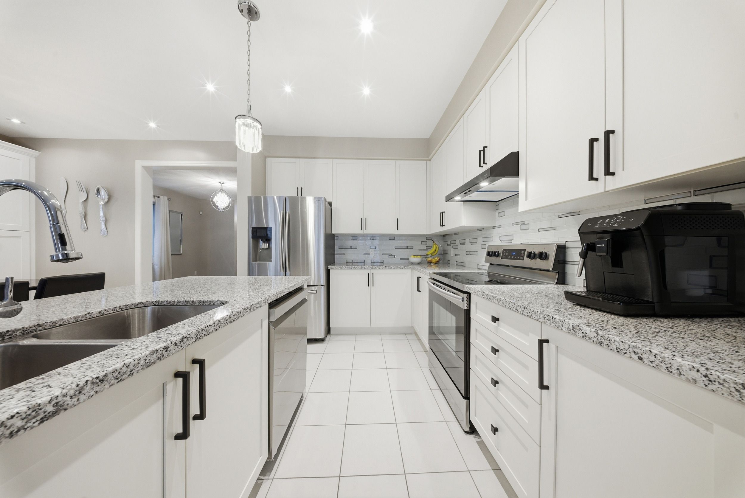 • Stylish kitchen with quartz countertops and stainless steel appliances.