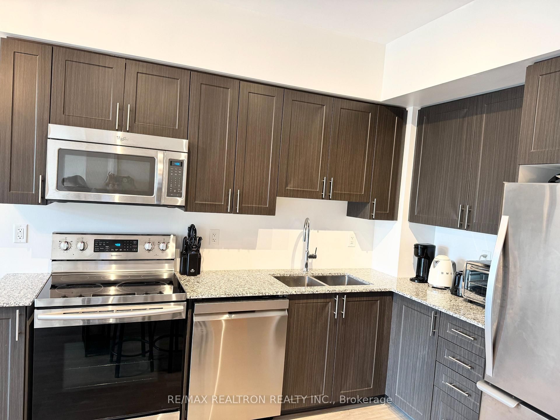 • Modern kitchen with stainless steel appliances and granite countertops.