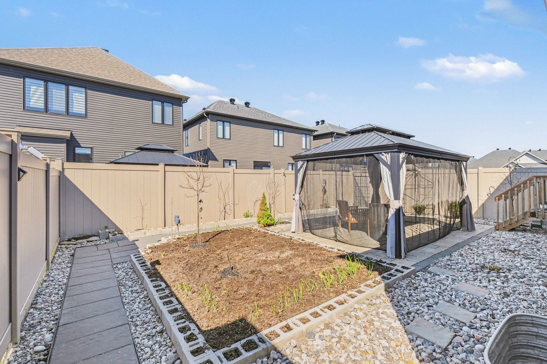 • Fully fenced backyard with patio, gardens, and gazebo for outdoor enjoyment.