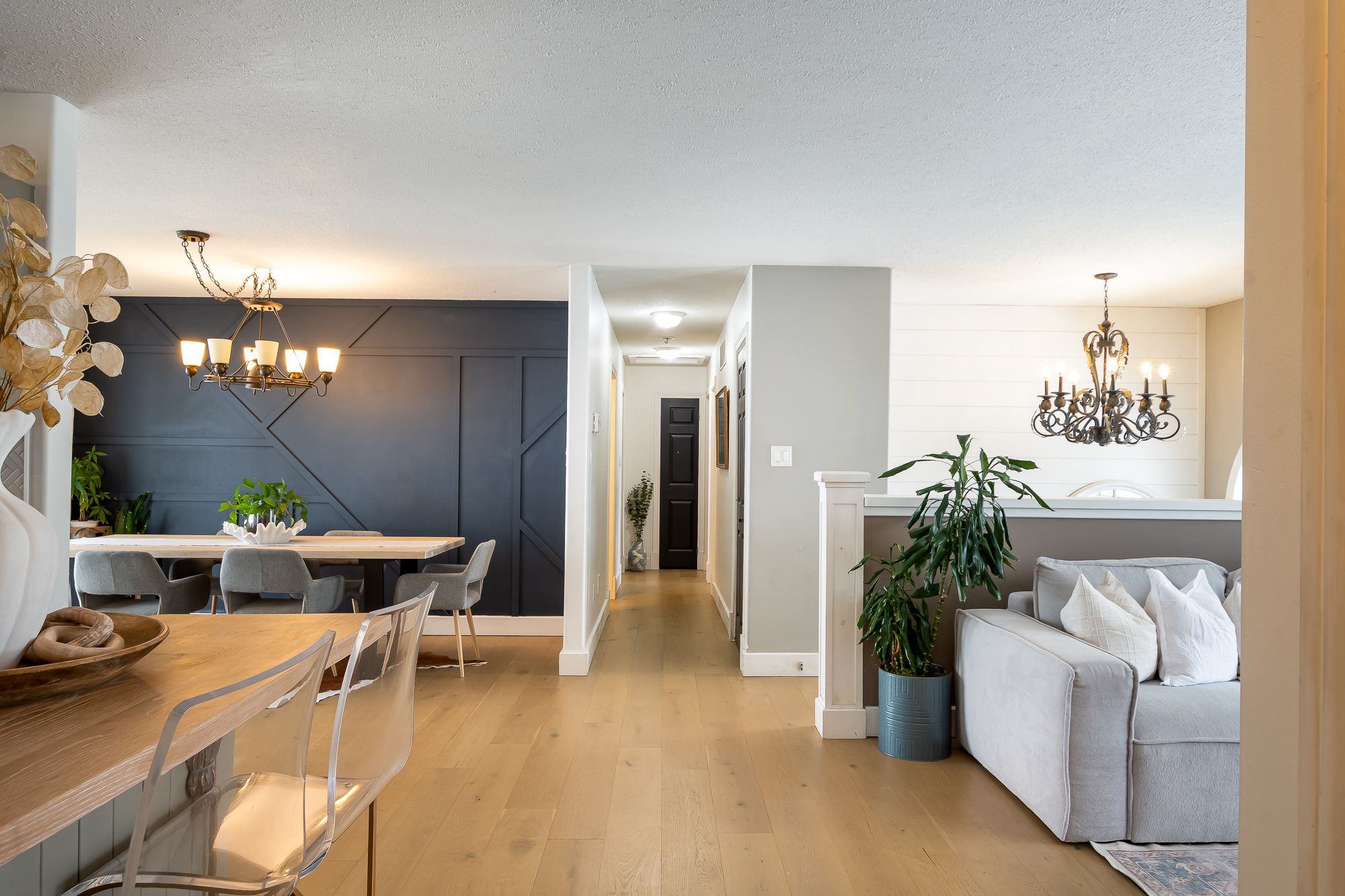 • Bright open concept layout connects living, kitchen, and dining areas.