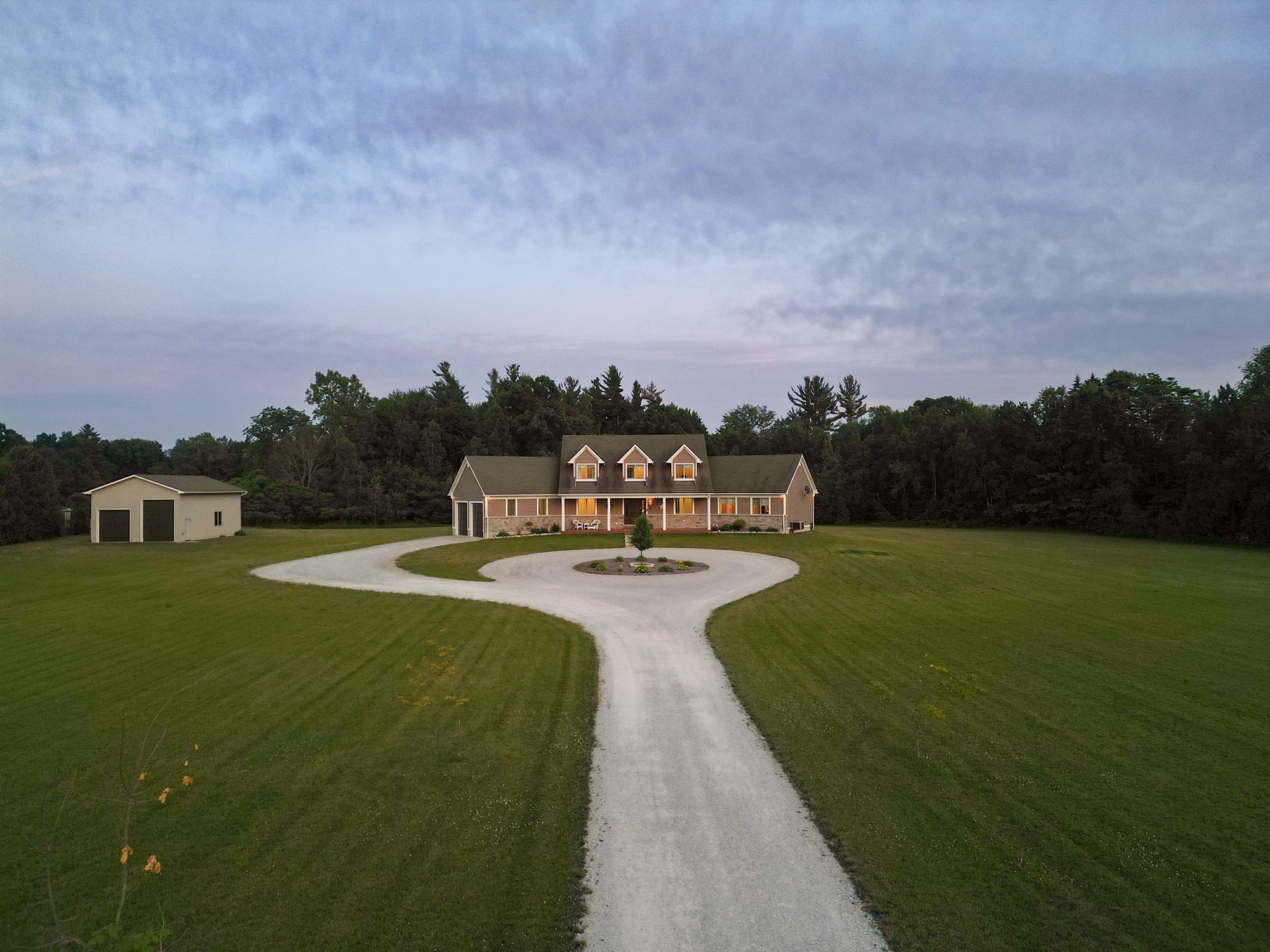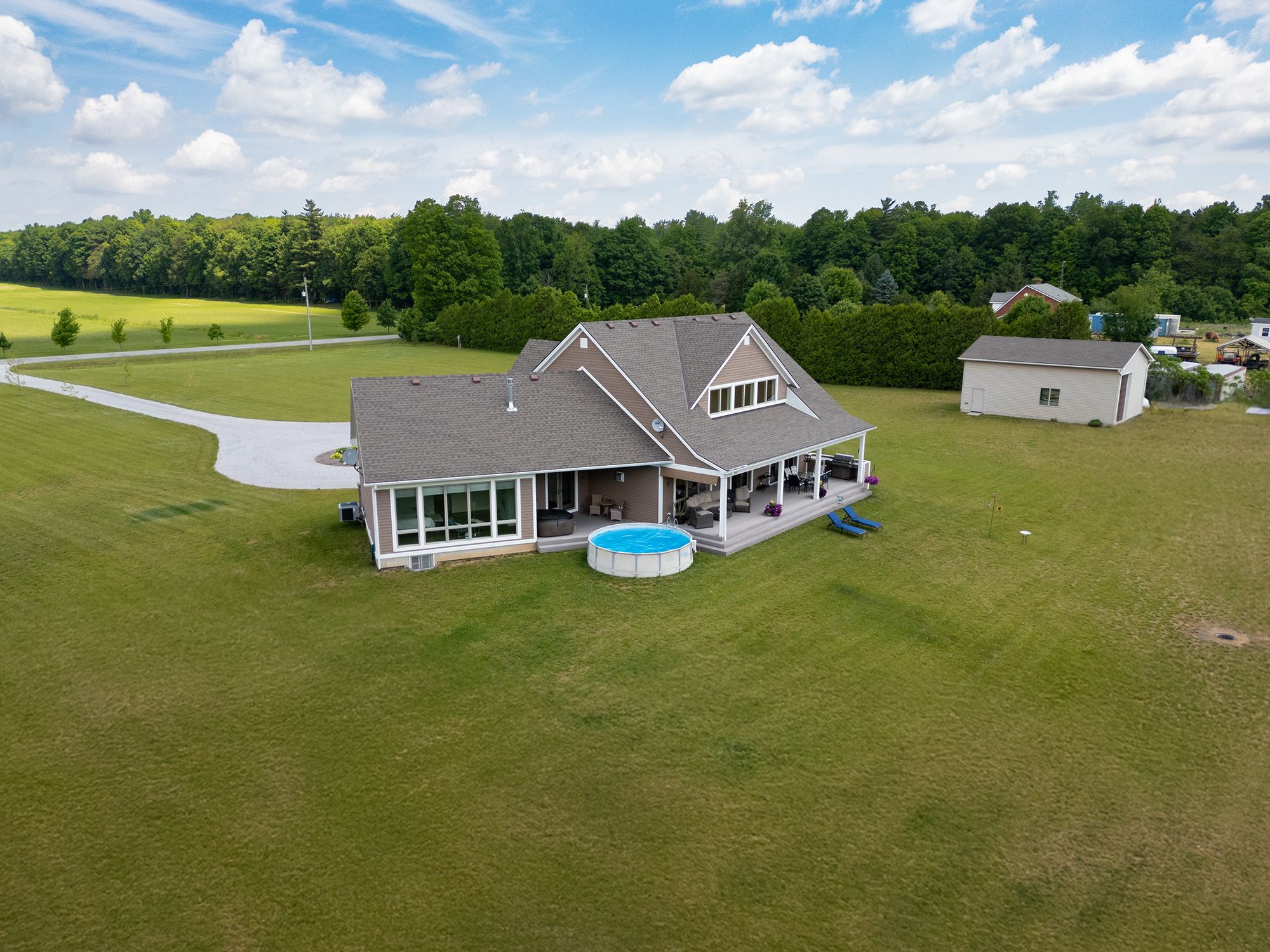 Welcome to your dream home in the heart of norfolk county! Nestled on a picturesque 4. 66-acre property, this custom-built masterpiece blends thoughtful design, modern luxury, and rural tranquility-just minutes from norfolk's beaches, trails, wineries, & local charm. A long driveway leads to this stunning cape cod-style home w/a large front porch. Step inside through a 41"x96" solid mahogany door & be greeted by custom stainless steel & cut glass stair railings w/comfort-rise steps. The main level has 10' ceilings, 8' doors, european laminate flooring, & oversized andersen windows & doors that flood the space w/natural light. A fireplace beneath a soaring 21' ceiling anchors the great room. The chef'skitchen is a showstopper w/quartz countertops, european-style cabinetry w/pullouts & drawer-in-drawer systems, a double-door bar fridge, hands-free moen faucet, & 5-burner propane range w/wifi-connected hood. A massive island & custom pantry wall add both function & style. The main-flr primary suite has private access to the deck, hot tub, & above-ground pool, plus a fireplace, floor-to-ceiling windows, & huge walk-in closet w/chandelier & custom organizers. The spa-like ensuite includes heated floors, freestanding tub, 4'x6' glass shower w/bench, double vanity, riobel chrome fixtures, & quartz finishes. Also on the main flr is a versatile room for bedroom, office, gym, or playroom, a 2-piece powder room, & laundry room w/custom closets & ample workspace, accessible from both foyer & back hallway. Upstairs, a flexible loft overlooks the great room & could become a 4th bedroom. A full bath w/double sinks, quartz counters, & rainfall shower, plus a large front-facing bedroom, complete the level. Bonus: a detached shop w/insulated steel drive-through doors (10x14 and 10x10), 16' ceilings, 60-amp panel, rv receptacle,andersen windows, & fibreglass shingles. This 5-star plus energy rated home offers unmatched quality, peace, & privacy. A true norfolk county gem.