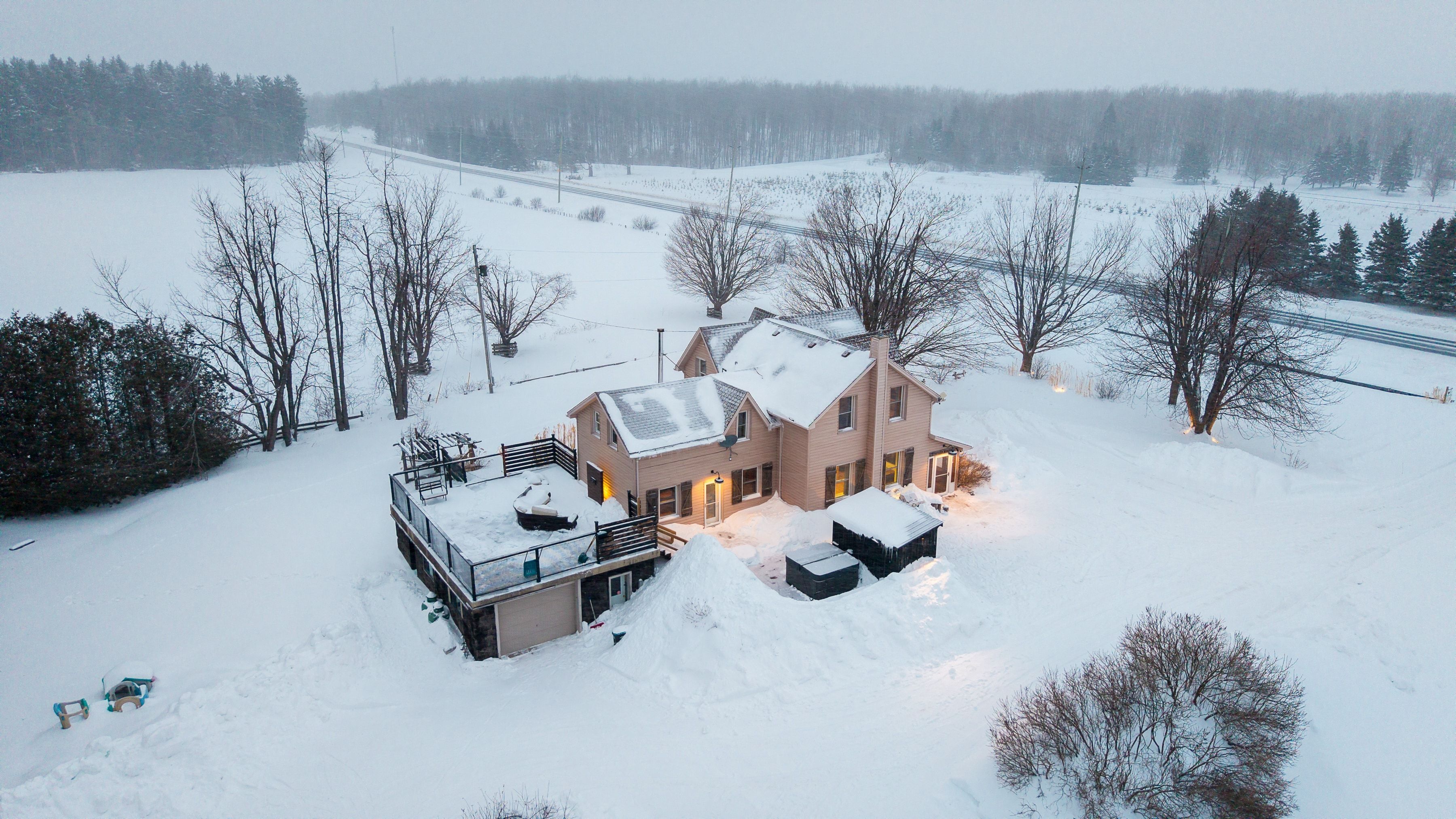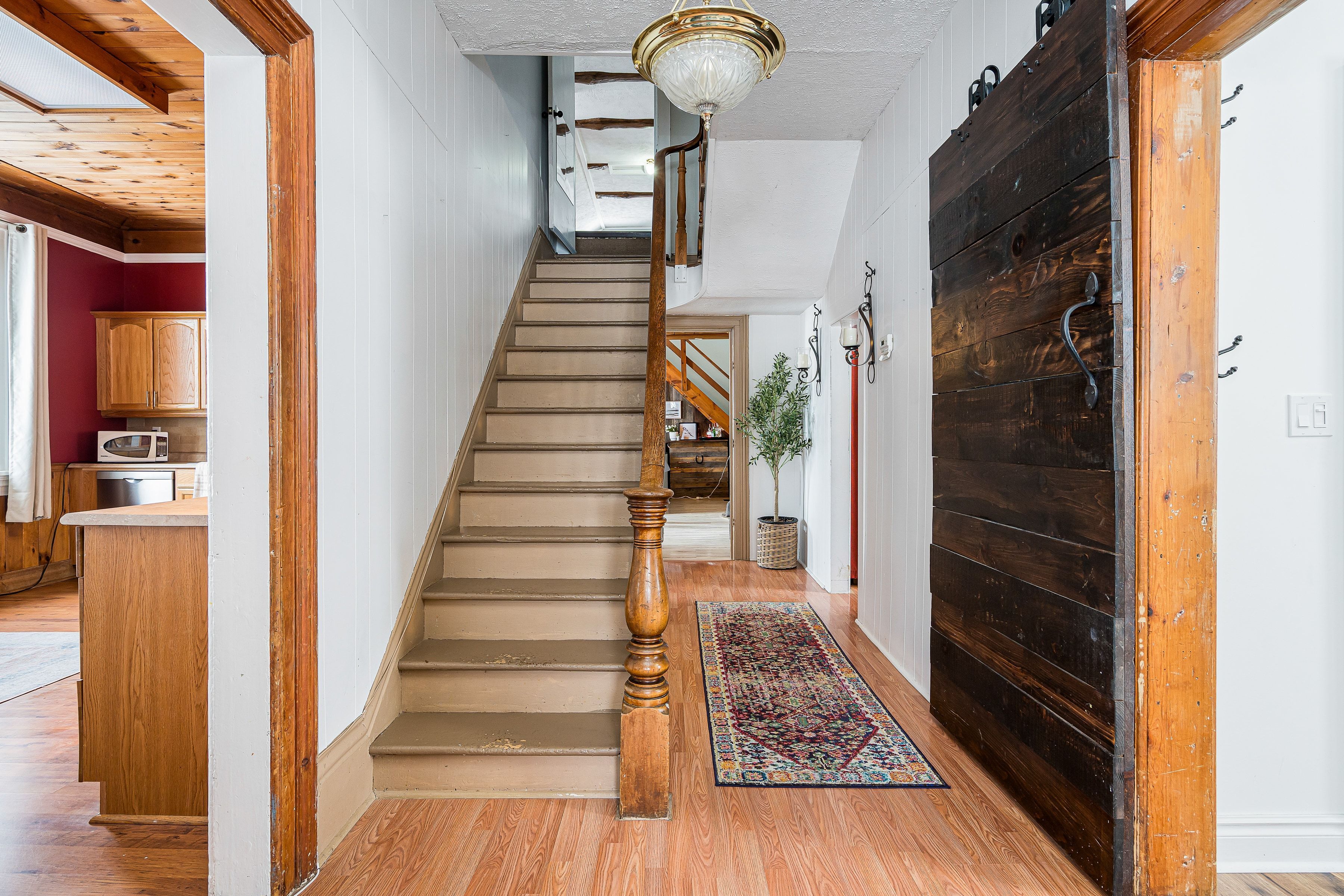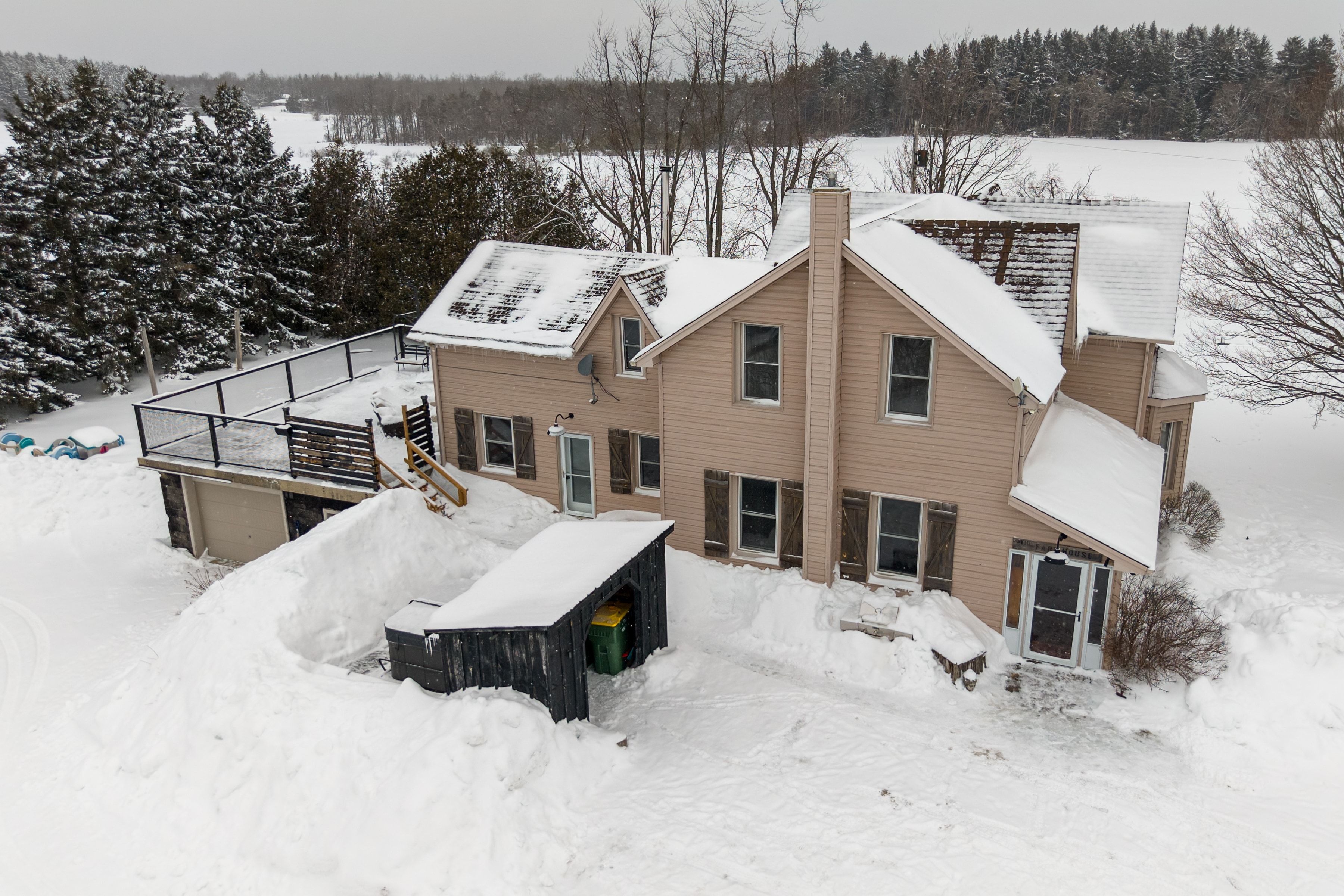 Set on a fully gated and beautifully landscaped 1. 5 acre property near singhampton, this 1905 country farmhouse offers a rare blend of historic character and privacy. The circular back driveway and mature landscaping create a sense of calm upon arrival, while the covered front porch/mudroom welcomes you inside. A central hall with approximately 9'8" ceilings sets the tone for the home's warmth and craftsmanship. The south-facing farmhouse kitchen is the heart of the home, featuring a generous dining area and a propane gas fireplace that creates a cozy backdrop for everyday living and entertaining. Multiple main-floor living spaces offer flexibility for family life, hosting guests, or working from home, while the inviting living/recreation room is accented with natural wood details and anchored by a wood-burning stove. Practical updates enhance functionality, including a dedicated main-floor laundry room and an attached garage that has been thoughtfully finished to include an office or gym -professionally wired, making it ideal for a home-based business or creative workspace. Upstairs, two separate staircases lead to four generously sized bedrooms, including two with built-in closets, offering comfortable accommodation for family and guests. The outdoor spaces are equally impressive: relax and unwind in the hot tub, rinse off in the outdoor shower, or entertain on the patio surrounded by extensive landscaping and a peaceful water feature. A rooftop patio offers elevated views of the surrounding countryside, while the fully fenced and gated property provides privacy and peace of mind. With ample space for future expansion-such as a pool, horses, or additional outbuildings (subject to approvals)-this property offers the freedom to grow and evolve. Ideally located for outdoor enthusiasts, the home is minutes from year-round recreation and trails, yet conveniently close to everyday amenities: a perfect balance of country living and accessibility.