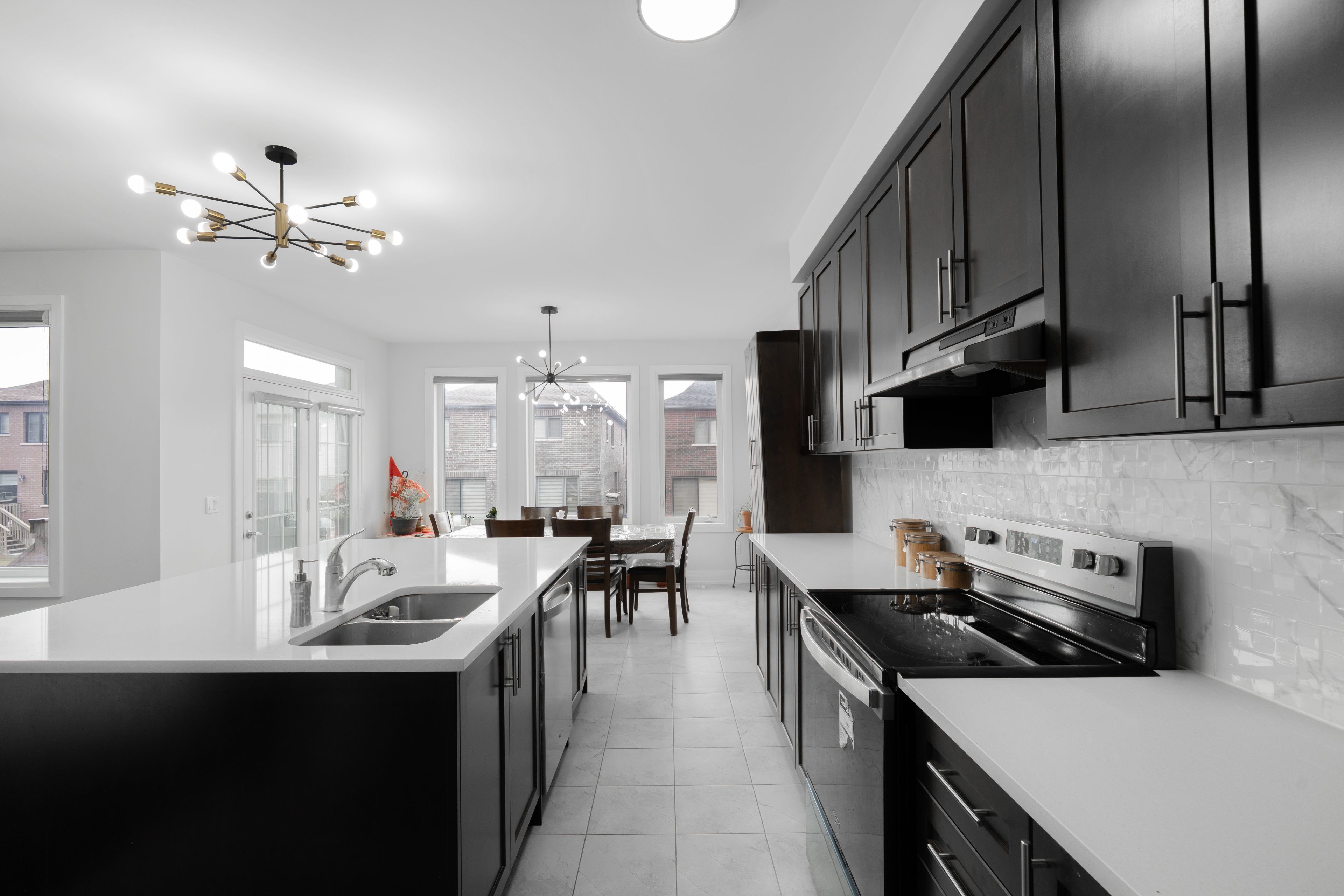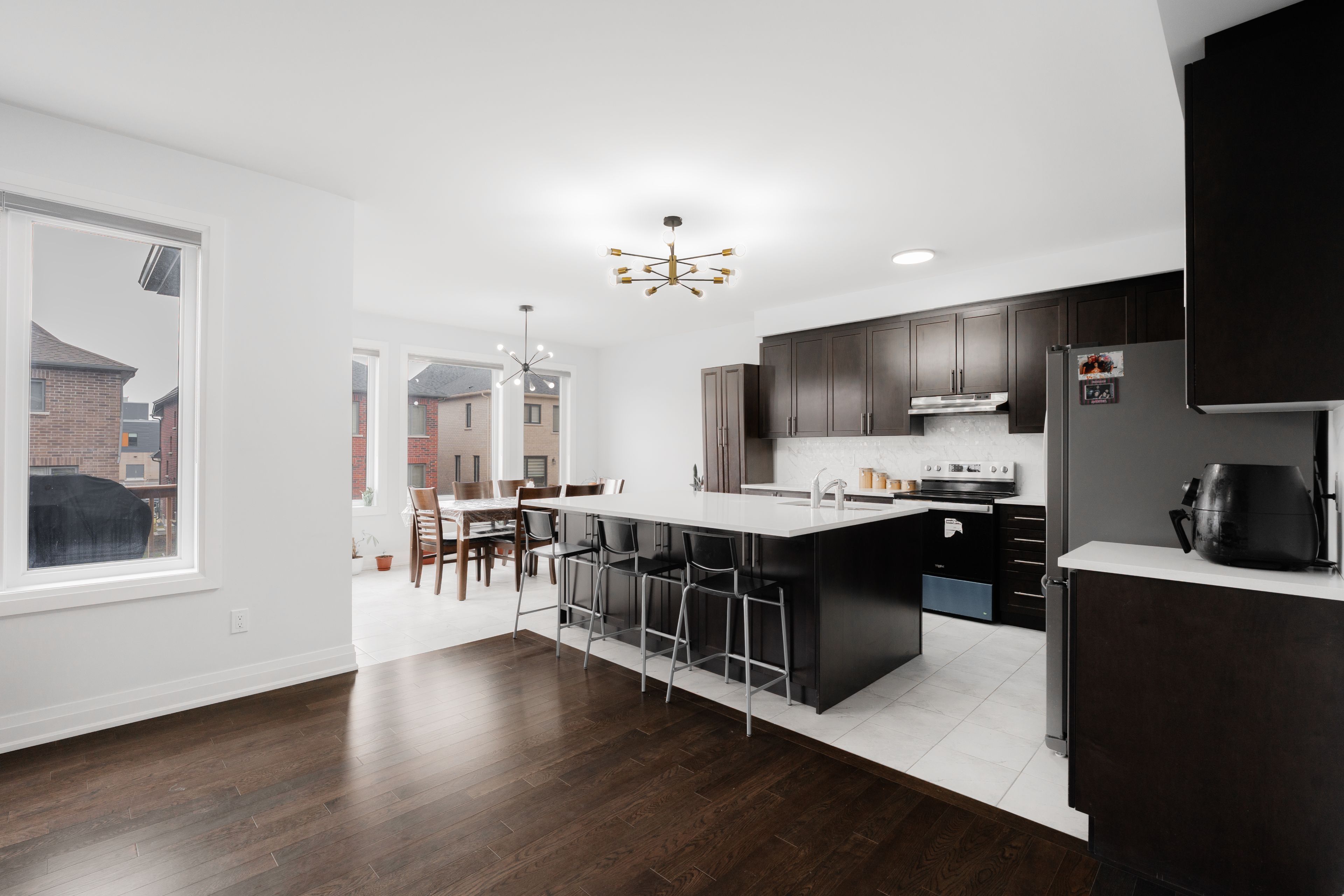 • Open-concept kitchen with an extended breakfast bar and deck access.