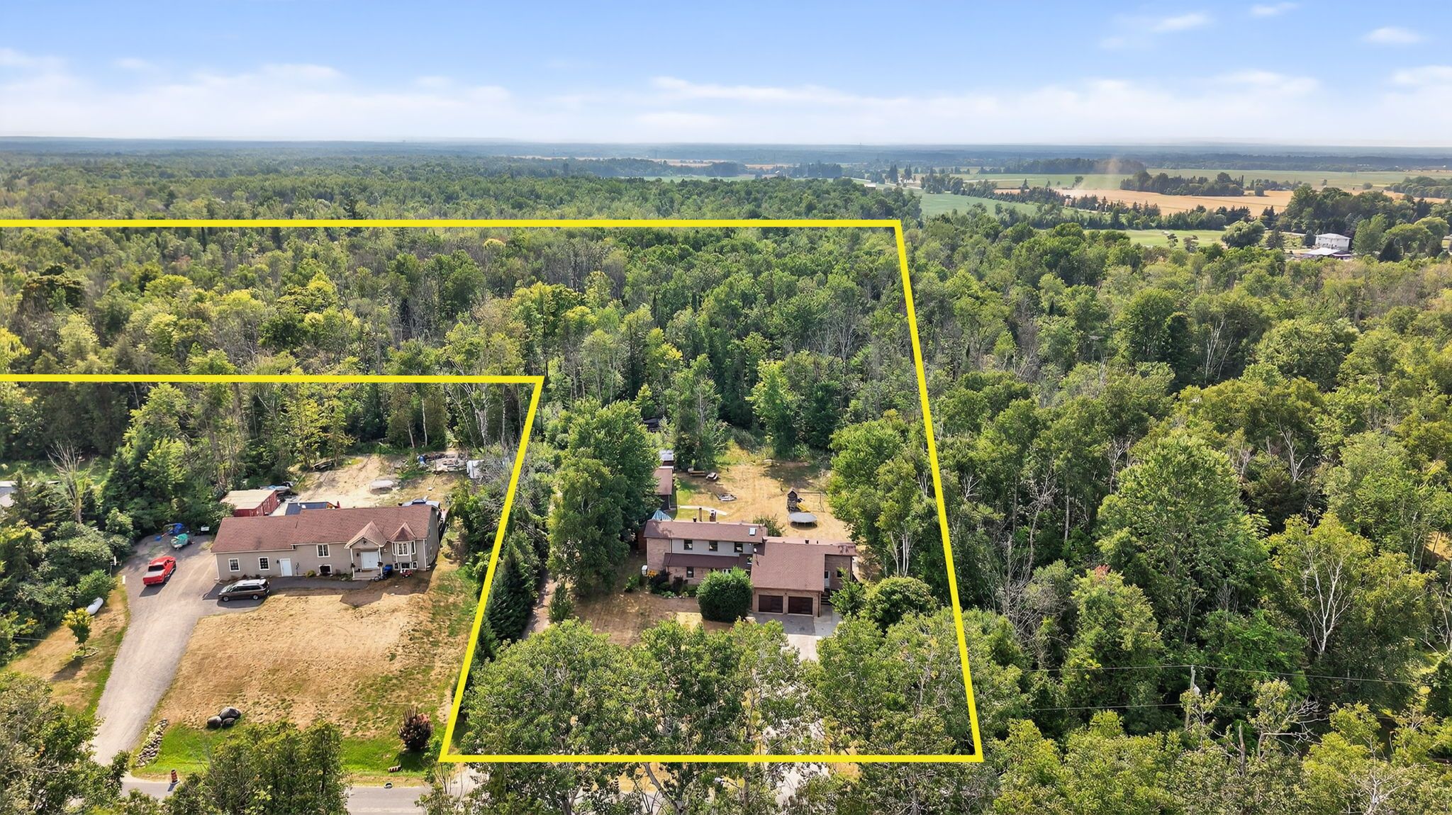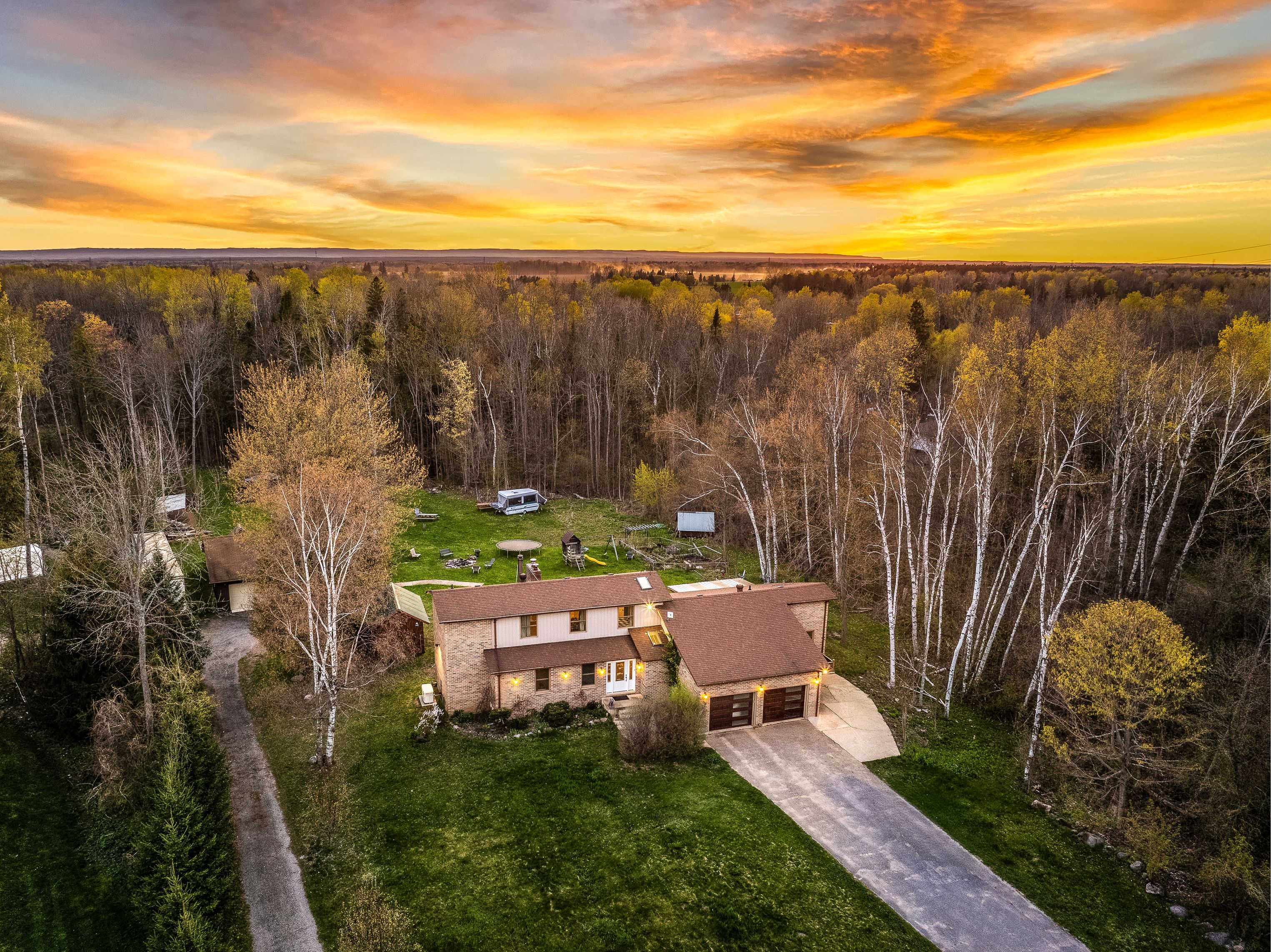 Executive family home nestled on 10 acres of private land with 1,200 sqft detached, insulated workshop with double 7x9ft doors, & a second driveway. Plus bonus 2 bedroom in-law suite with separate entrance! Over 4,800+ sqft of finished living space. Fully renovated in 2020, open flowing main level with porcelain tiles & engineered hardwood flooring throughout. Spacious living room with propane fireplace, & picturesque huge window overlooking backyard with walk-out to backyard deck! Eat-in kitchen features large centre island with quartz counters, porcelain tiles, double sink, subway tile backsplash, pot lights, & is conveniently combined with dining area including a second walk-out to the backyard deck! Main level laundry / mud room with laundry sink & separate entrance. Additional family room & den is ideal for working from home! Plus 2 bedrooms in their own wing with 4 piece bathroom, perfect for guests to stay! Upper level with 2nd bedroom & secluded primary bedroom featuring walk-in closet & 4 piece ensuite with double sinks. Fully finished lower level in-law suite with separate entrance features full kitchen, ensuite laundry, dining area, family & living room, 2 full bedrooms with closet space & new laminate flooring. Backyard with spacious covered pressure treated wood deck with updated railings (2025), garden shed, & tons of greenspace! All updated flooring & trim (2020/2025). Updated kitchen (2020). Freshly painted. Full propane automatic generac generator. 200amp electrical panel w/ 60amp going to detached workshop. Attached garage doors (2020). All windows & doors (2020). A/c (2016). Napoleon oil furnace (2015). Perfect multi-use home, run your business, or generate extra income from multiple sources! Ideal location with tons of privacy, across from conservation land, tons of hiking & riding trails, & minutes from tiffin conservation area, & close to angus & all major amenities including schools, restaurants, groceries, & a short drive to highway 400!