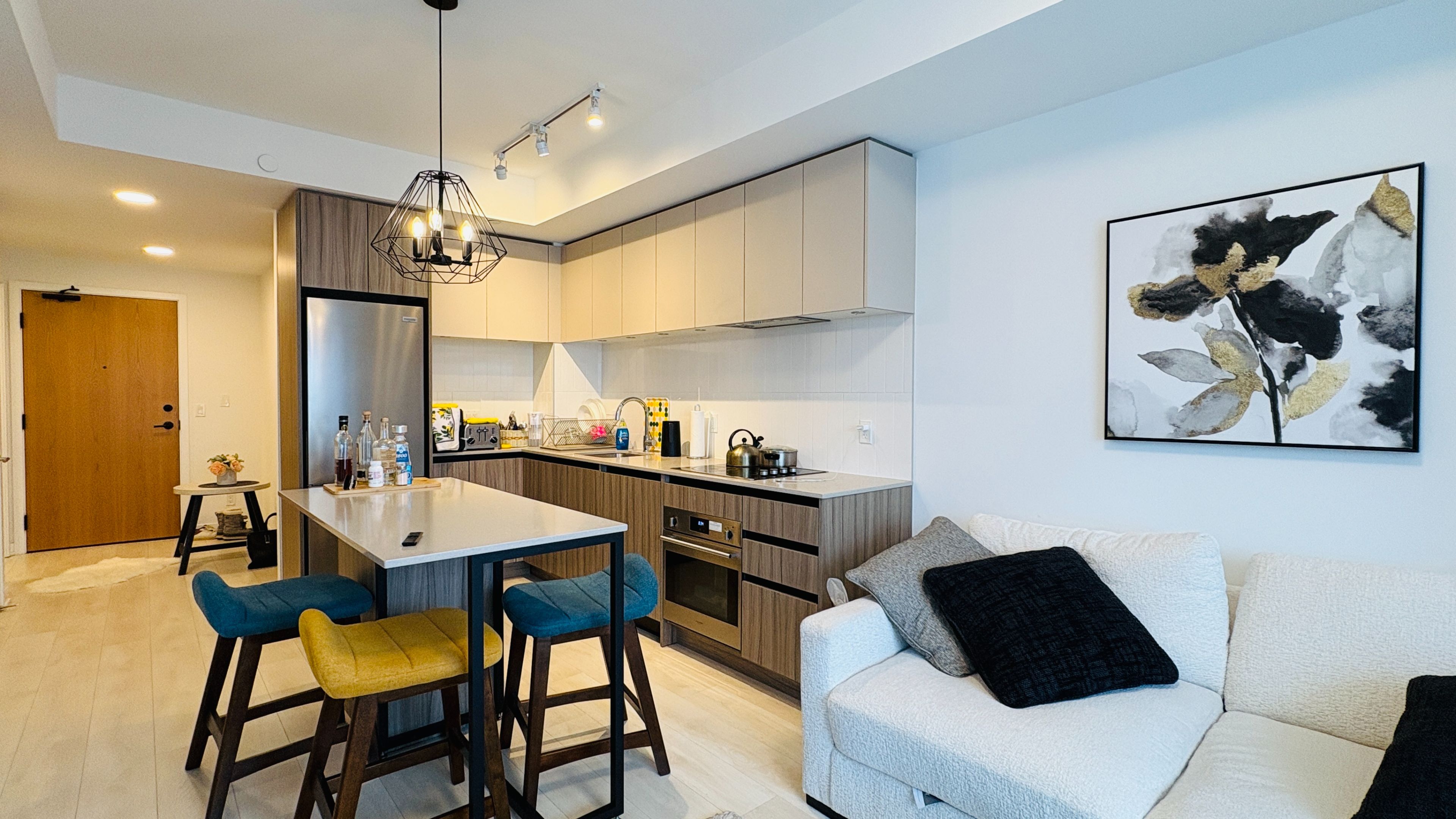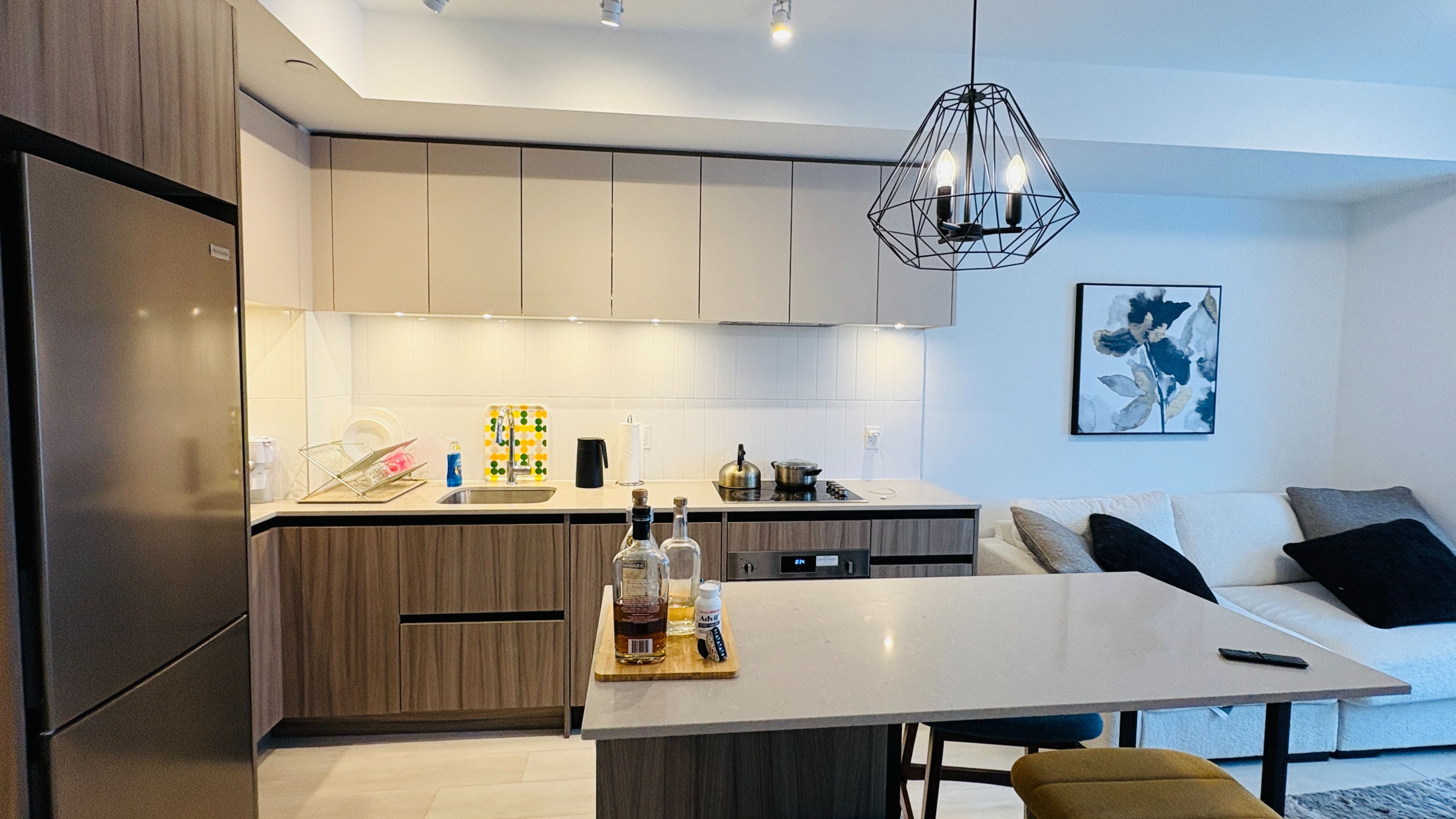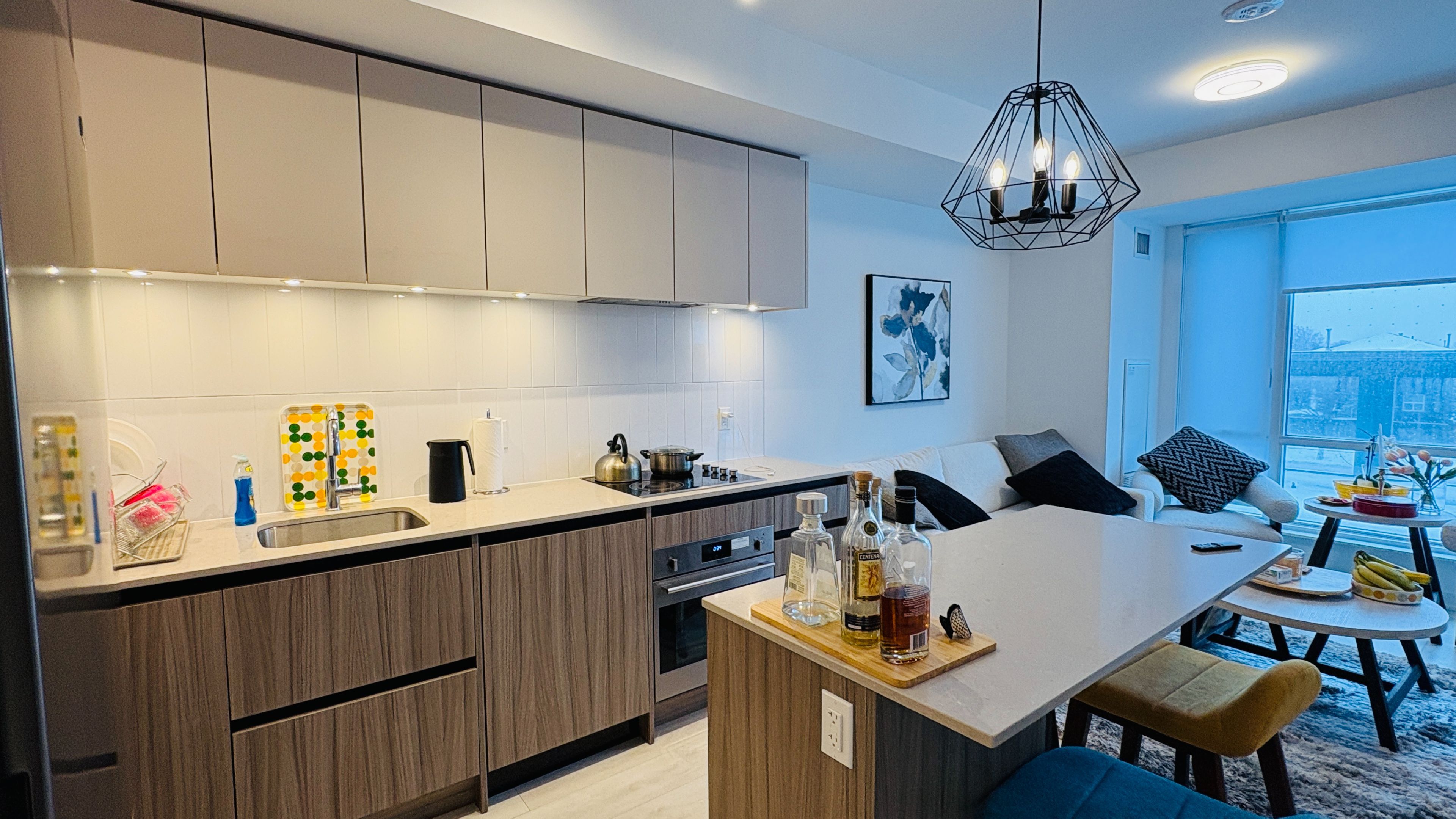 • Modern kitchen featuring quartz countertops and designer finishes.
