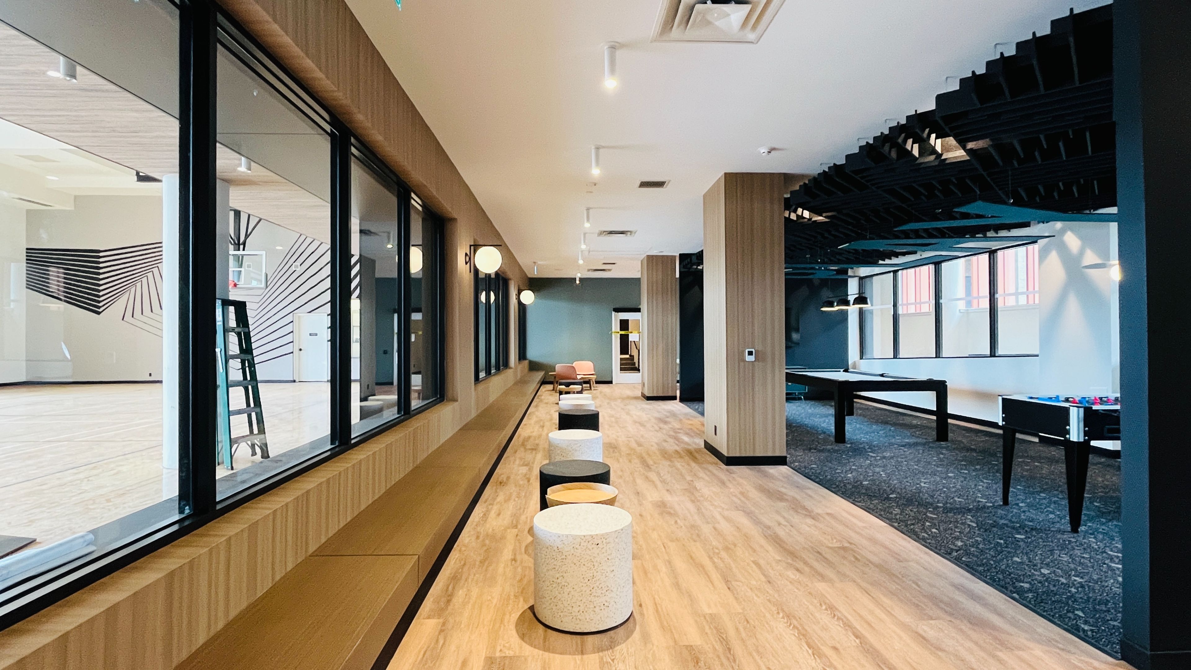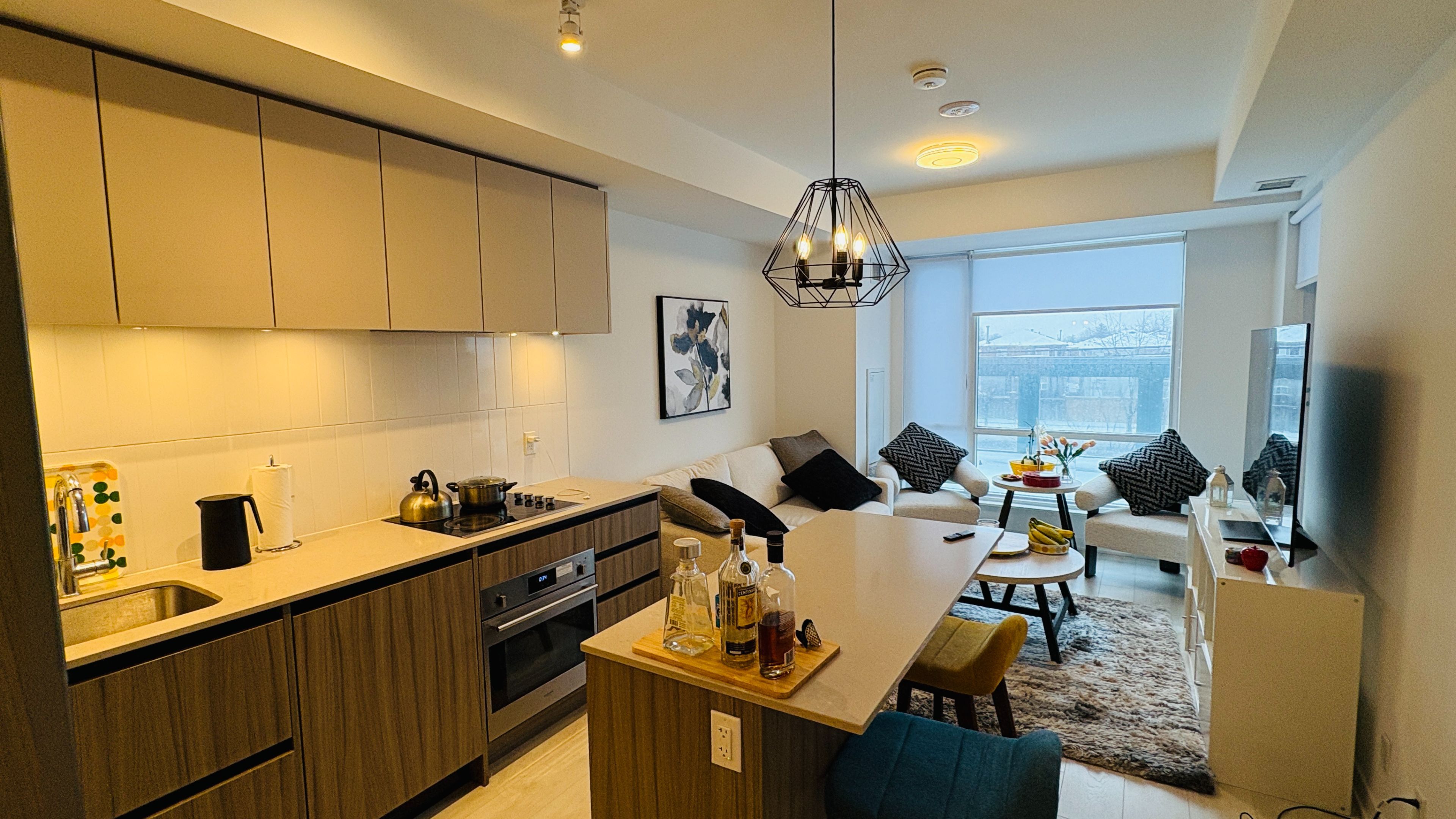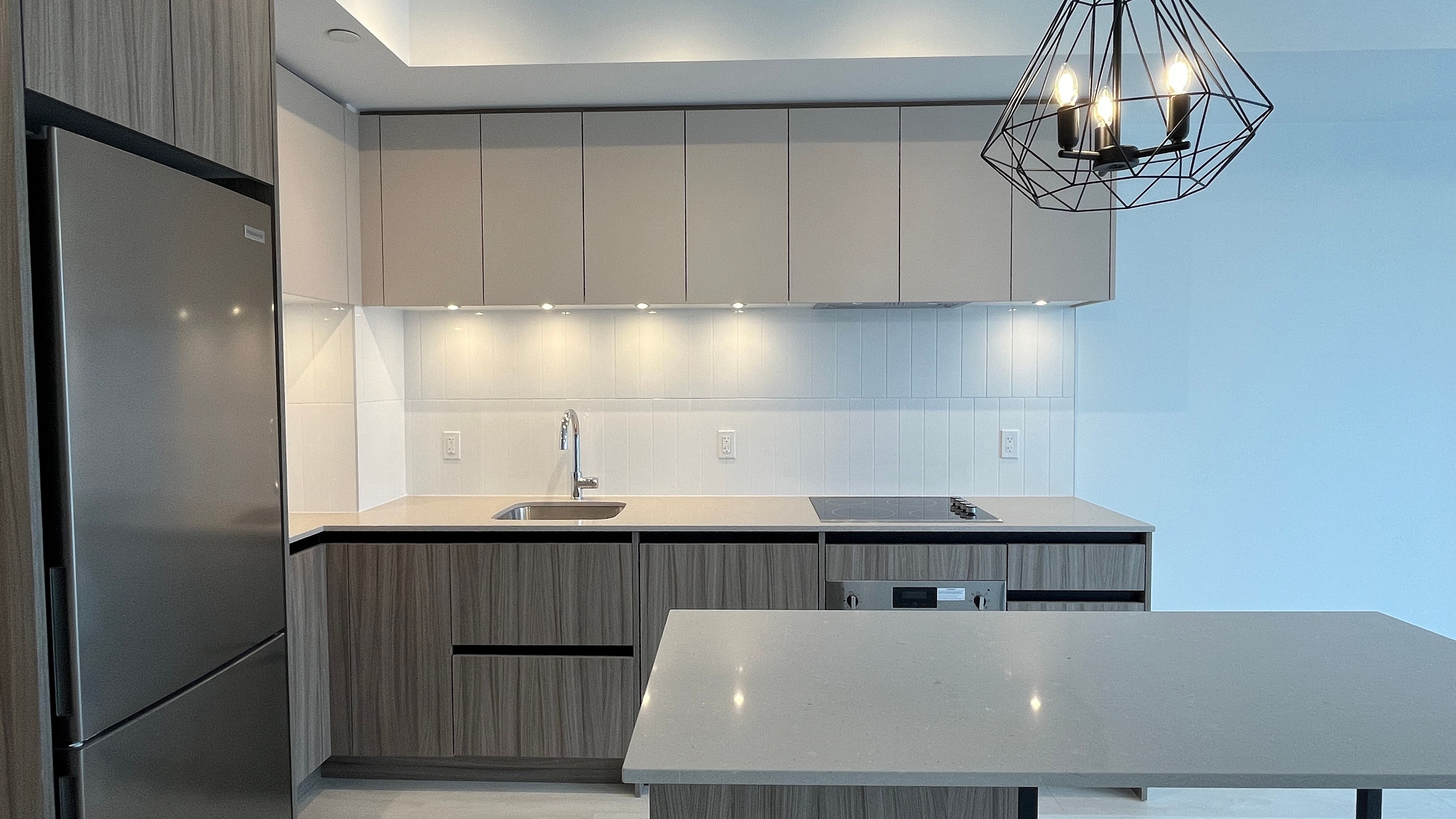 • Modern kitchen featuring quartz countertops and designer finishes.