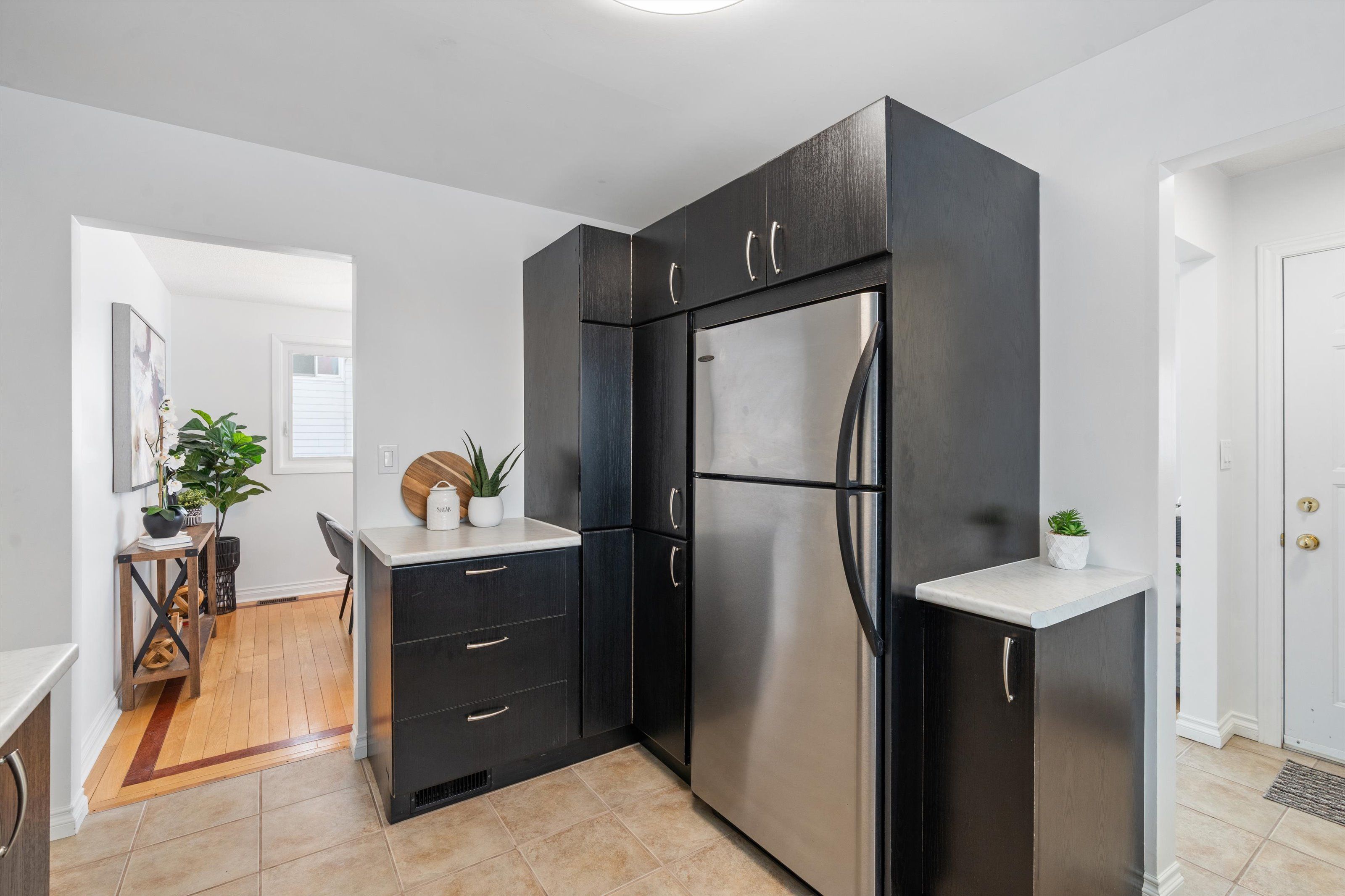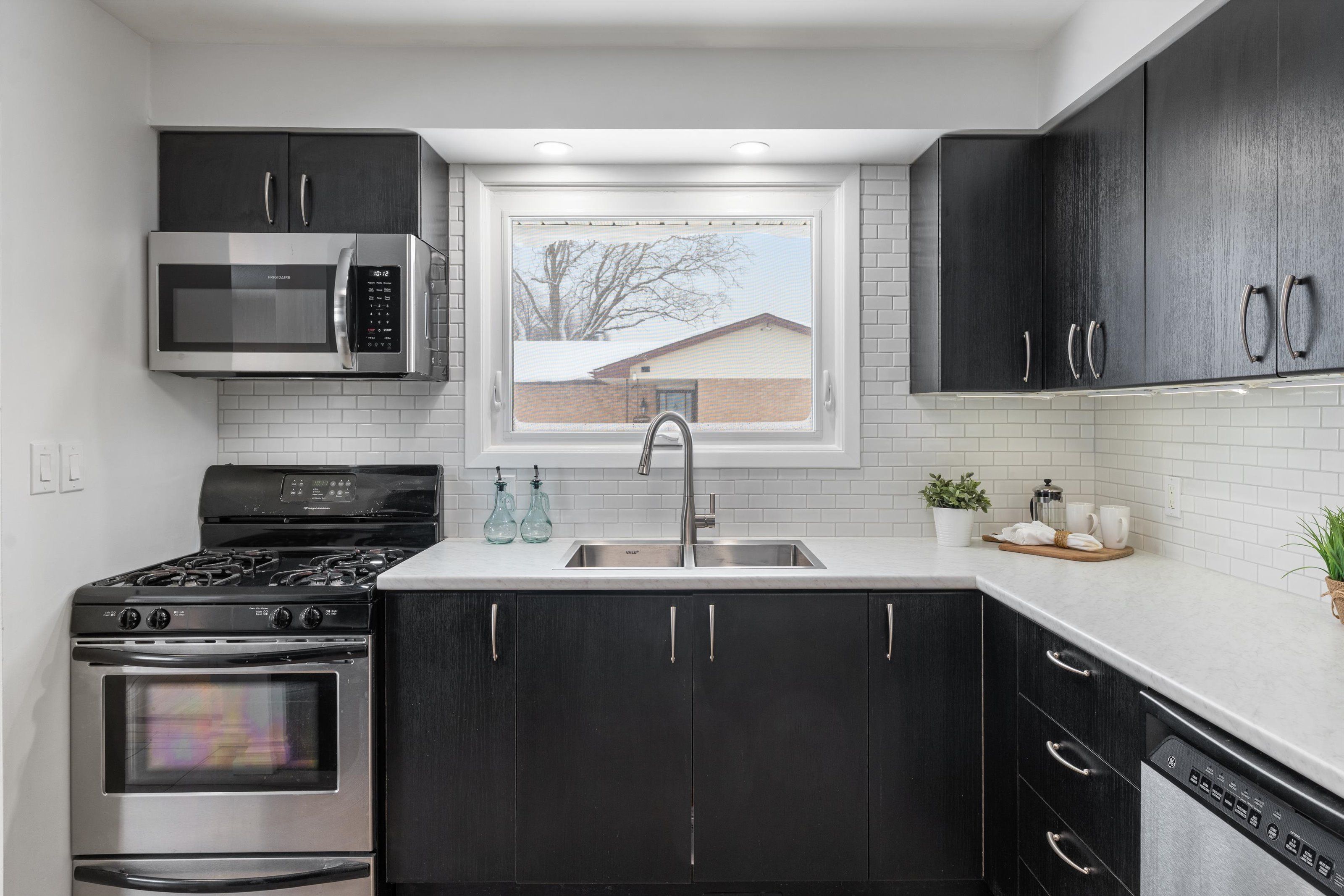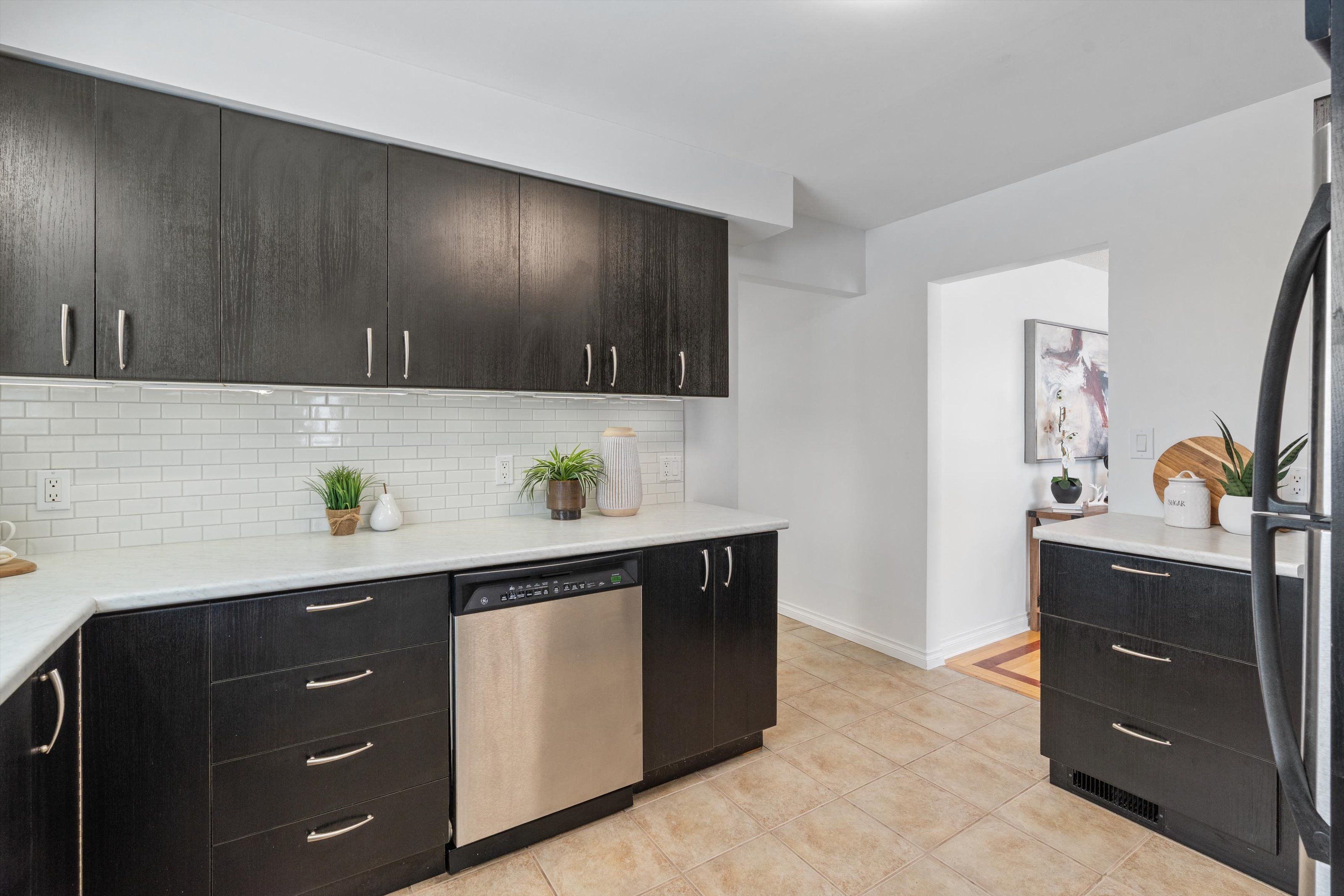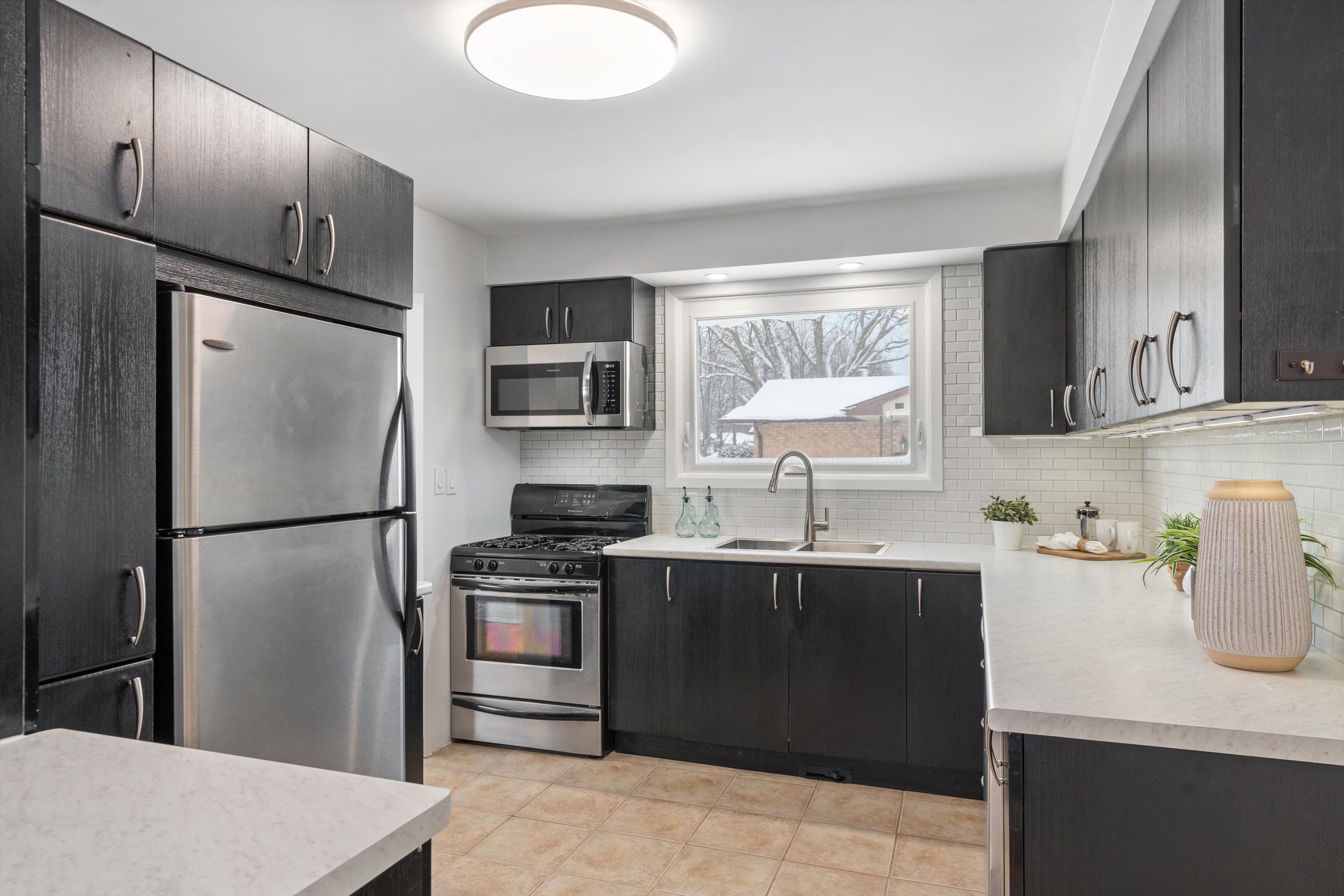 • Bright kitchen with modern countertops and stainless steel appliances.