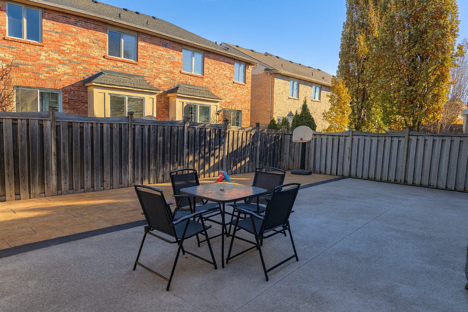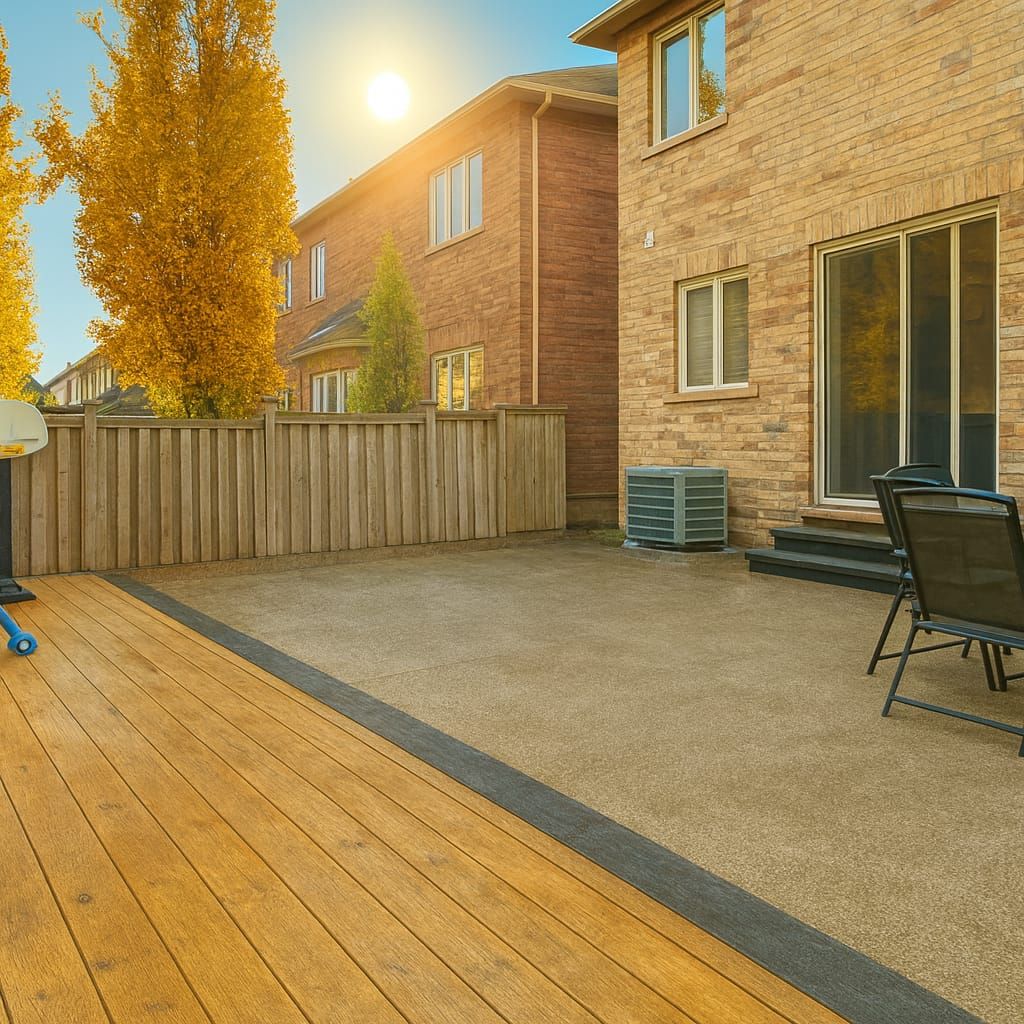 • Backyard designed for entertaining with a wooden deck and concrete features.