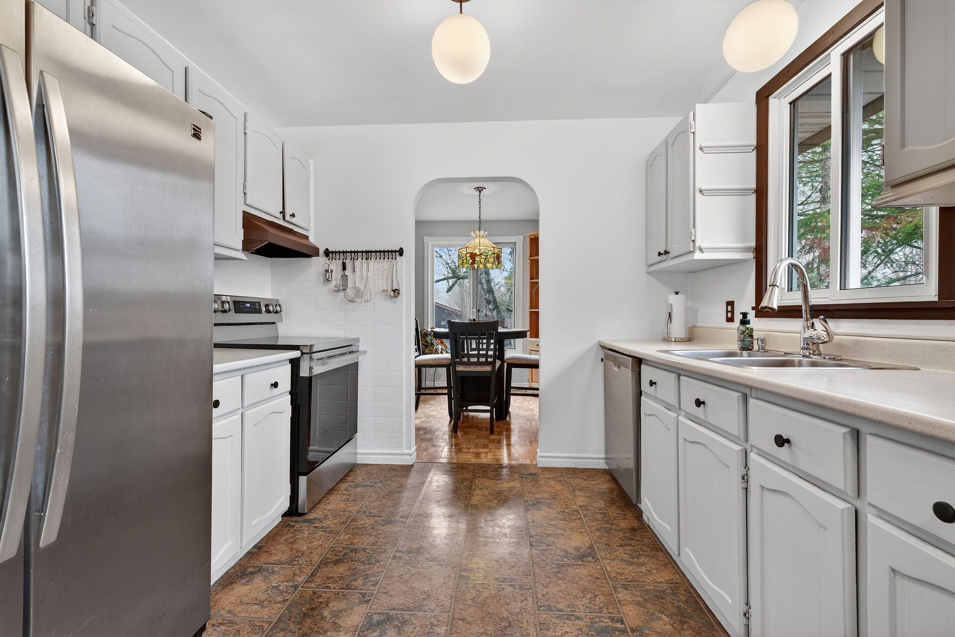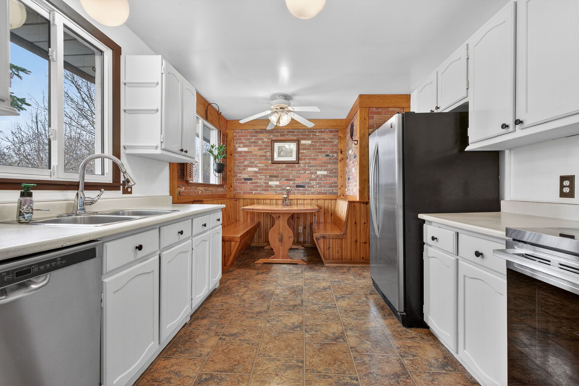 • Large eat-in kitchen with stainless steel appliances and a built-in breakfast nook.