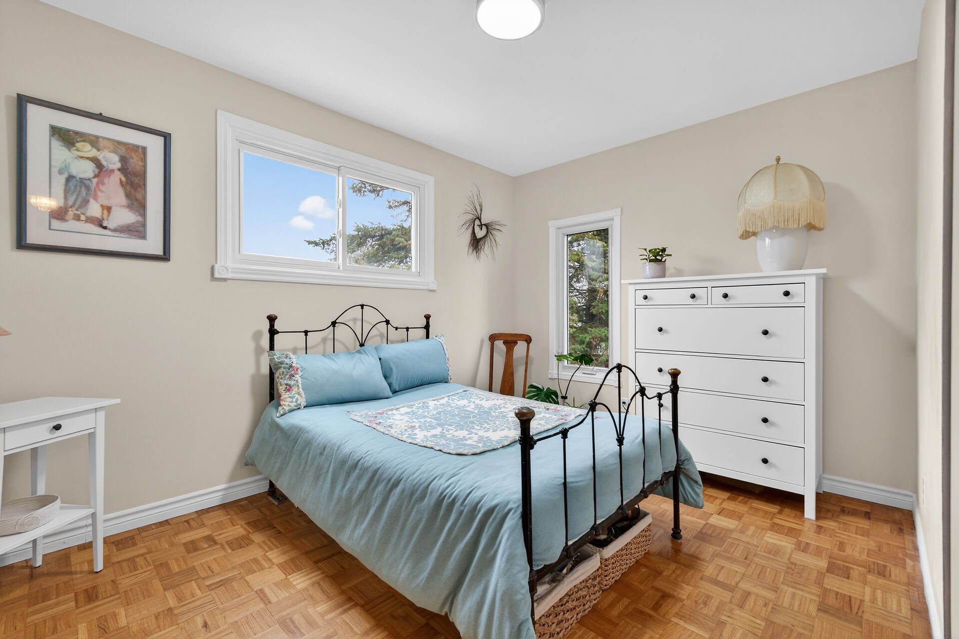 Discover this charming raised bungalow in a highly sought-after west end neighbourhood-move-in ready and meticulously maintained, just waiting for you to call it home. This home features a bright and spacious living area, including a cozy gas fireplace and dining area. The freshly painted, large eat-in kitchen offers plenty of space and includes stainless steel appliances . A standout feature is the character-filled built-in breakfast nook, adding warmth and charm. The main floor is completed by three comfortable bedrooms and a generously sized bathroom, with tasteful wood accents adding a welcoming touch throughout. The lower level expands your living space with a large recreation room, a large bedroom/den, a cold cellar, and a utility/laundry room offering ample storage. With its own separate entrance, this level also presents excellent in-law suite potential. A truly unique feature is the versatile garage, highlighted by large windows and glass garden doors-ideal for transforming into a bright, enclosed sunroom during warmer months. Outdoors, enjoy a beautiful private backyard featuring a spacious cedar deck and perennial gardens-your private retreat for relaxing or entertaining. Conveniently located close to shopping, schools, and amenities, this home offers comfort, character, and flexibility-an exceptional opportunity you won't want to miss!