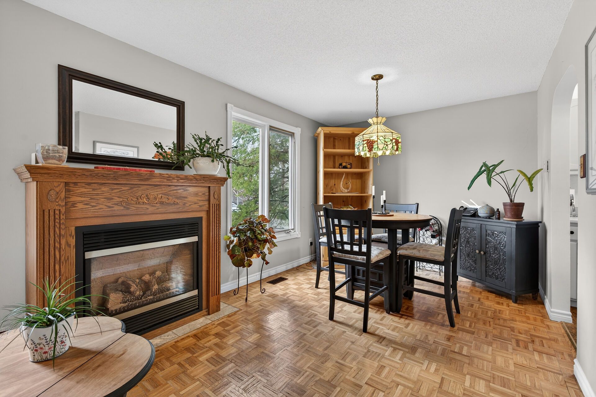 • Bright living area with a cozy gas fireplace and dining space.