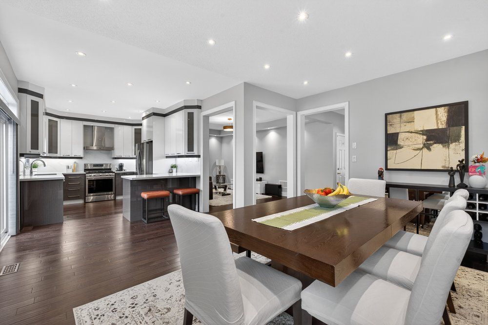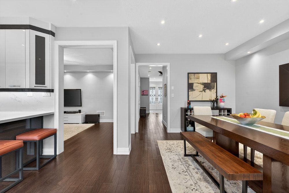 • Elegant entrance with porcelain floors leading to open-concept kitchen and dining.