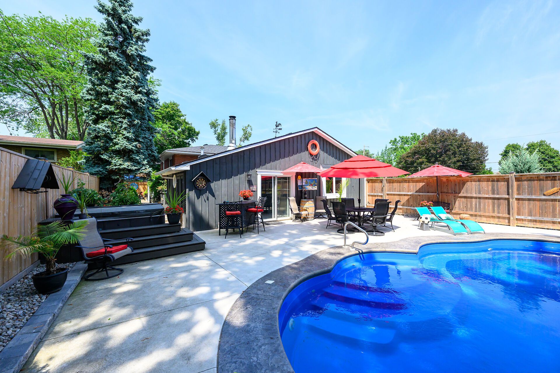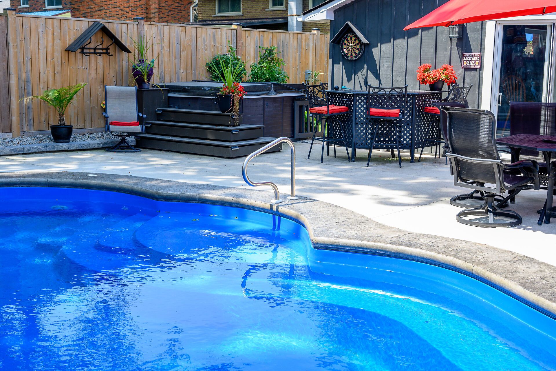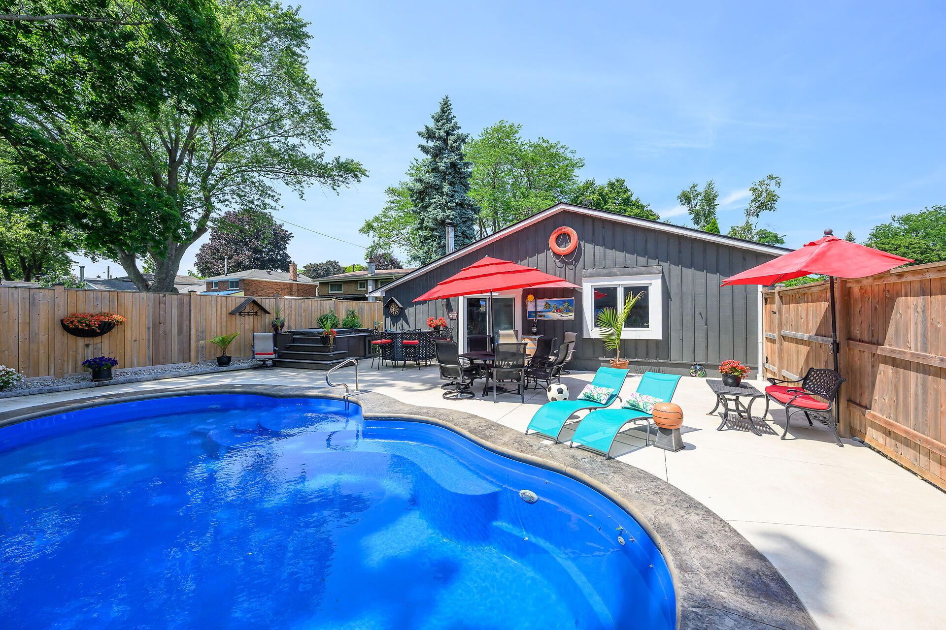 • Private backyard oasis featuring a heated saltwater pool and hot tub.