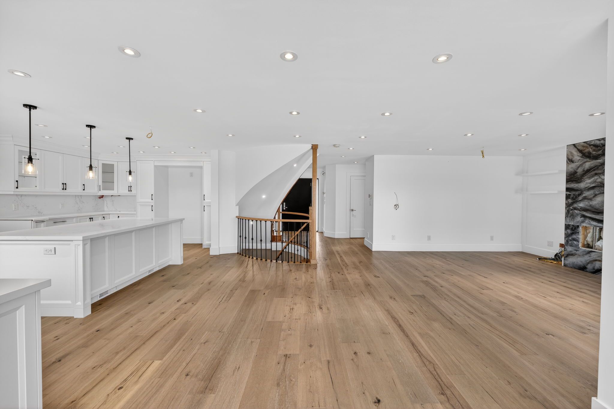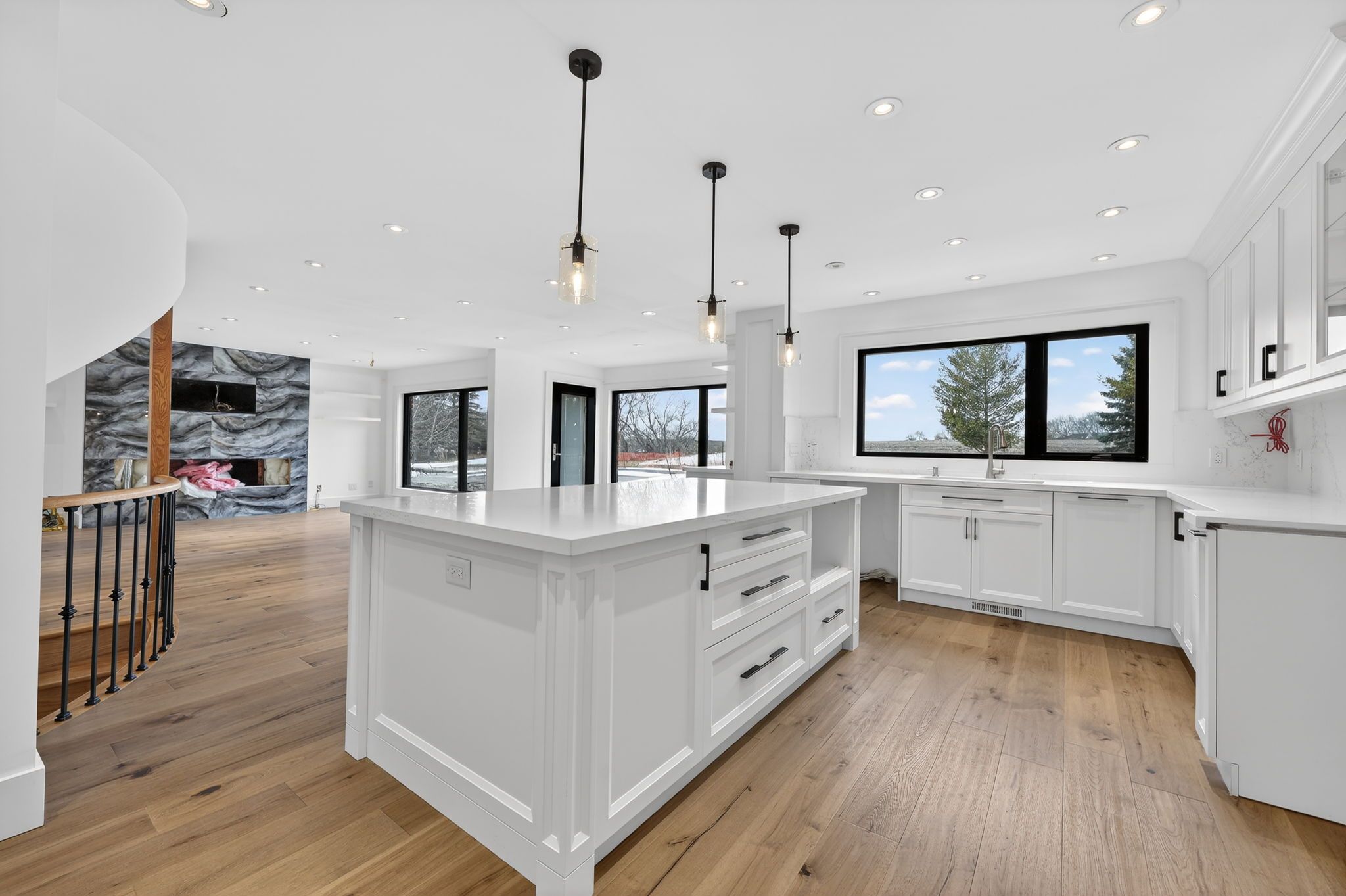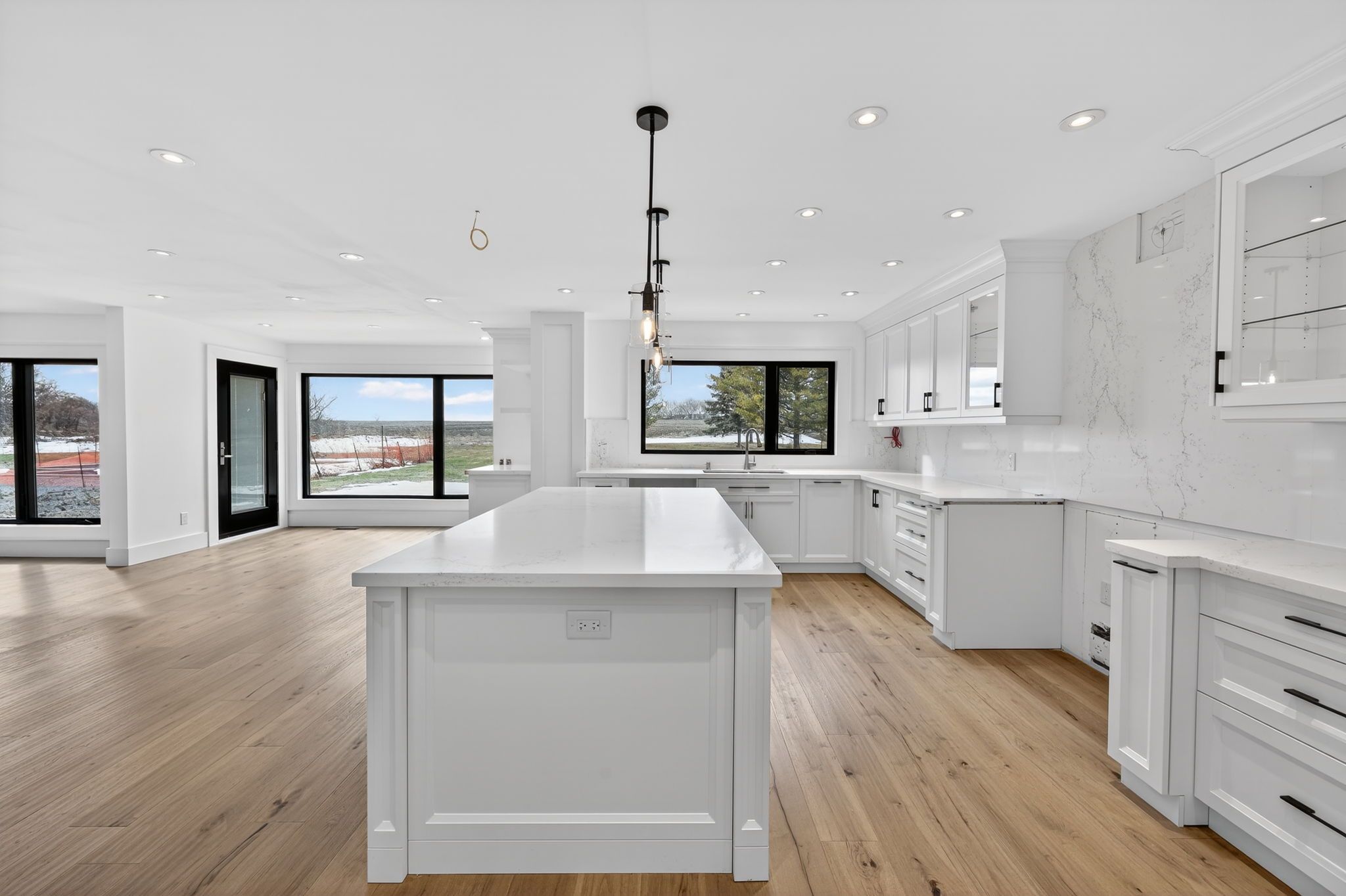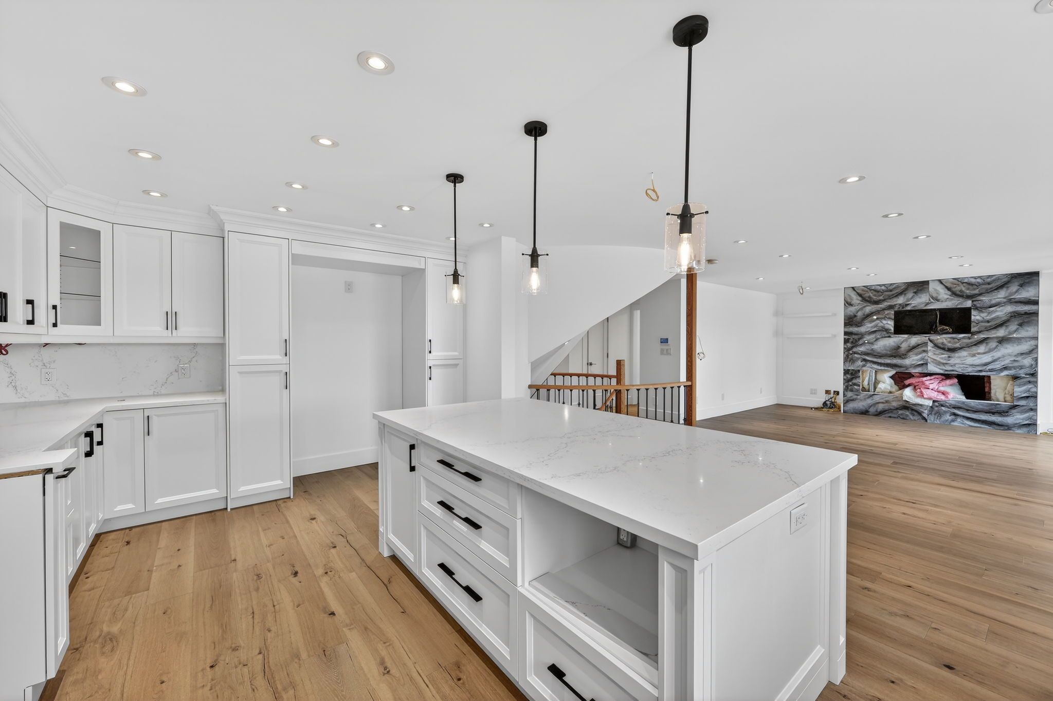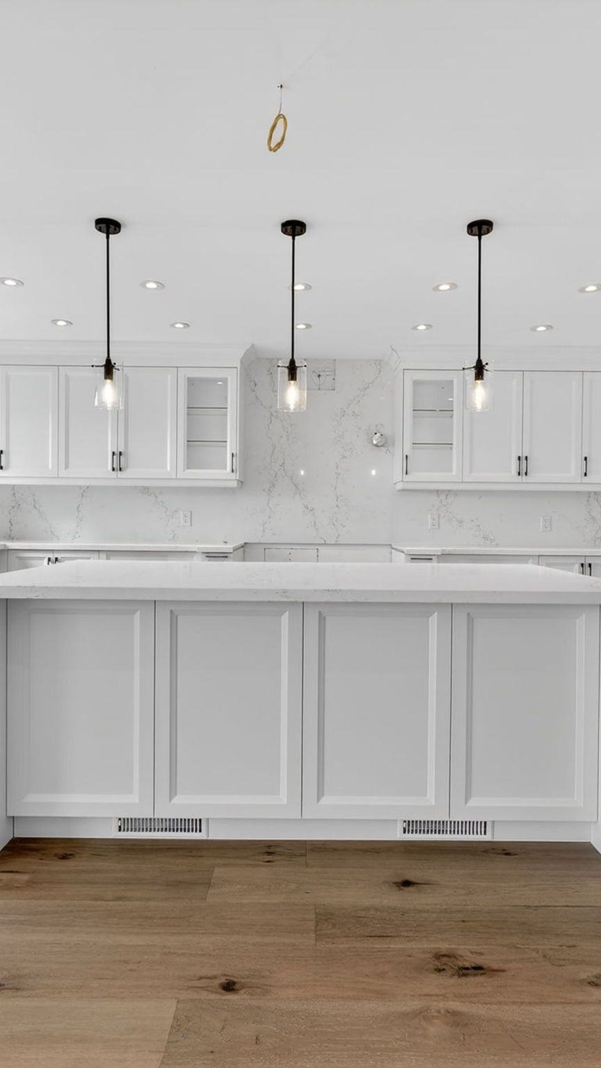 • Modern kitchen with a large island and quartz countertops.