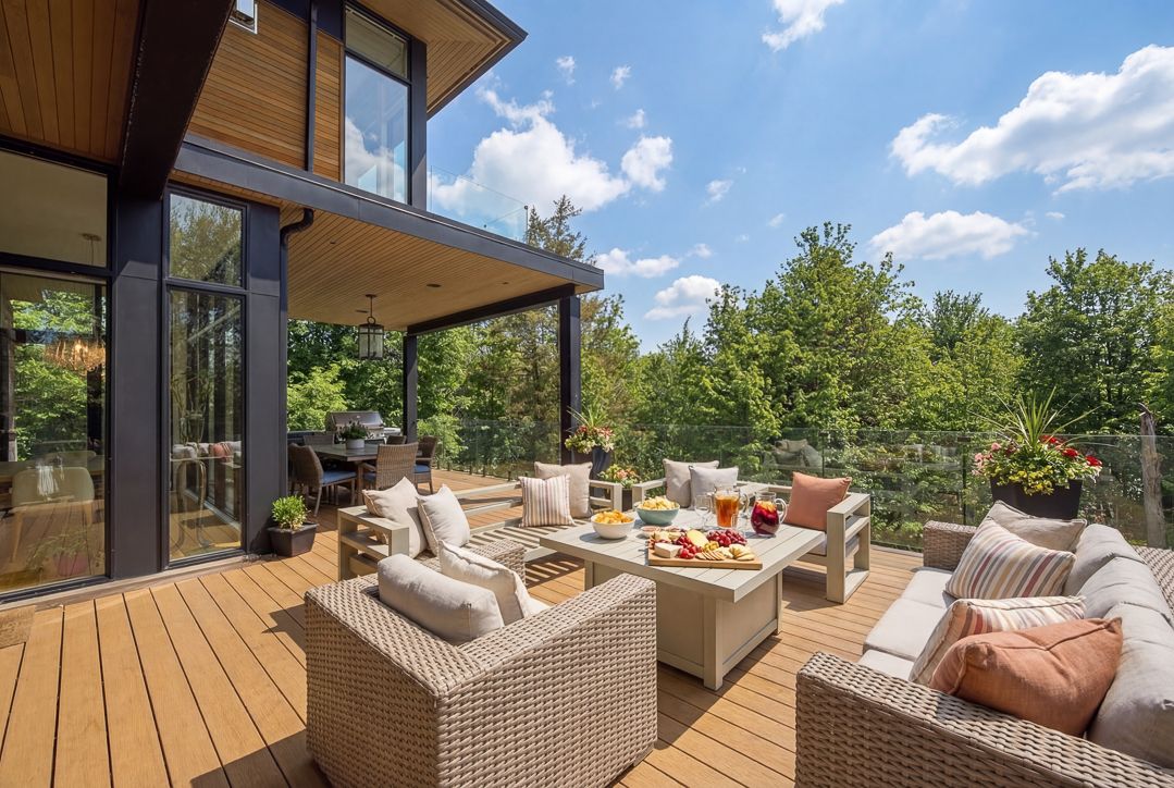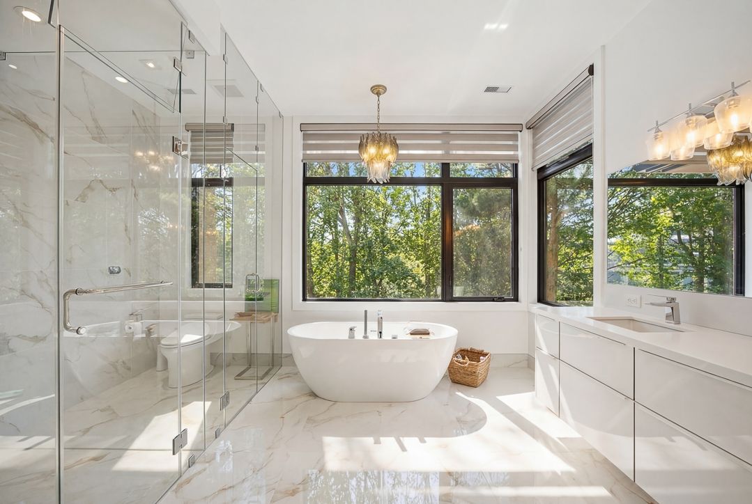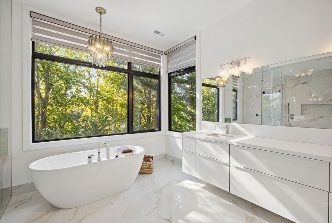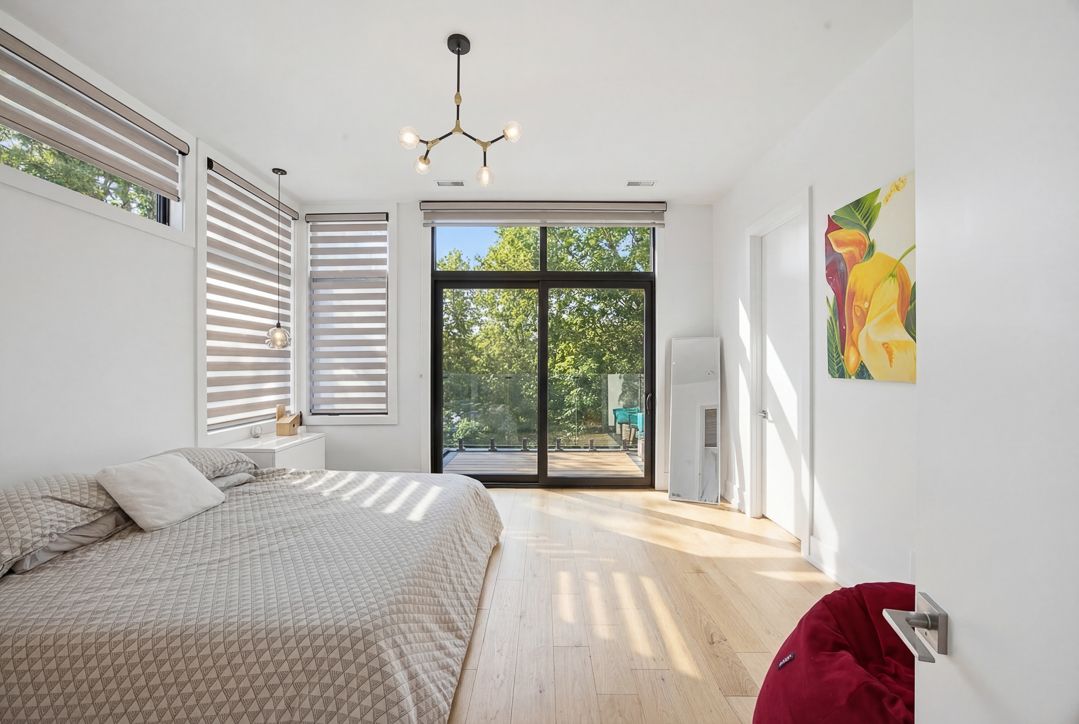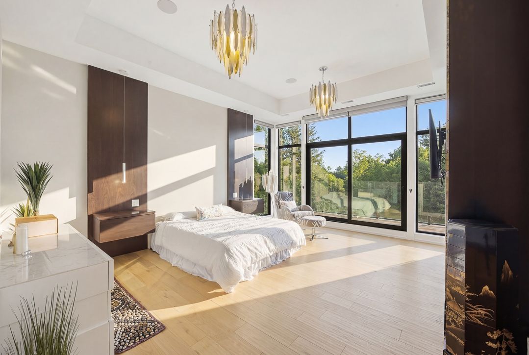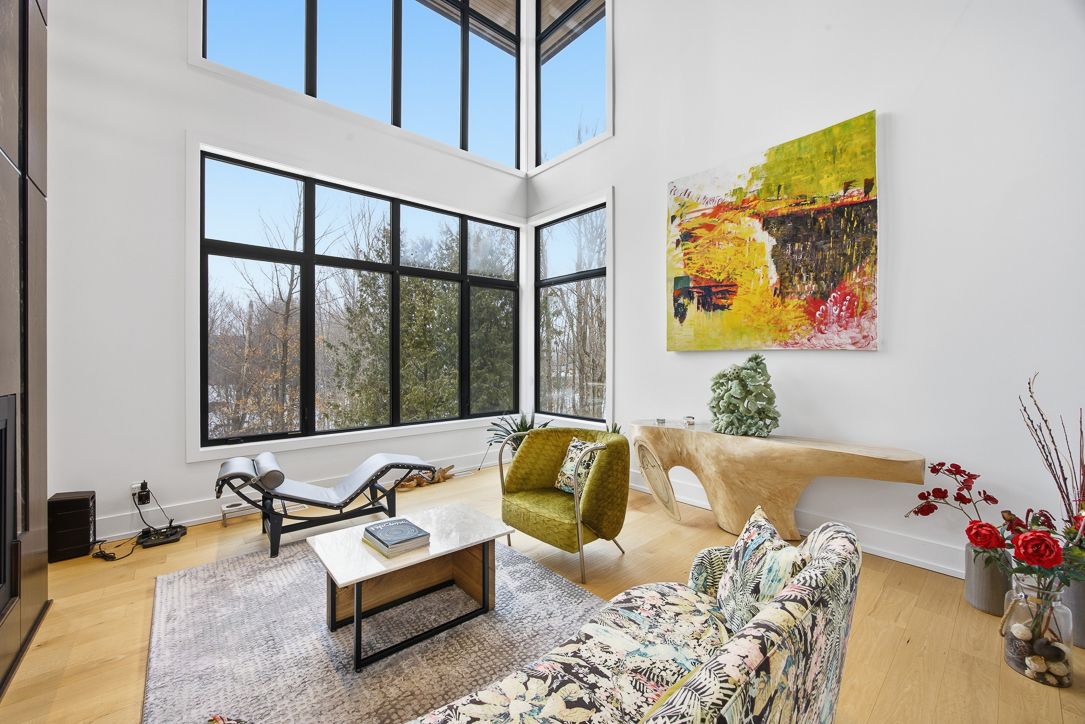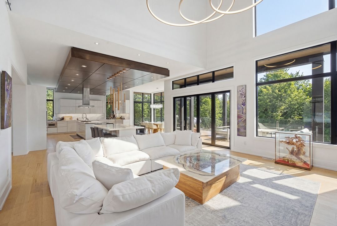 • Open-concept living space with 20-foot windows offering stunning ravine views.