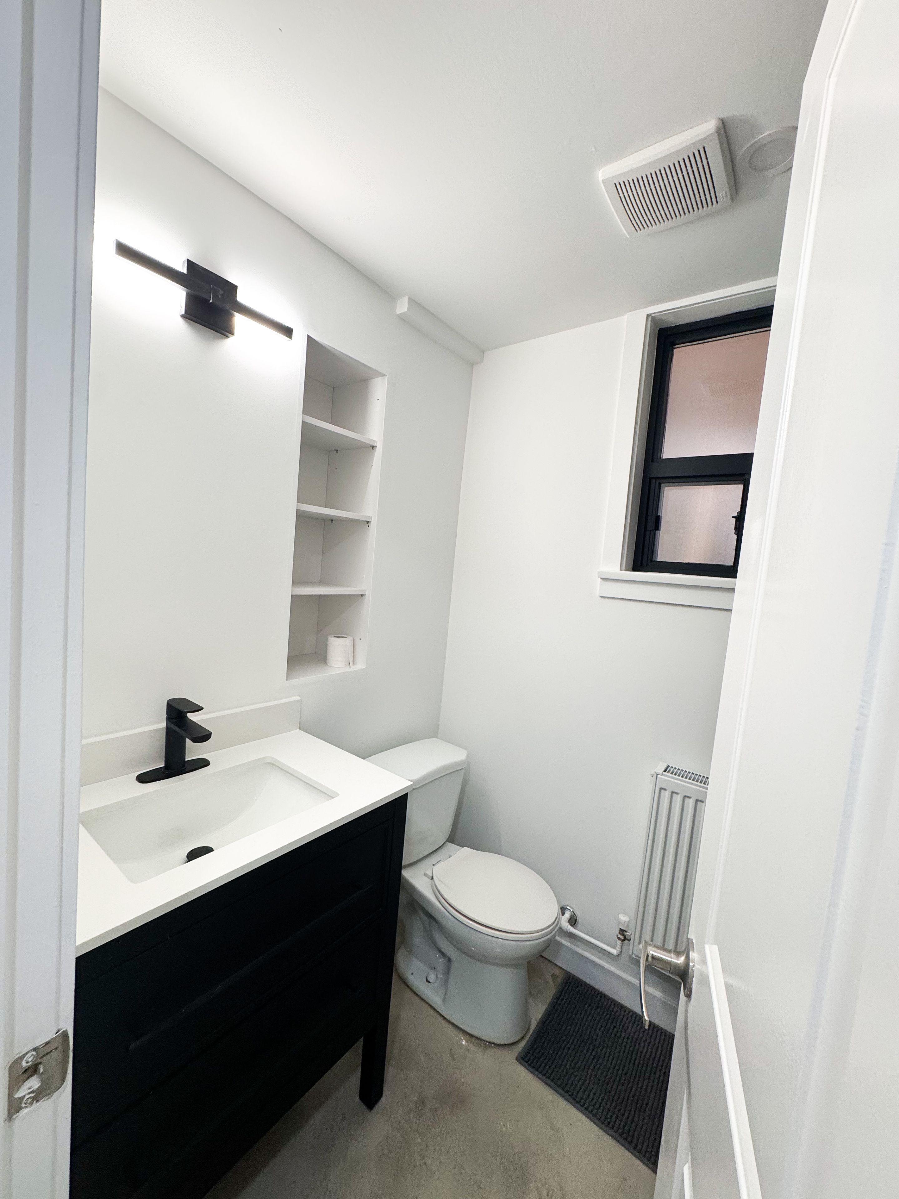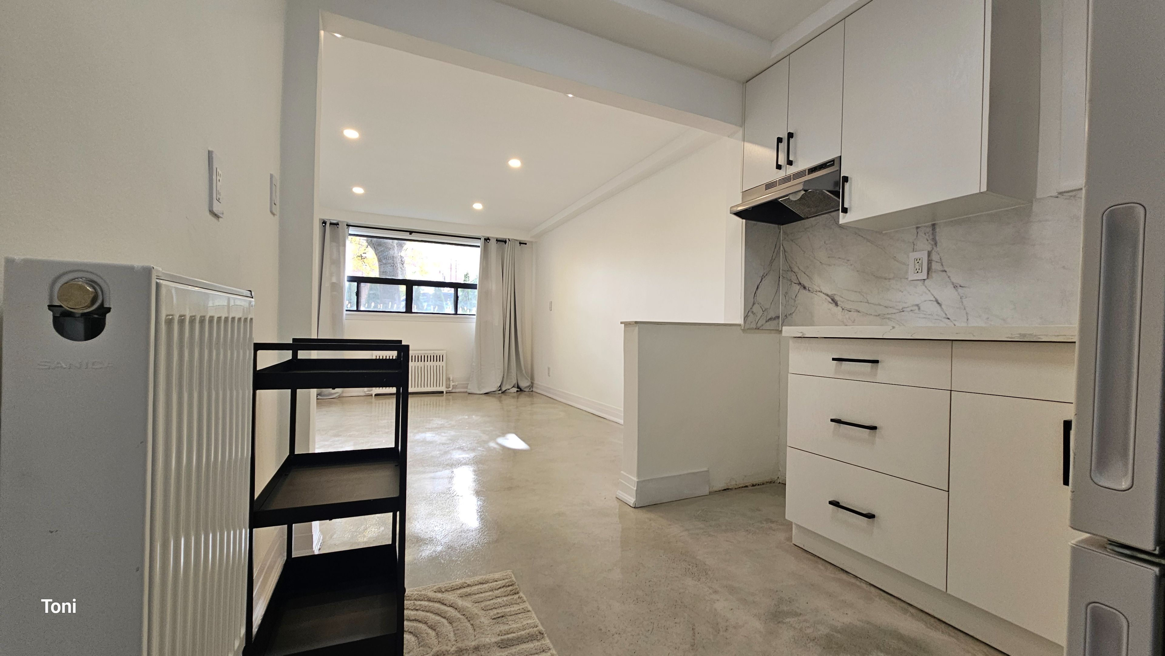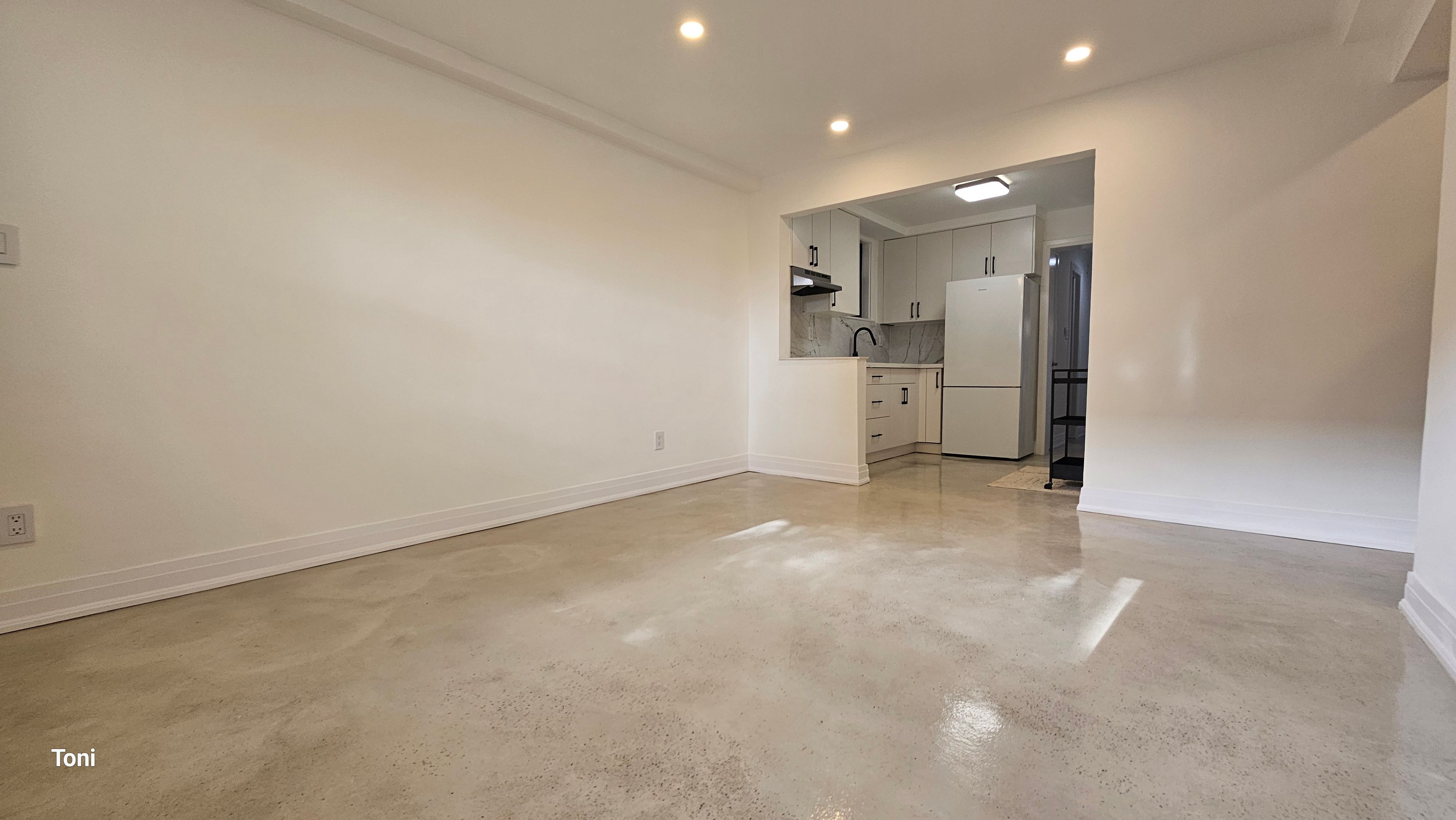 This fully renovated 2-bedroom apartment exudes quality and style. It features insulated floors finished in polished concrete and is almost above ground, allowing for large windows that provide plenty of natural light. The spacious open-concept living and dining area boasts high ceilings and pot lights, creating a perfect atmosphere for entertaining, while overlooking a modern kitchen with quartz countertops. The apartment includes an ultra-modern three-piece bathroom with a glass shower and two large bedrooms, each equipped with a closet. Common laundry facilities are conveniently located on the same level.